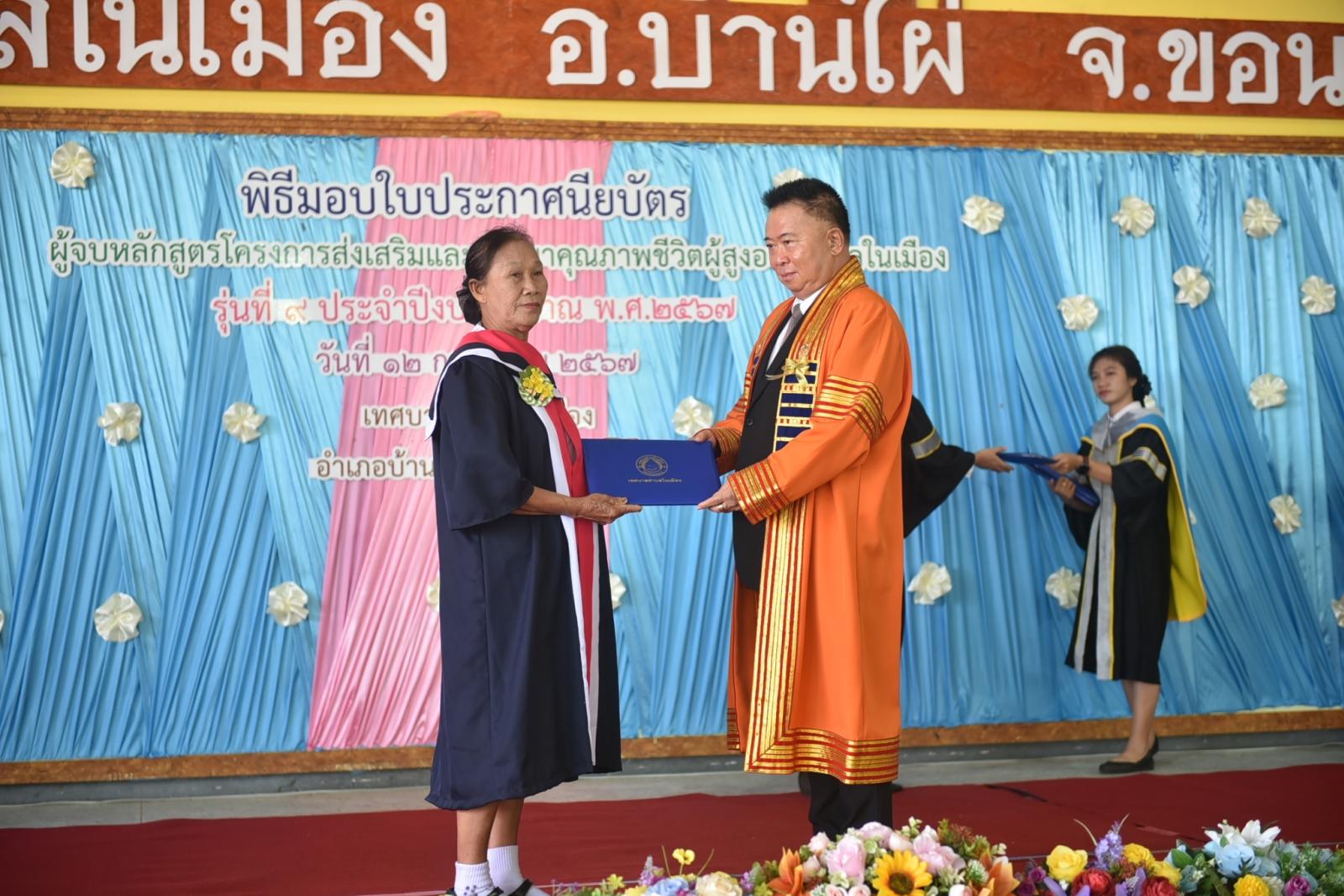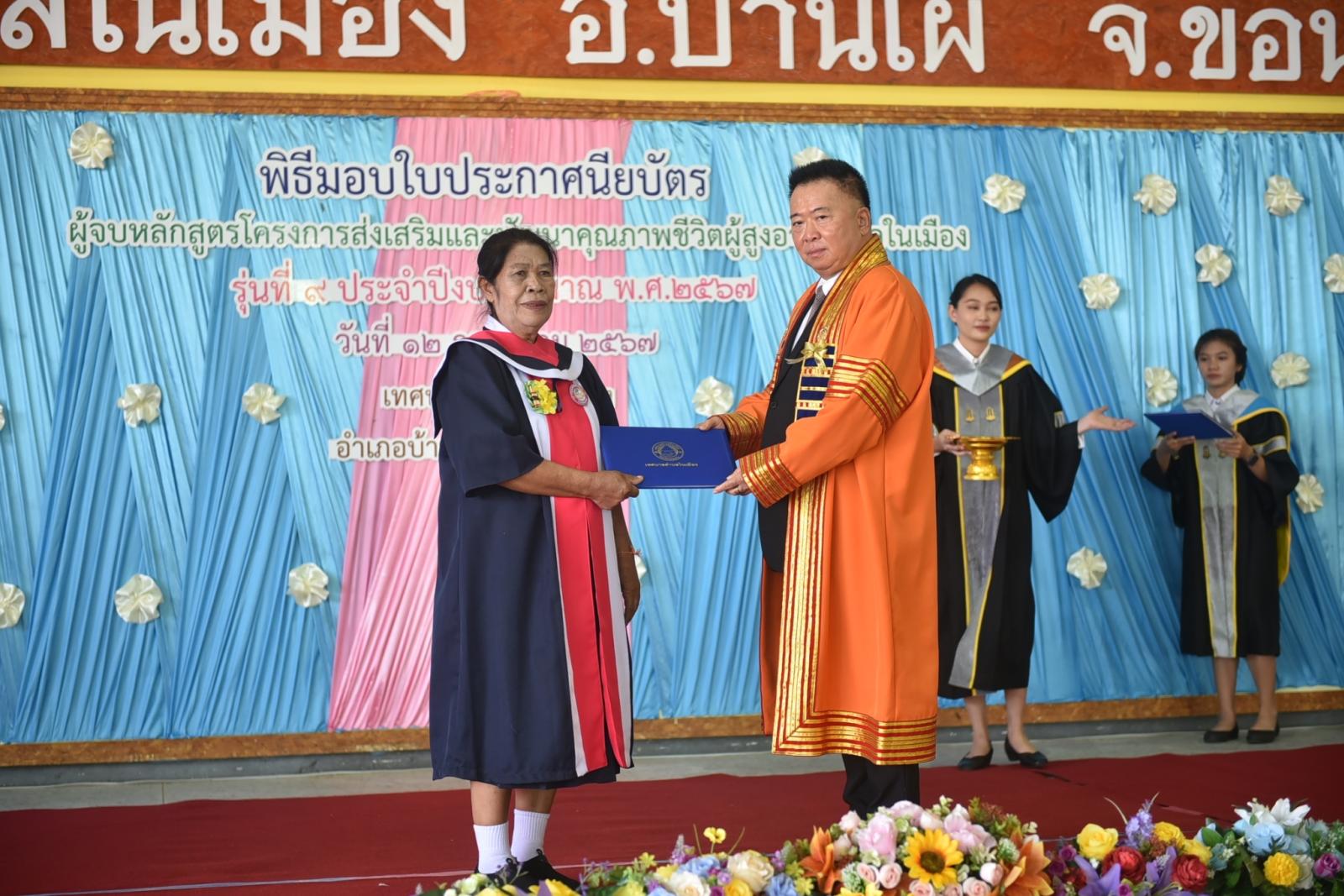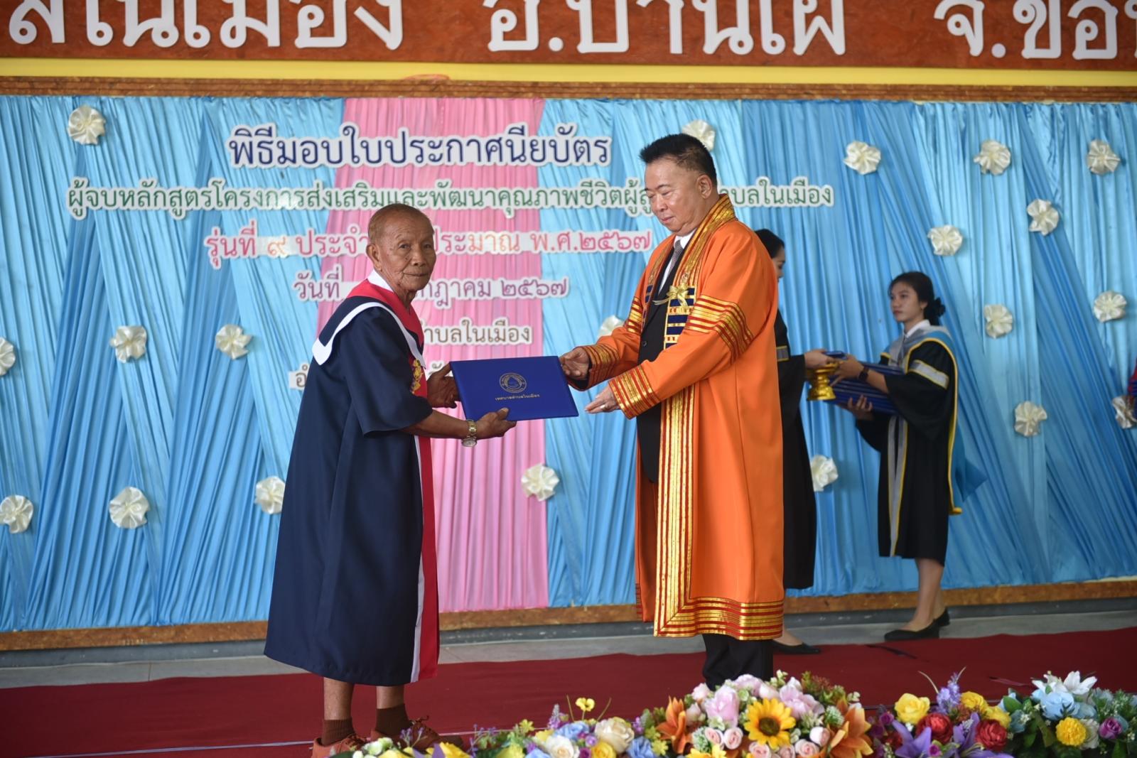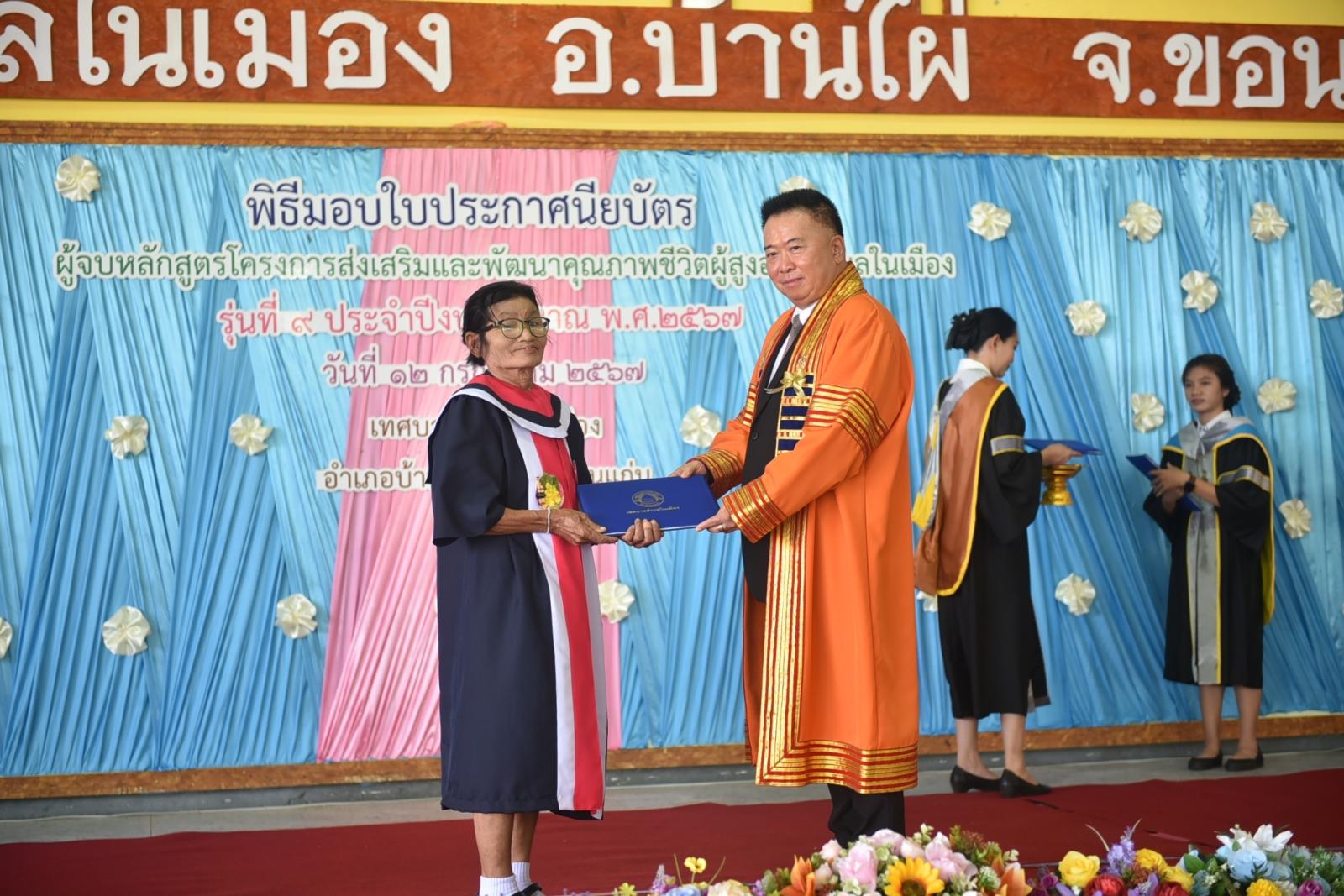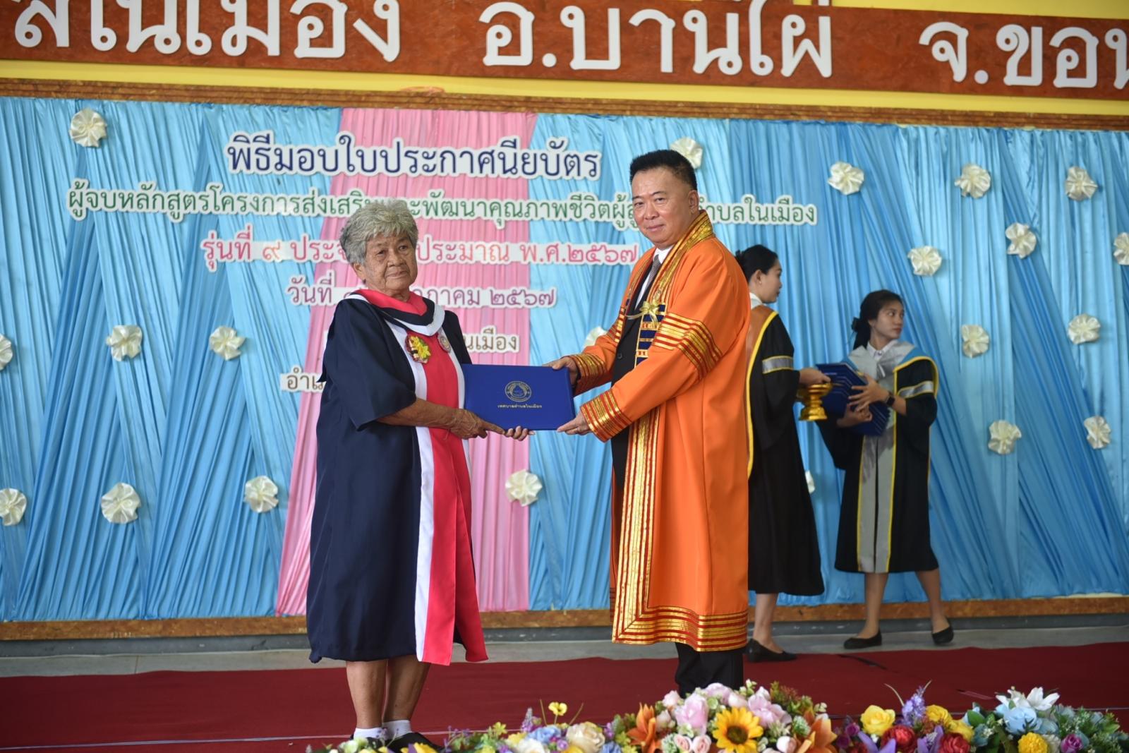 พิธีมอบประกาศนียบัตรให้แก่ผู้สูงอายุที่จบหลักสูตร ตามโครงการส่งเสริมและพัฒนาคุณภาพชีวิตผู้สูงอายุตำบลในเมือง รุ่นที่9 ประจำปีงบประมาณ 2567