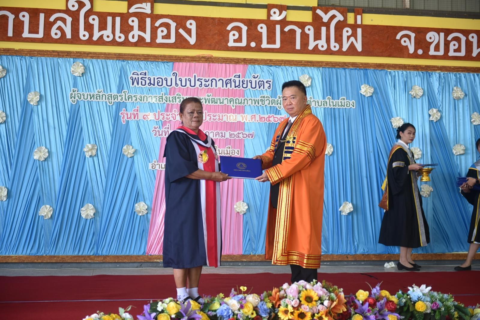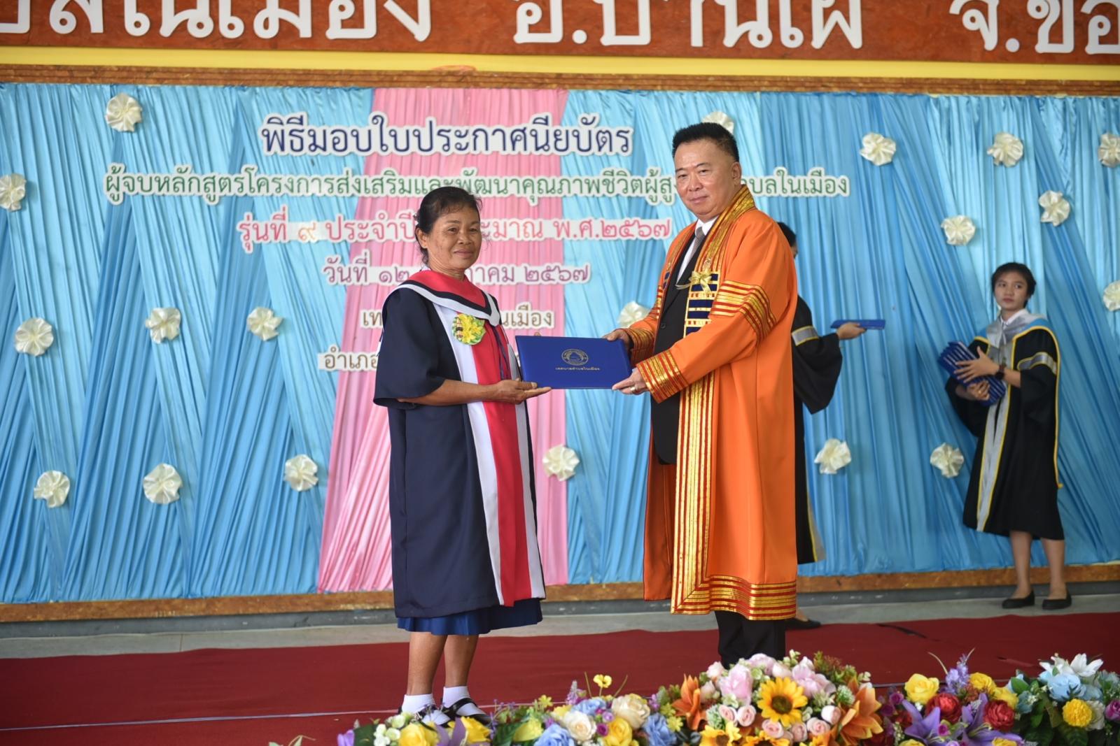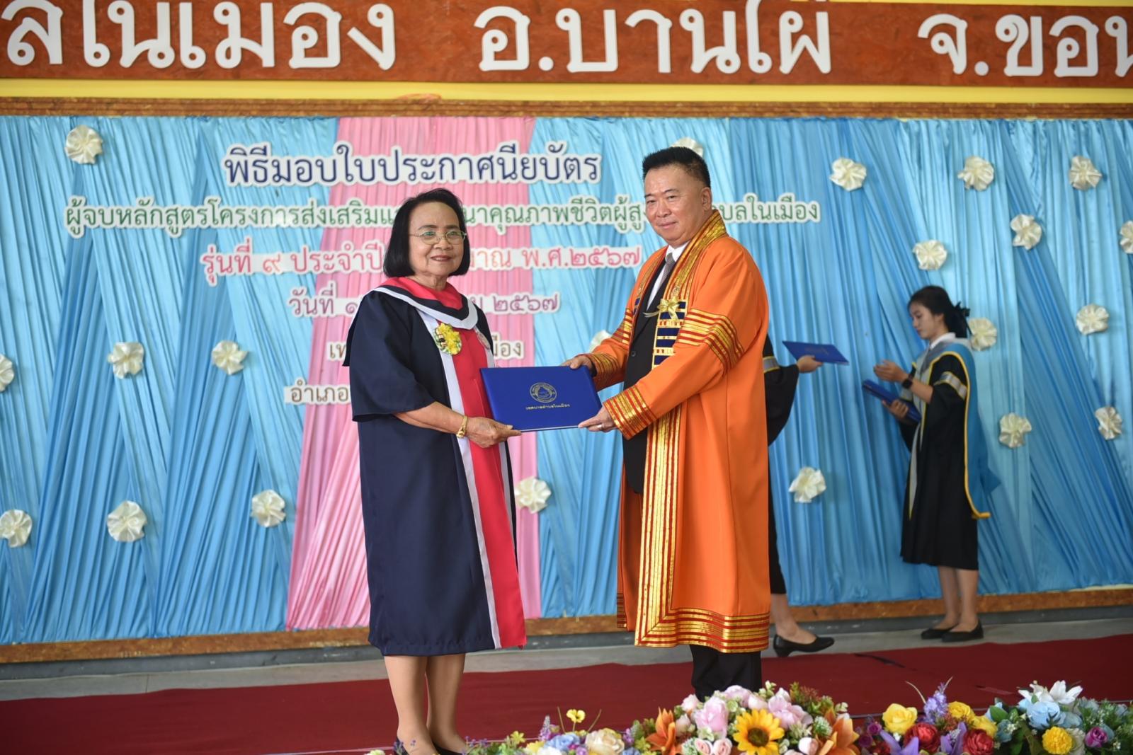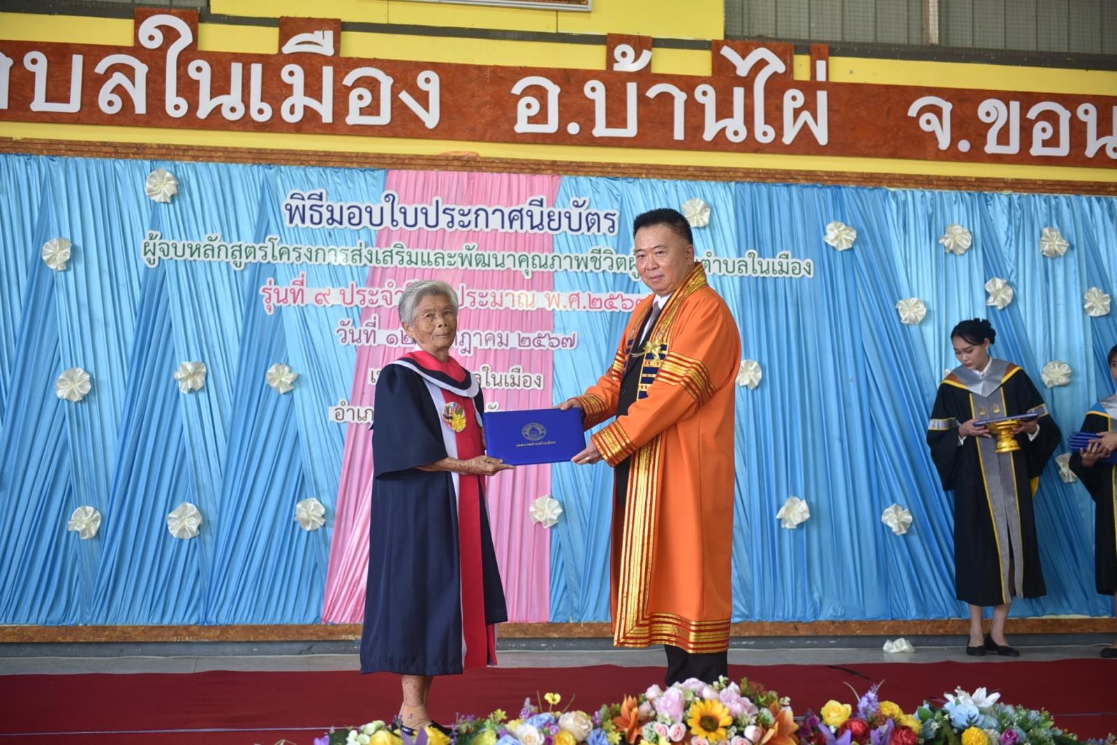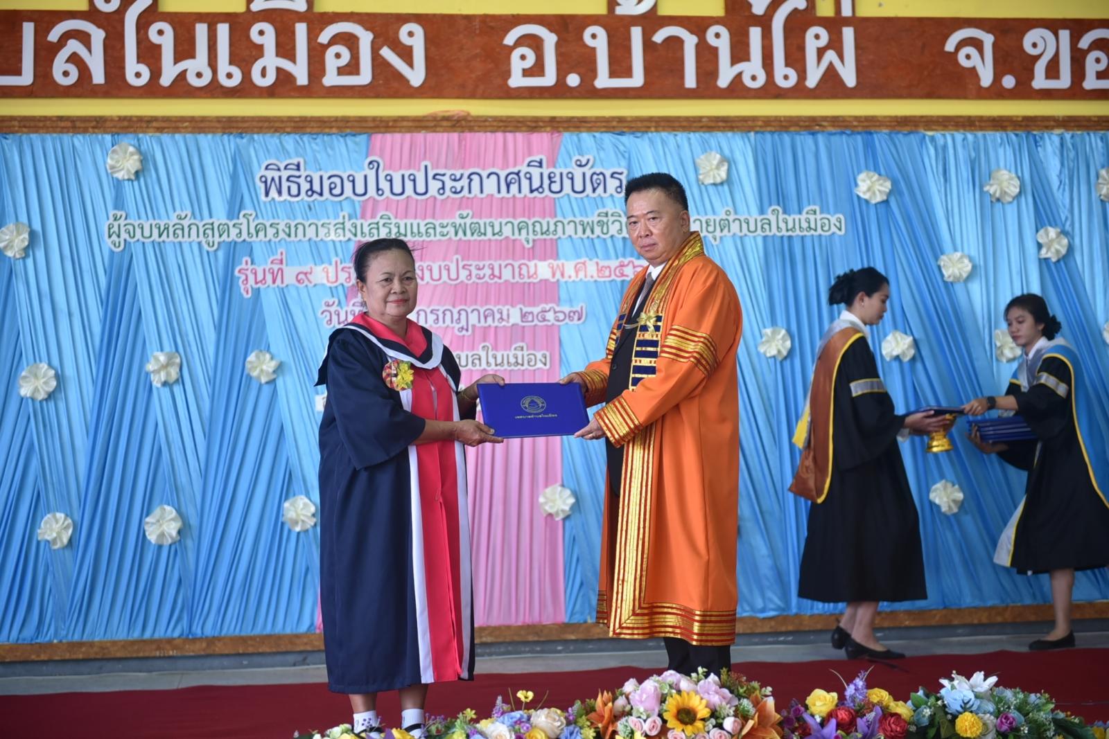 พิธีมอบประกาศนียบัตรให้แก่ผู้สูงอายุที่จบหลักสูตร ตามโครงการส่งเสริมและพัฒนาคุณภาพชีวิตผู้สูงอายุตำบลในเมือง รุ่นที่9 ประจำปีงบประมาณ 2567