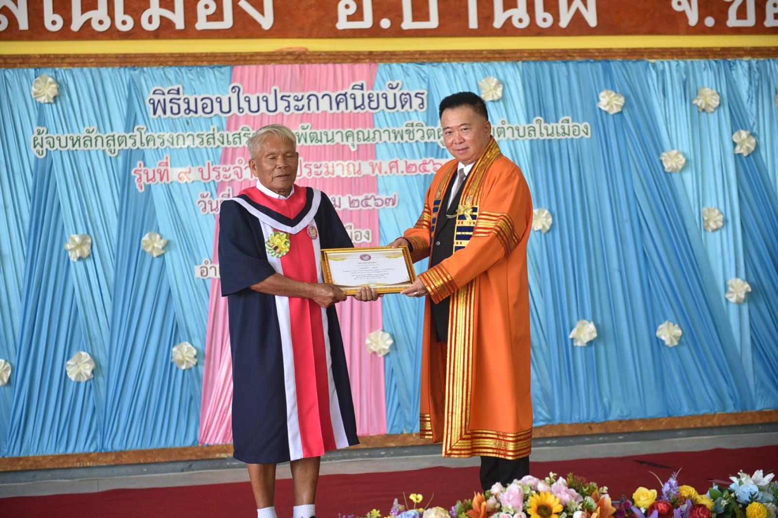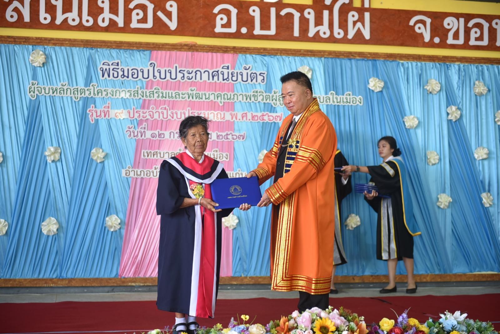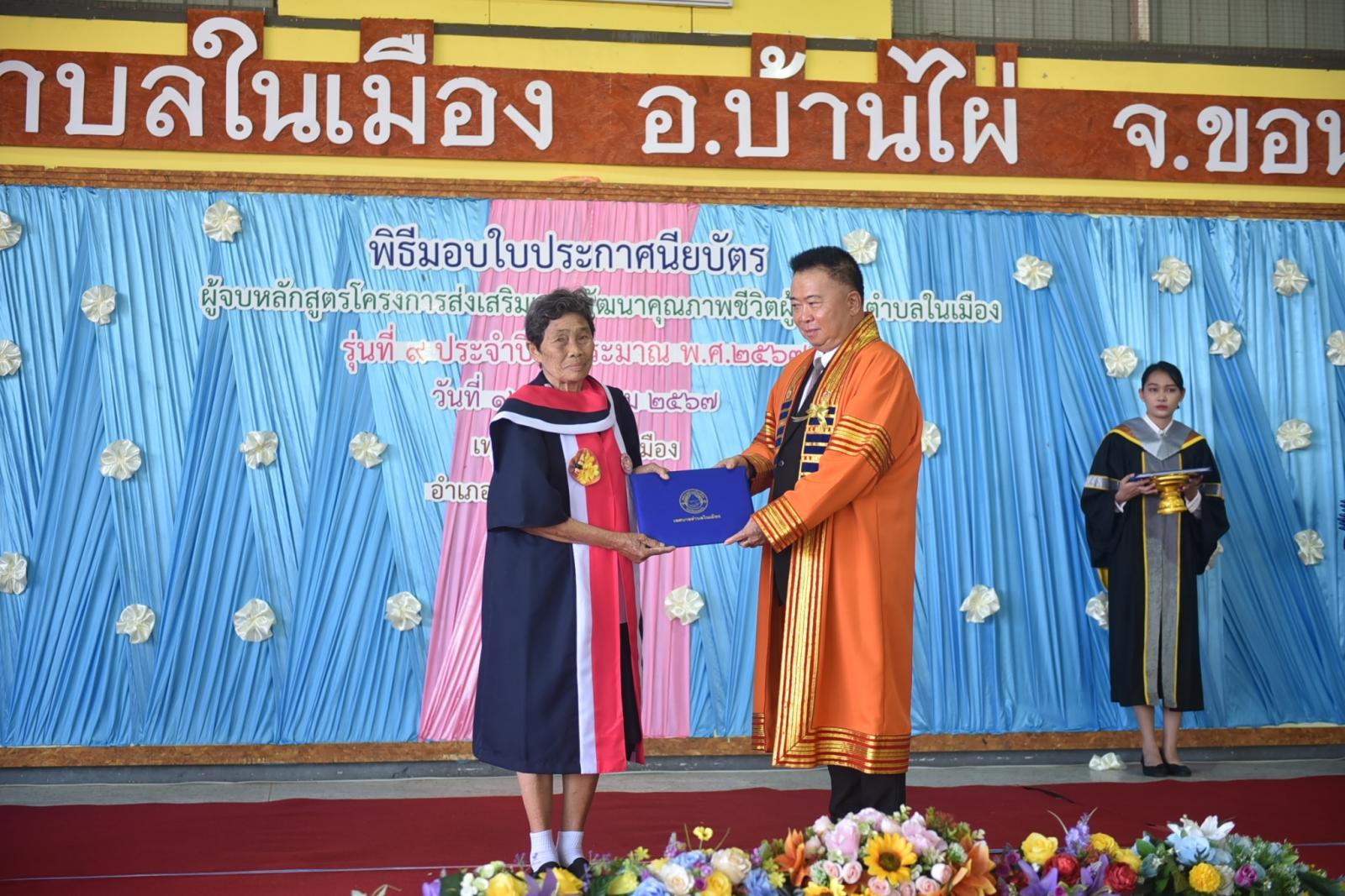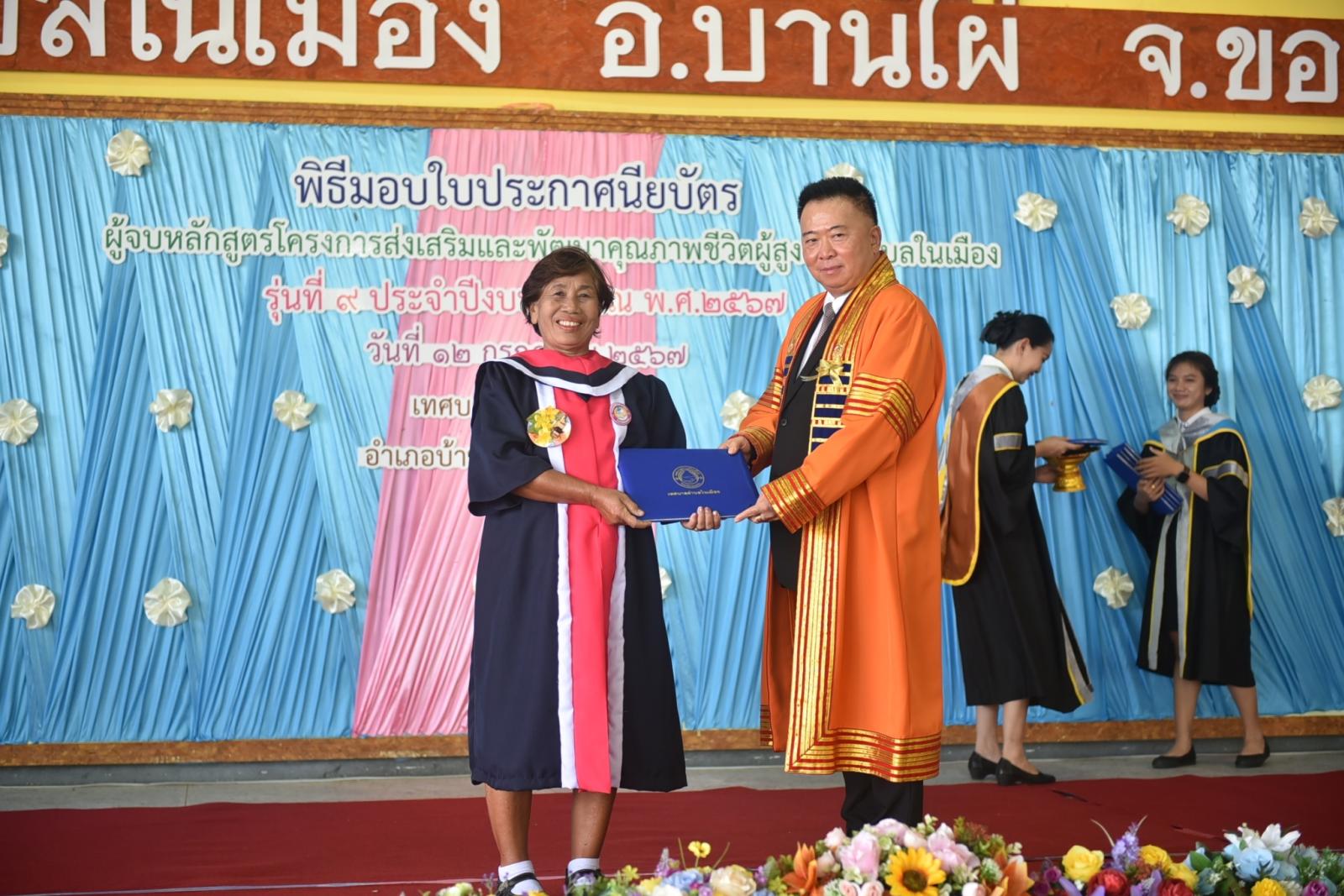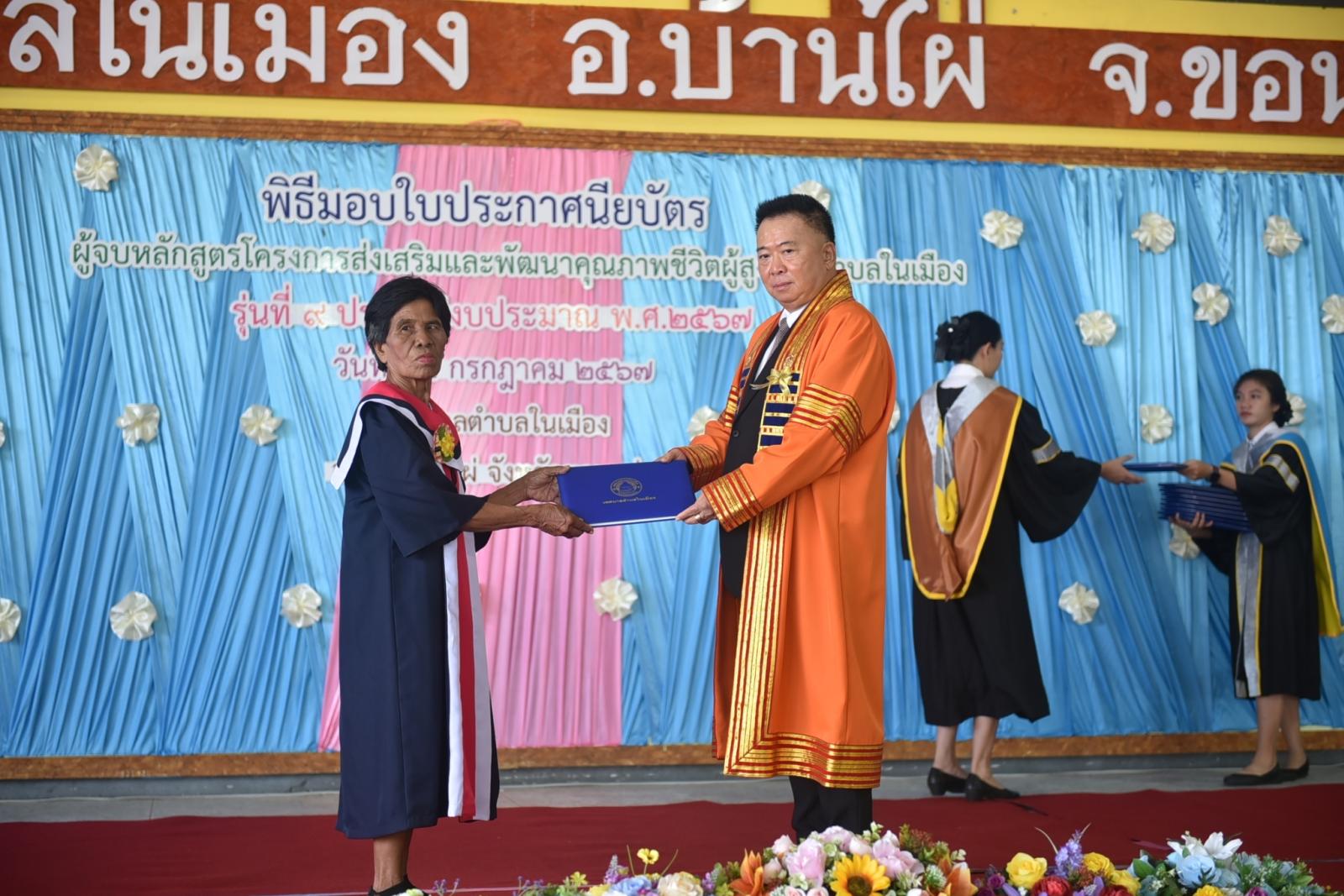 พิธีมอบประกาศนียบัตรให้แก่ผู้สูงอายุที่จบหลักสูตร ตามโครงการส่งเสริมและพัฒนาคุณภาพชีวิตผู้สูงอายุตำบลในเมือง รุ่นที่9 ประจำปีงบประมาณ 2567