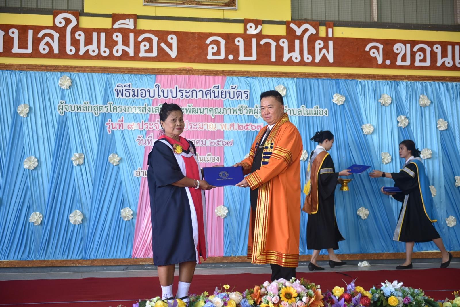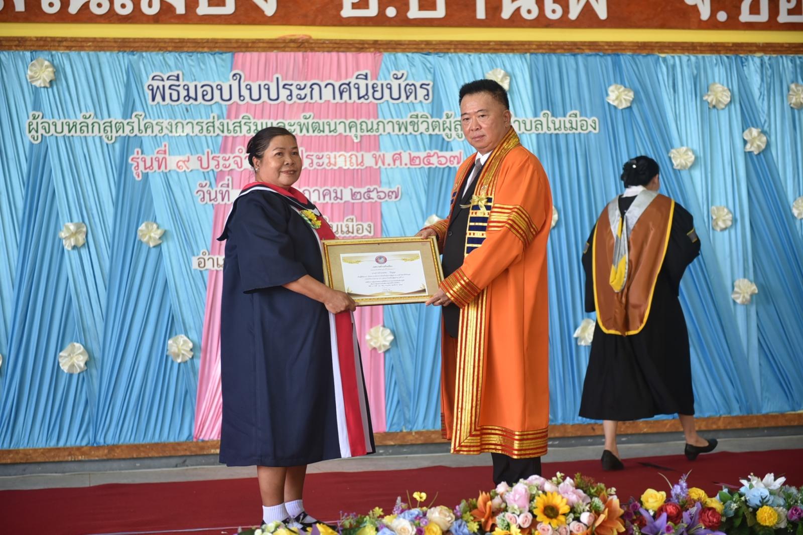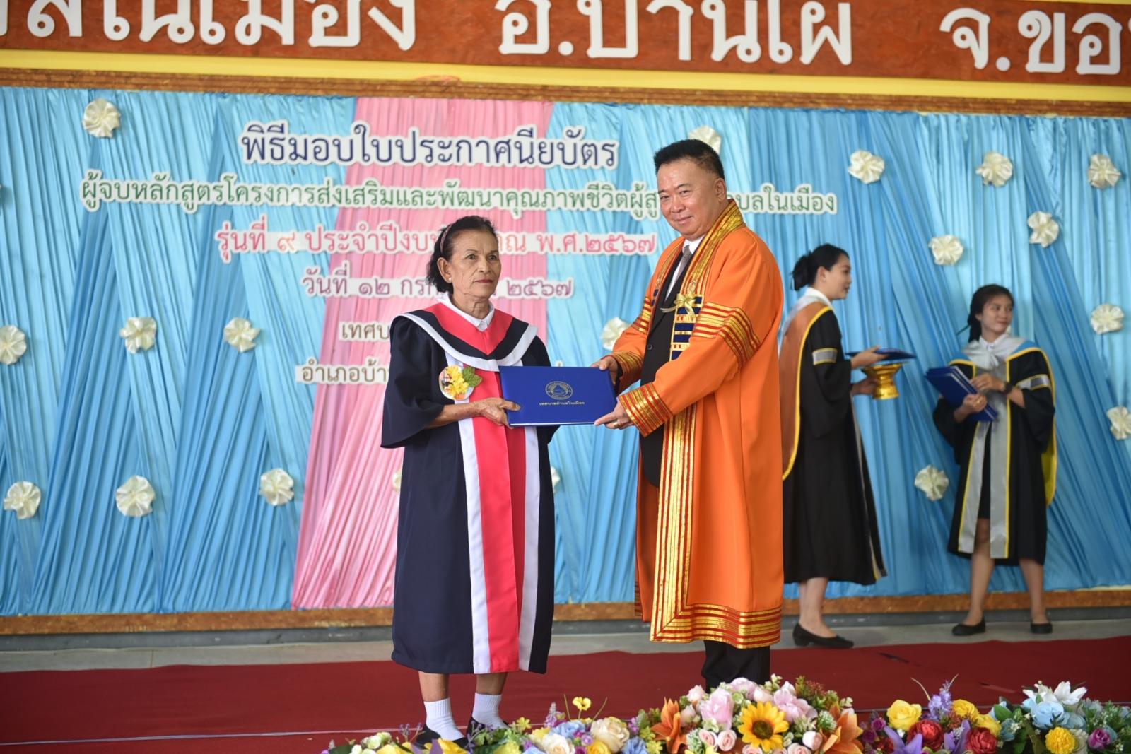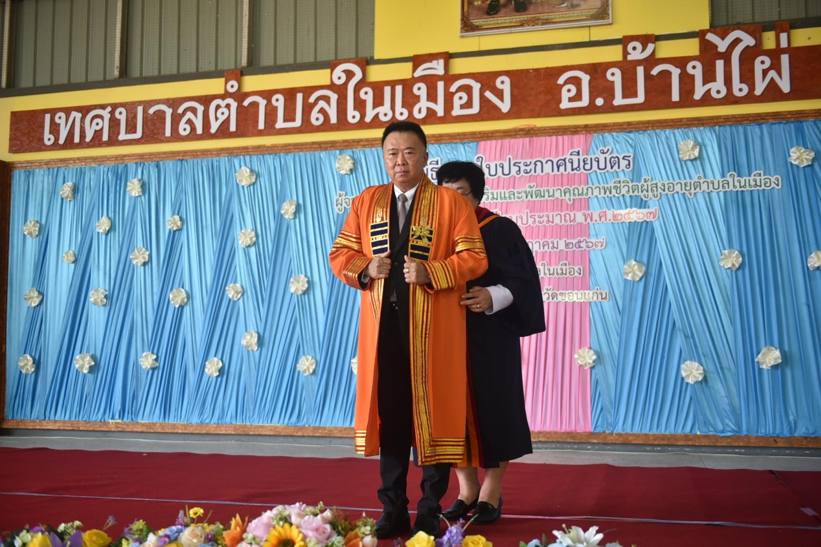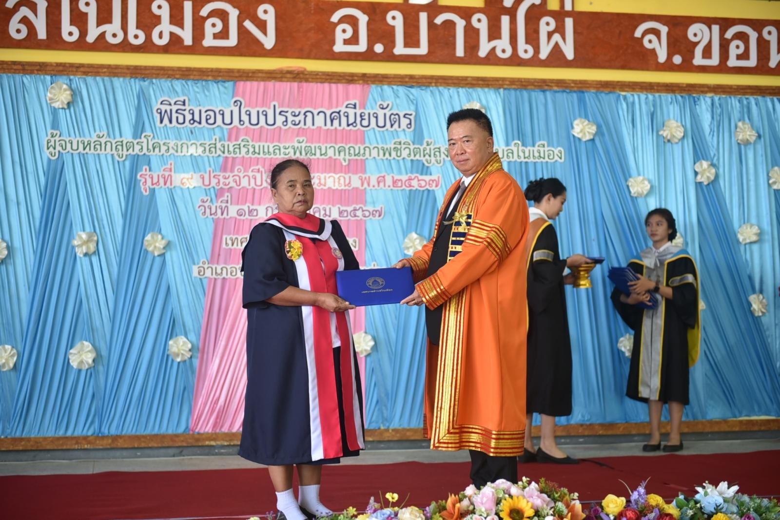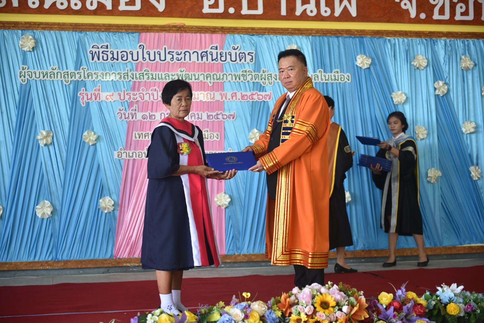 พิธีมอบประกาศนียบัตรให้แก่ผู้สูงอายุที่จบหลักสูตร ตามโครงการส่งเสริมและพัฒนาคุณภาพชีวิตผู้สูงอายุตำบลในเมือง รุ่นที่9 ประจำปีงบประมาณ 2567