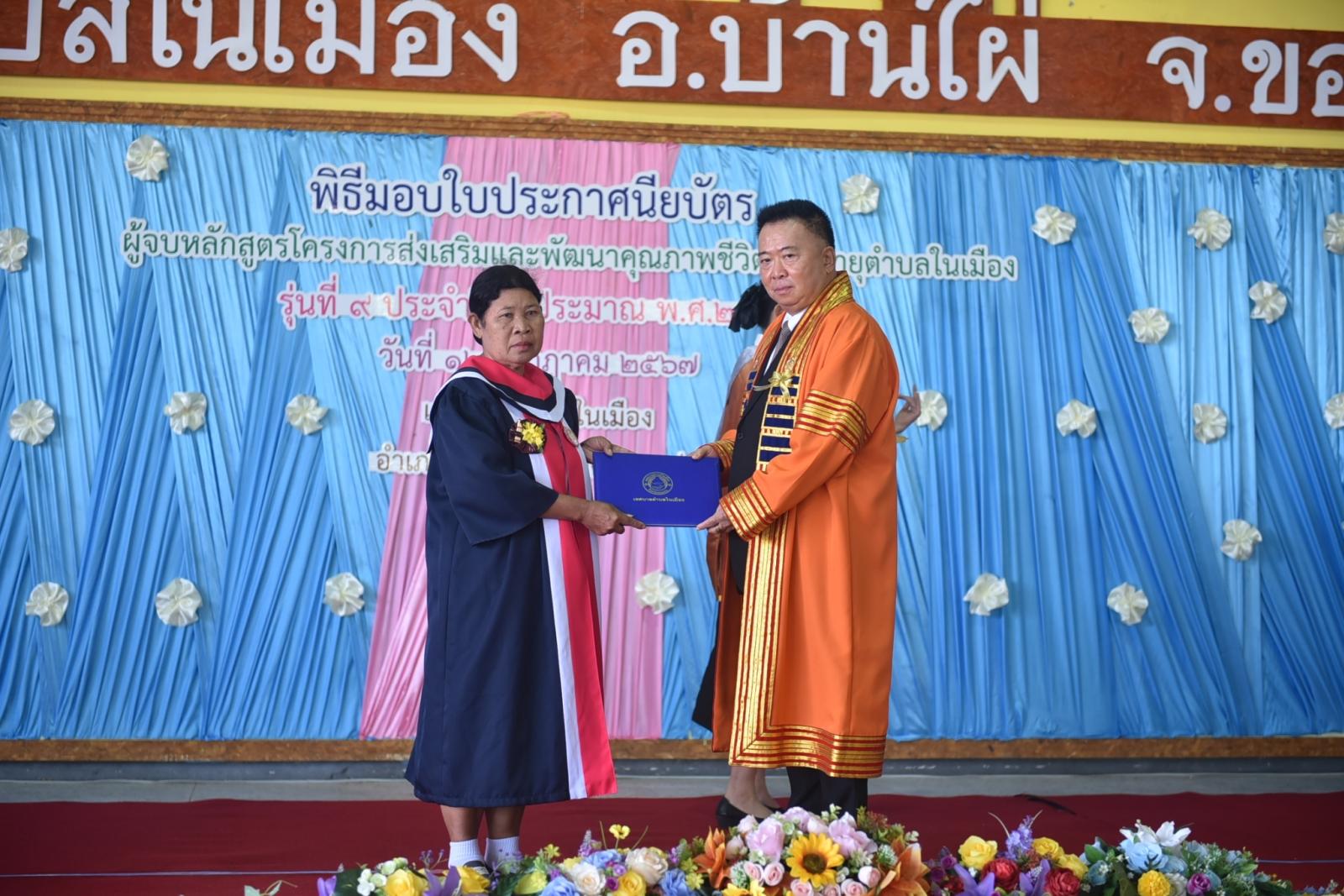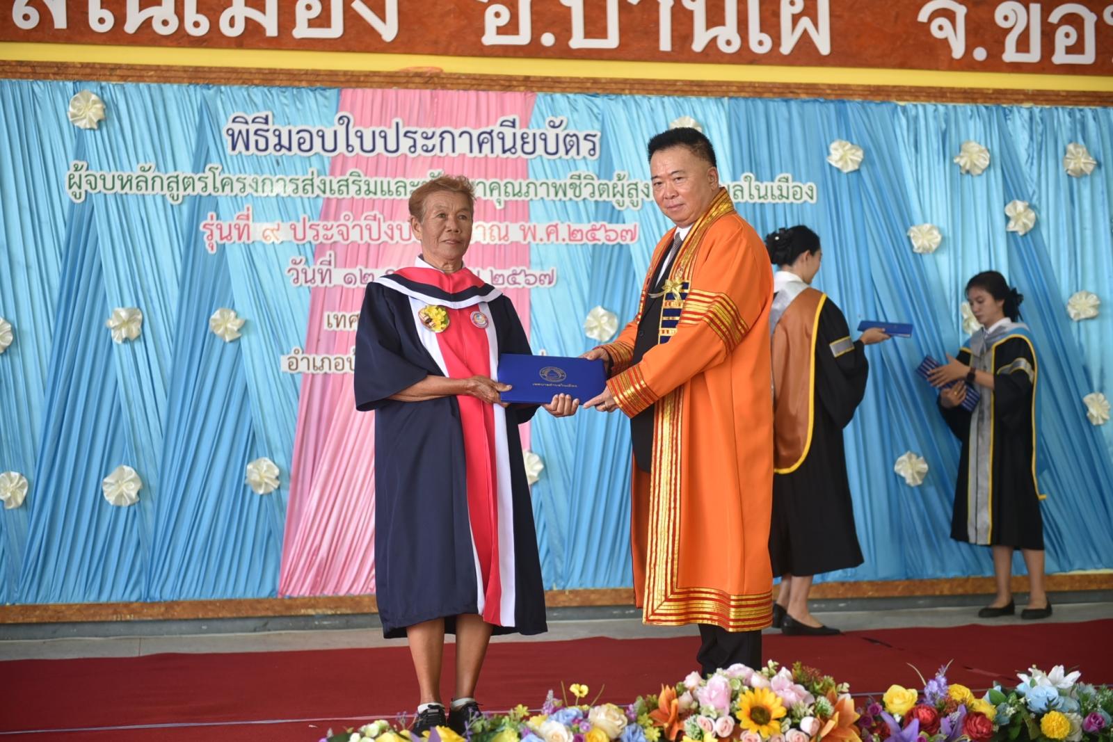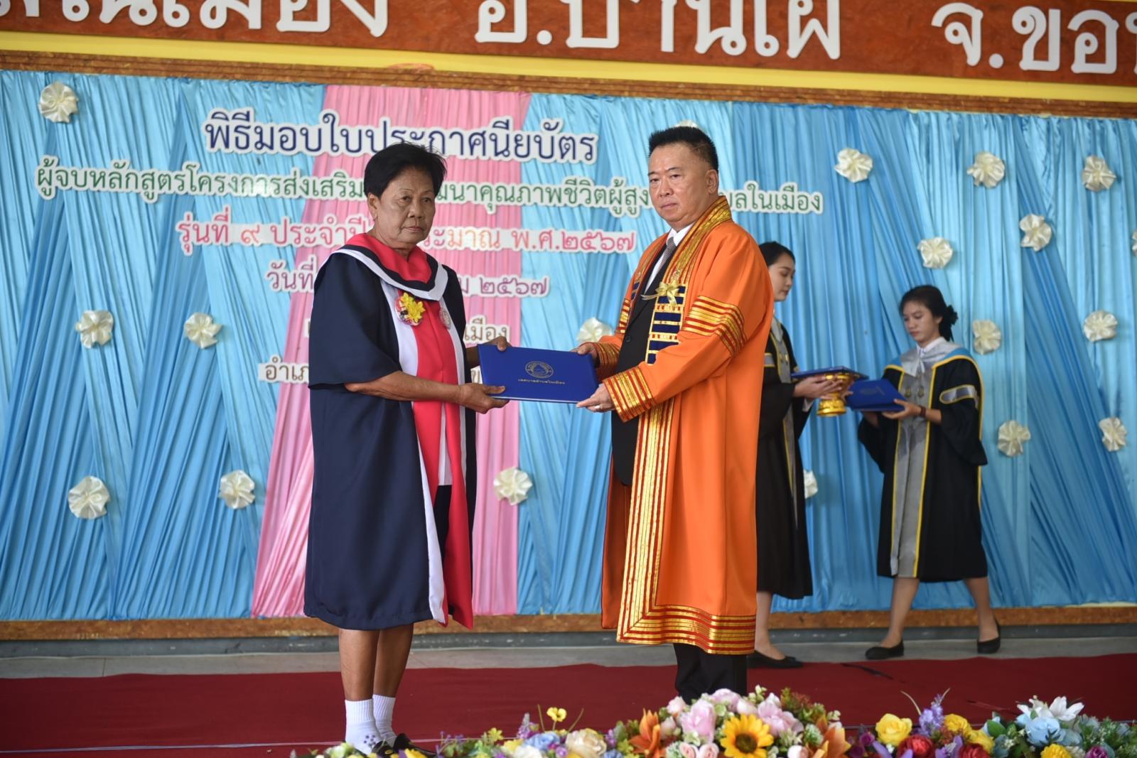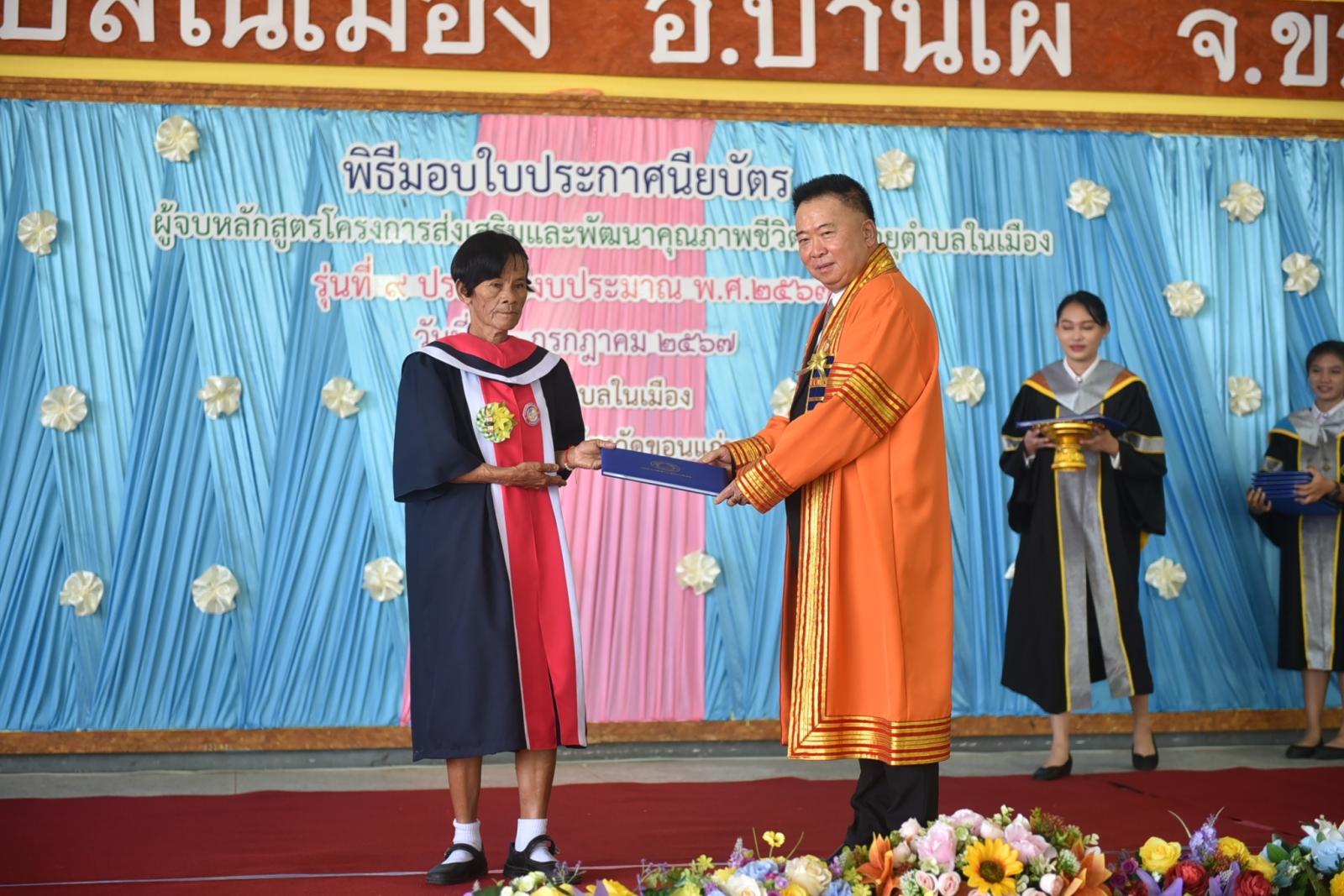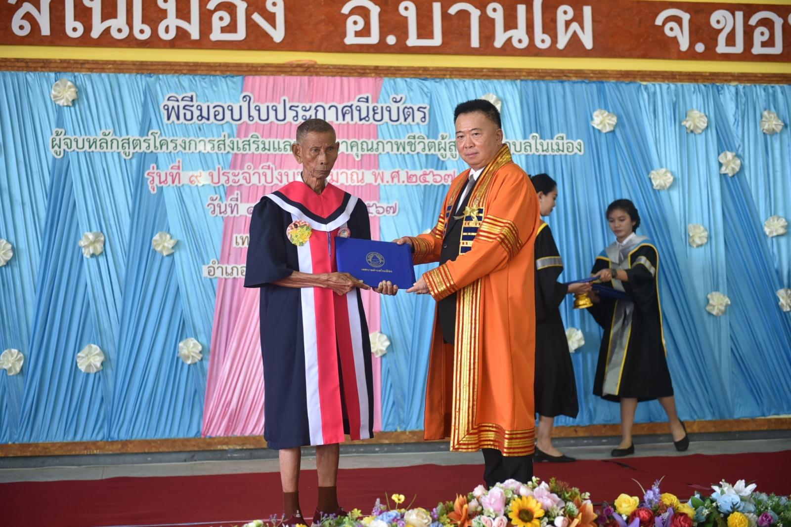 พิธีมอบประกาศนียบัตรให้แก่ผู้สูงอายุที่จบหลักสูตร ตามโครงการส่งเสริมและพัฒนาคุณภาพชีวิตผู้สูงอายุตำบลในเมือง รุ่นที่9 ประจำปีงบประมาณ 2567
