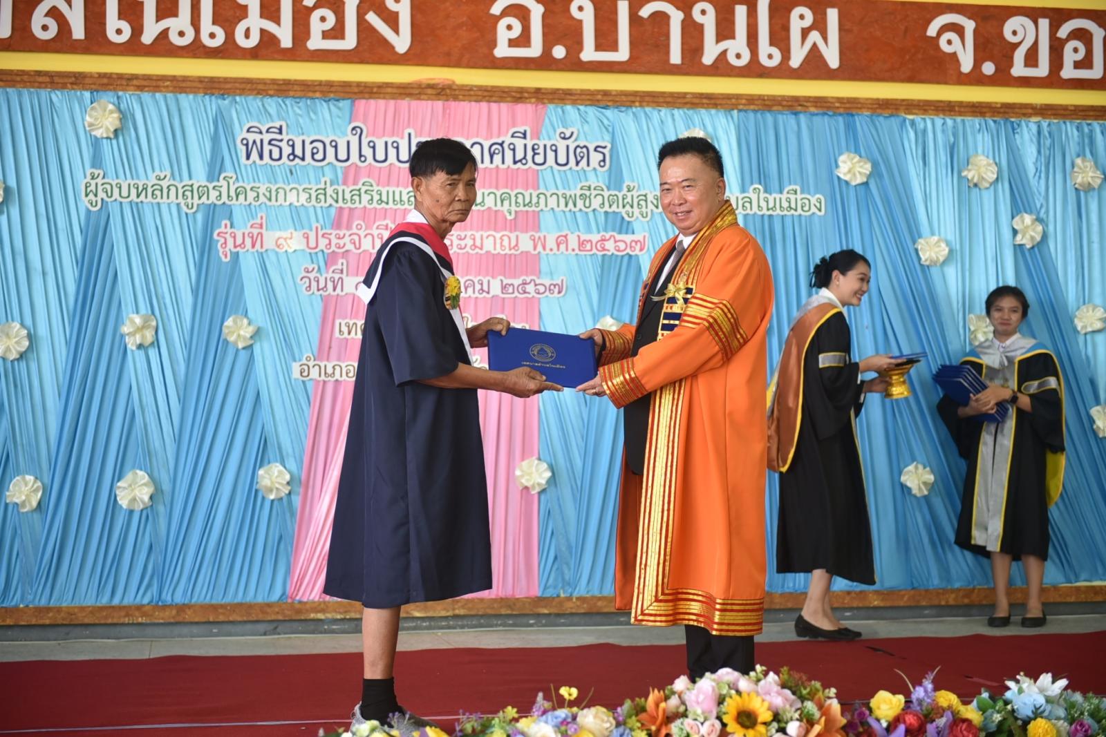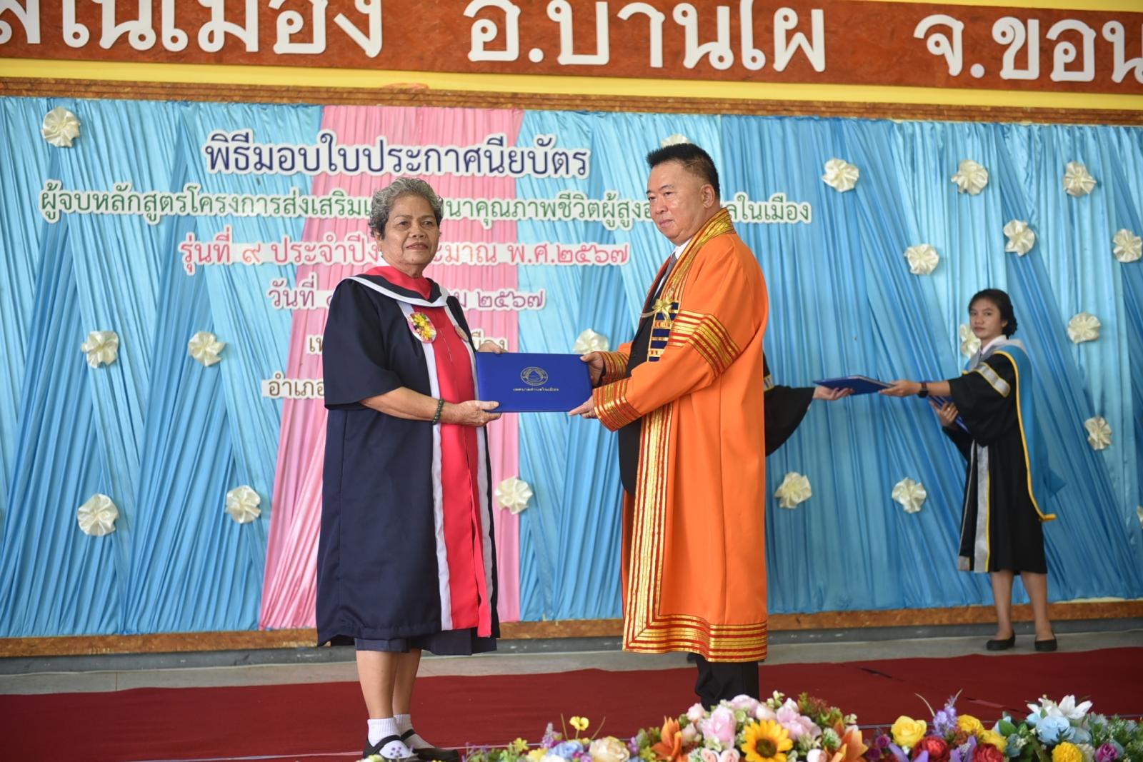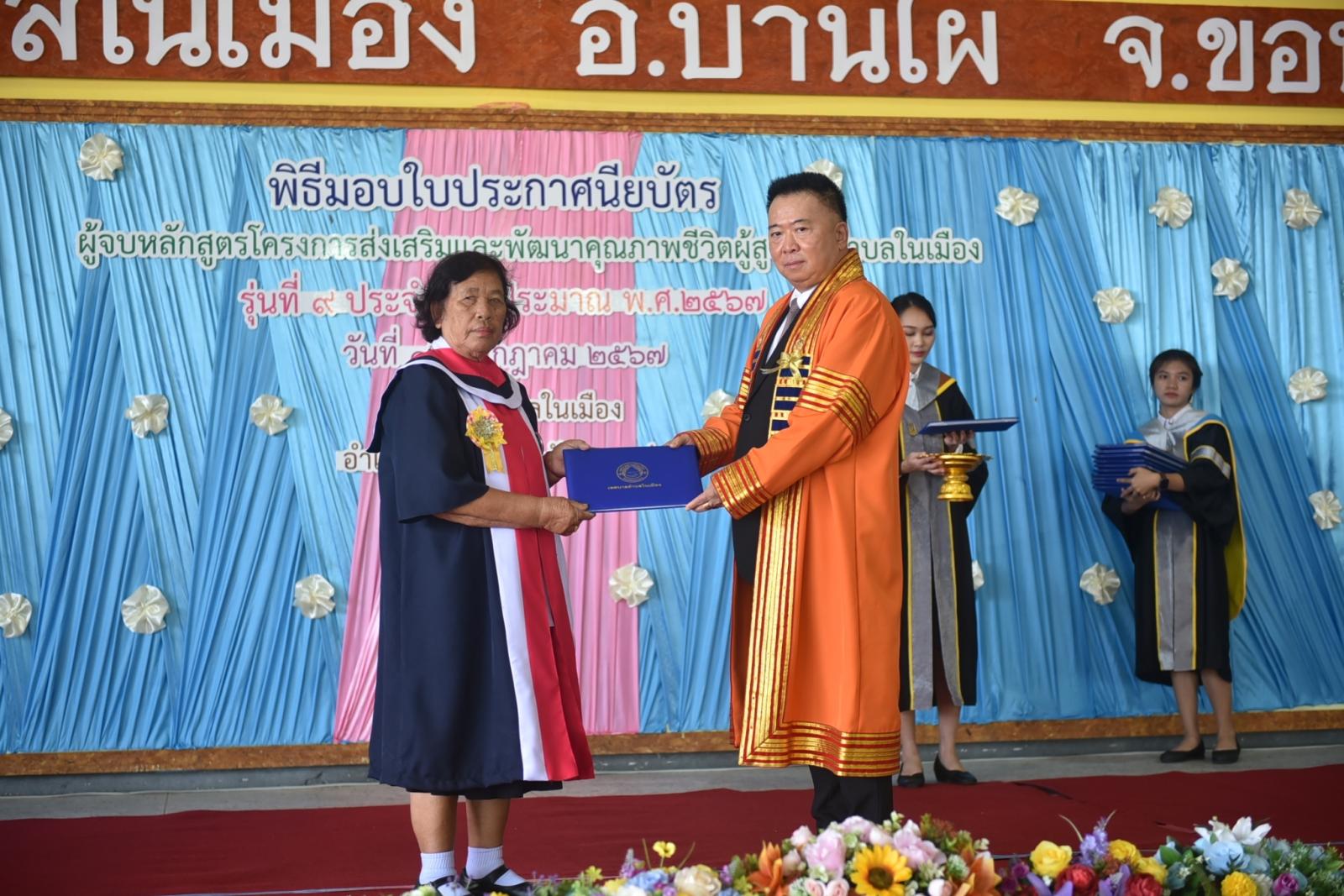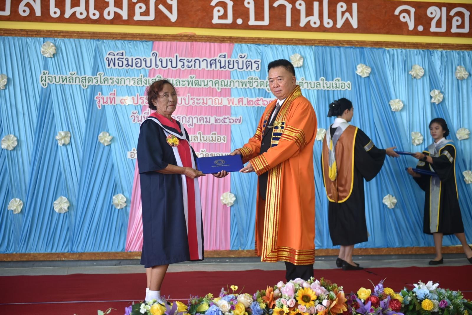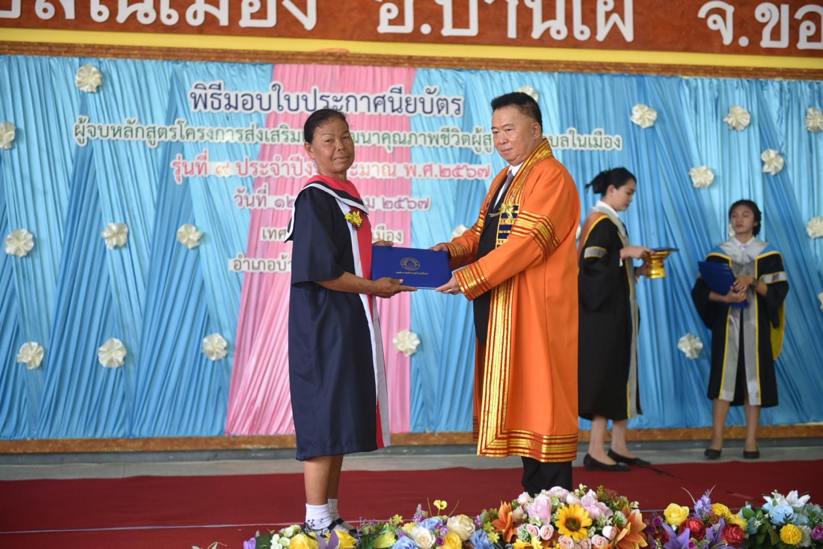 พิธีมอบประกาศนียบัตรให้แก่ผู้สูงอายุที่จบหลักสูตร ตามโครงการส่งเสริมและพัฒนาคุณภาพชีวิตผู้สูงอายุตำบลในเมือง รุ่นที่9 ประจำปีงบประมาณ 2567