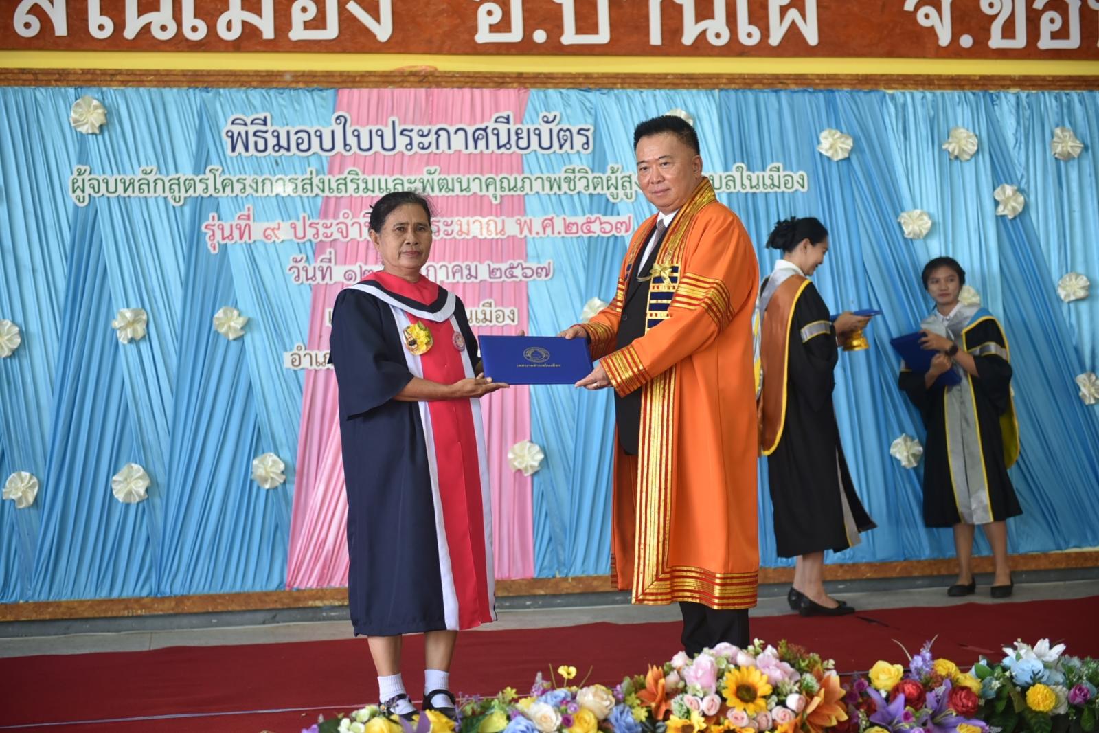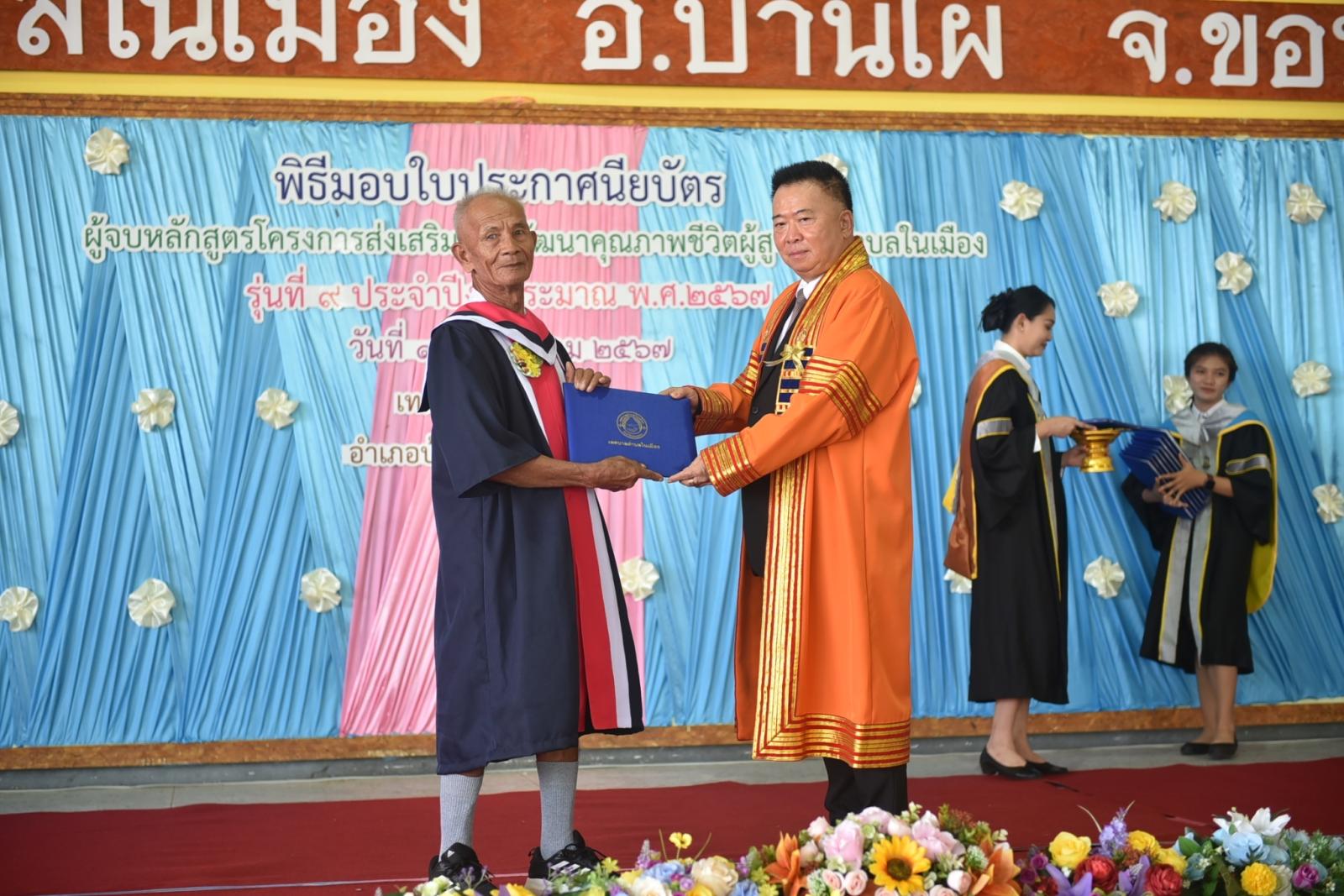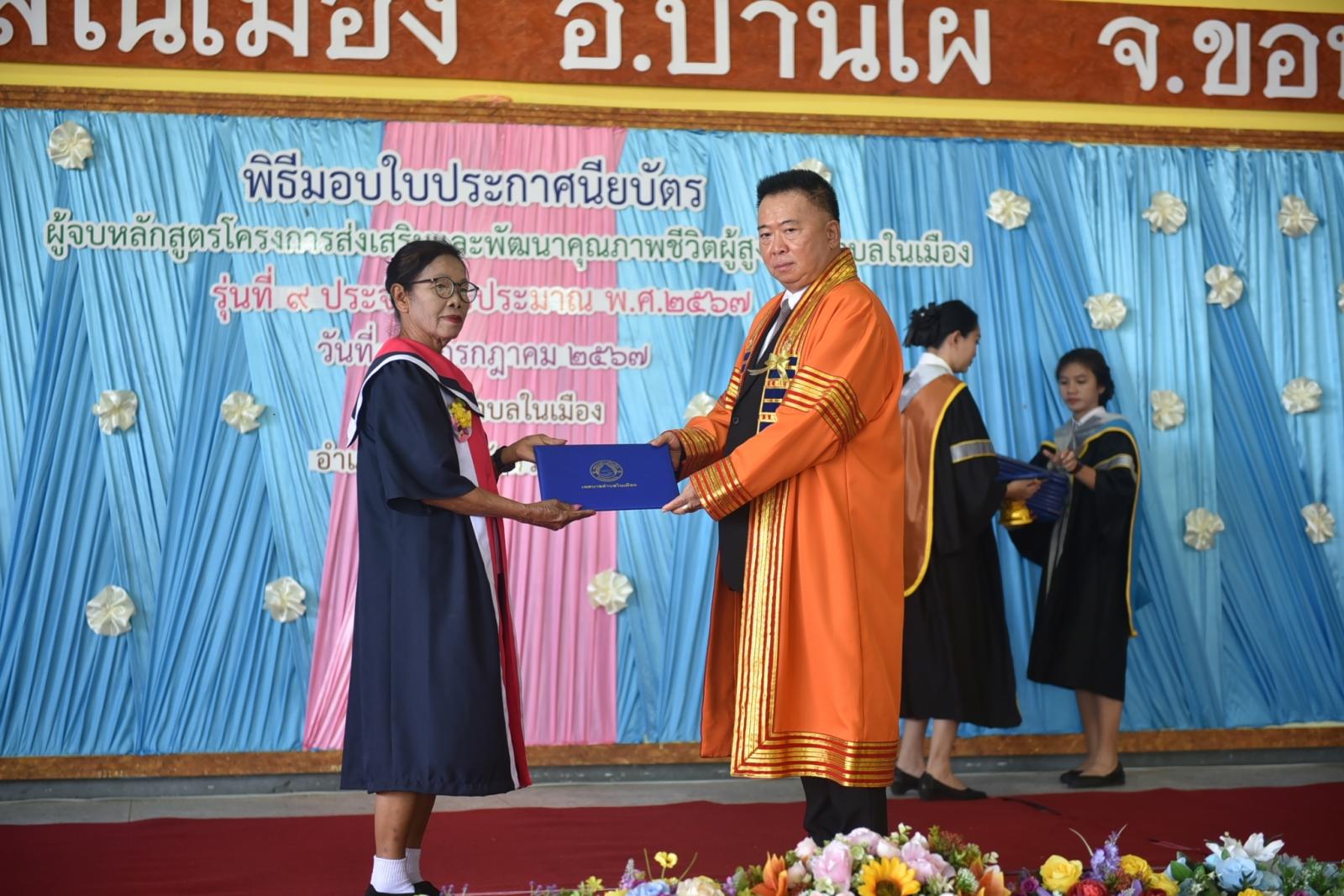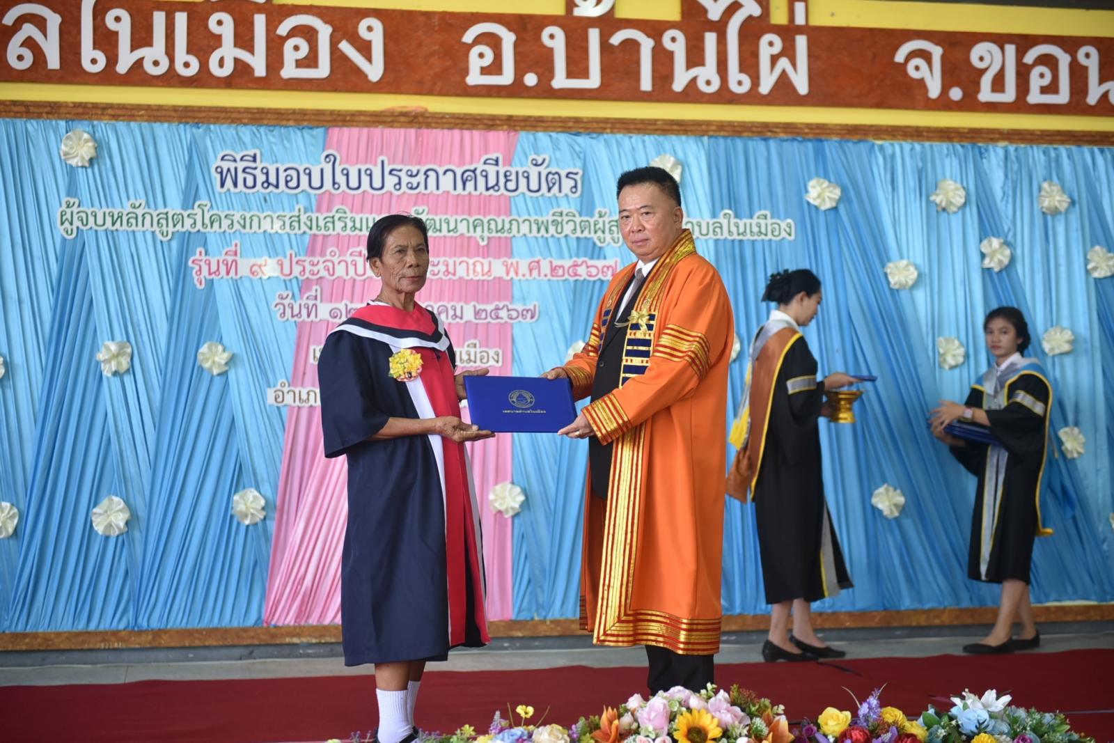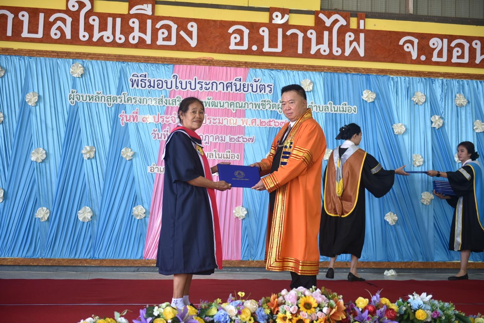 พิธีมอบประกาศนียบัตรให้แก่ผู้สูงอายุที่จบหลักสูตร ตามโครงการส่งเสริมและพัฒนาคุณภาพชีวิตผู้สูงอายุตำบลในเมือง รุ่นที่9 ประจำปีงบประมาณ 2567