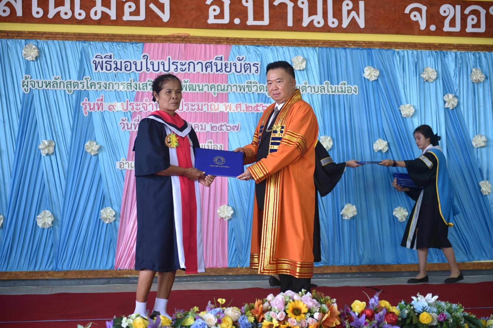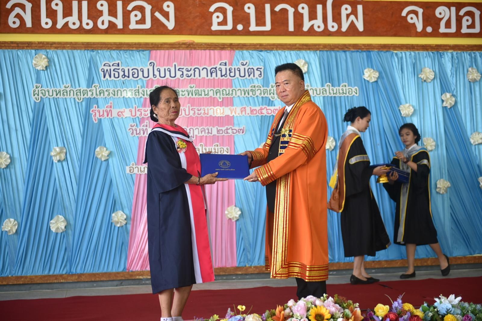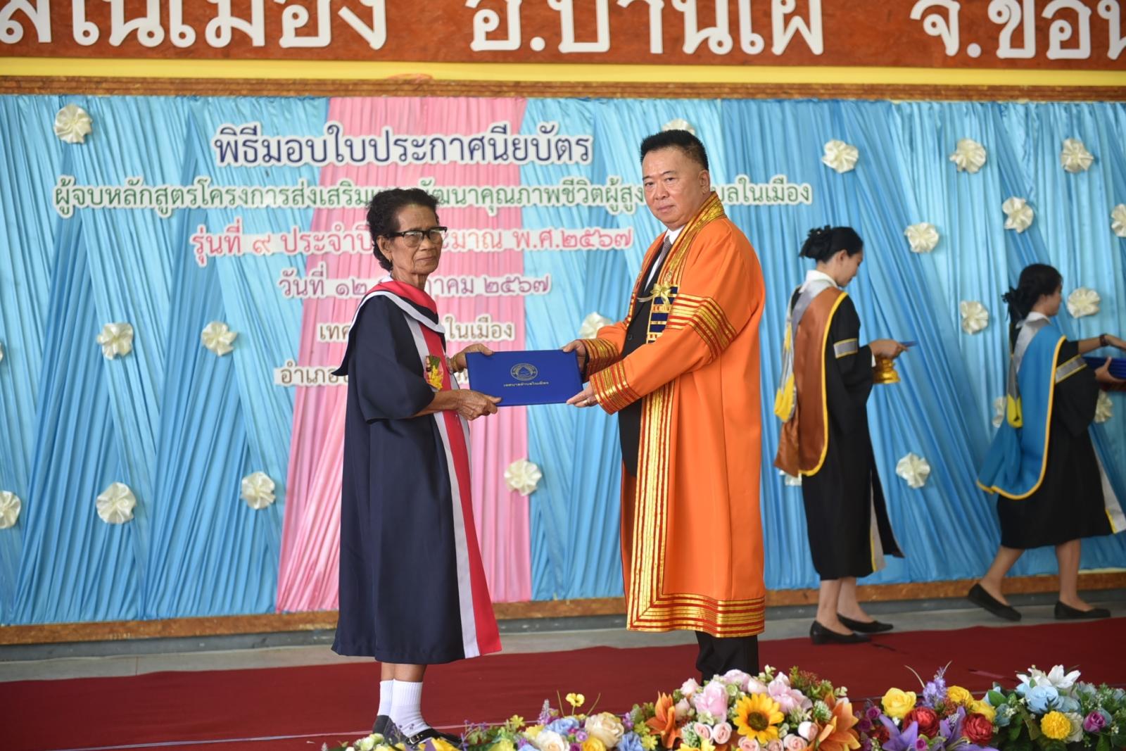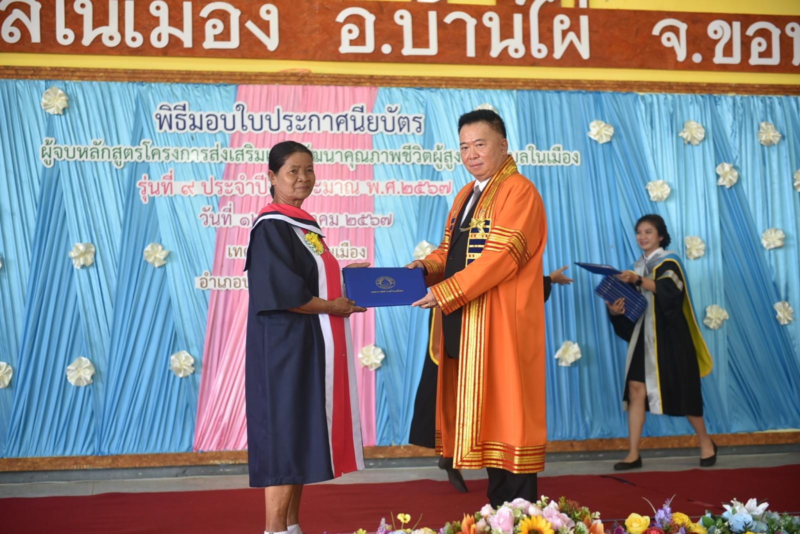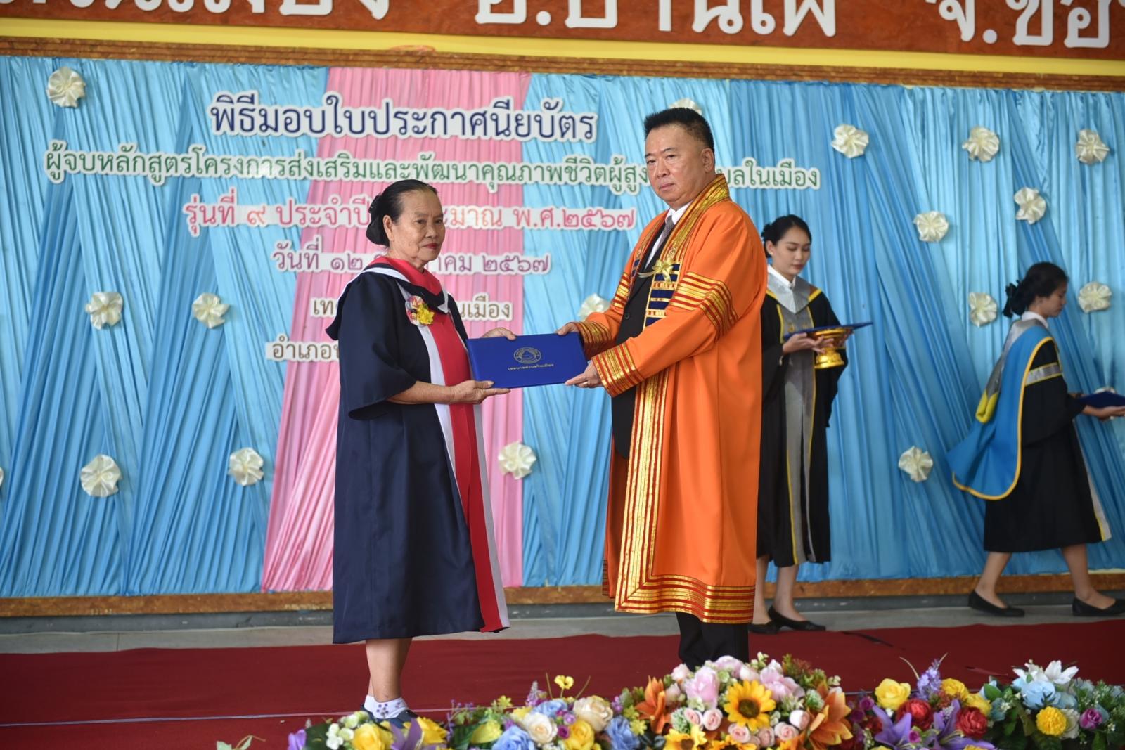 พิธีมอบประกาศนียบัตรให้แก่ผู้สูงอายุที่จบหลักสูตร ตามโครงการส่งเสริมและพัฒนาคุณภาพชีวิตผู้สูงอายุตำบลในเมือง รุ่นที่9 ประจำปีงบประมาณ 2567