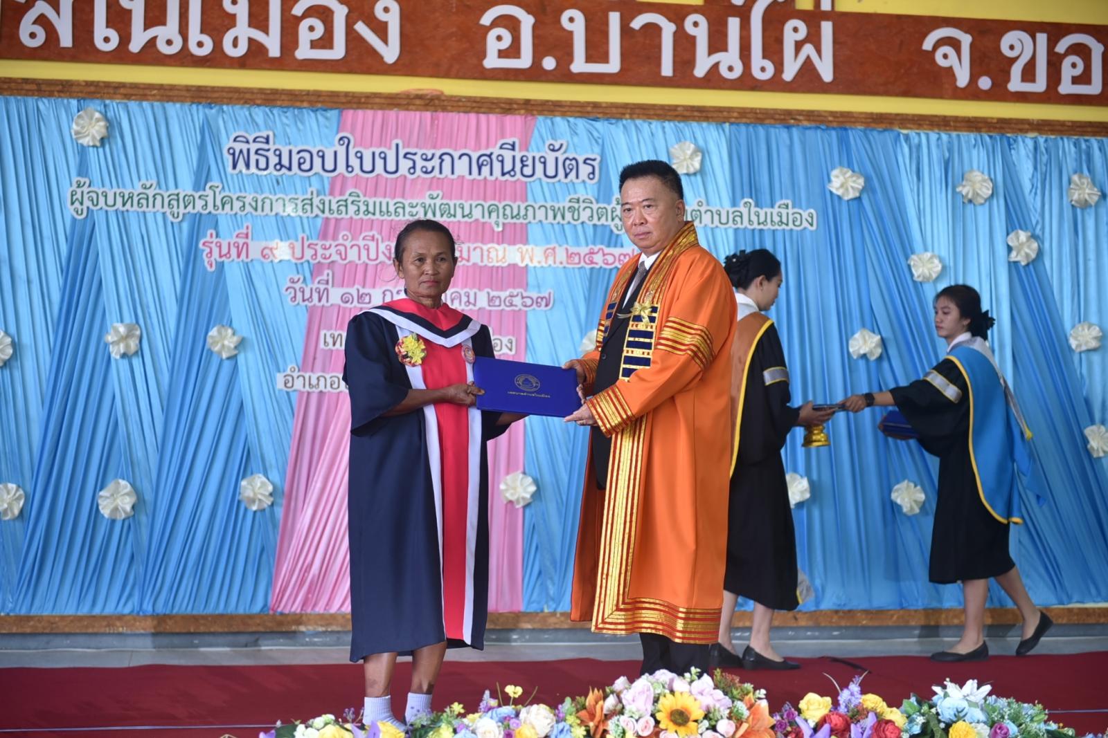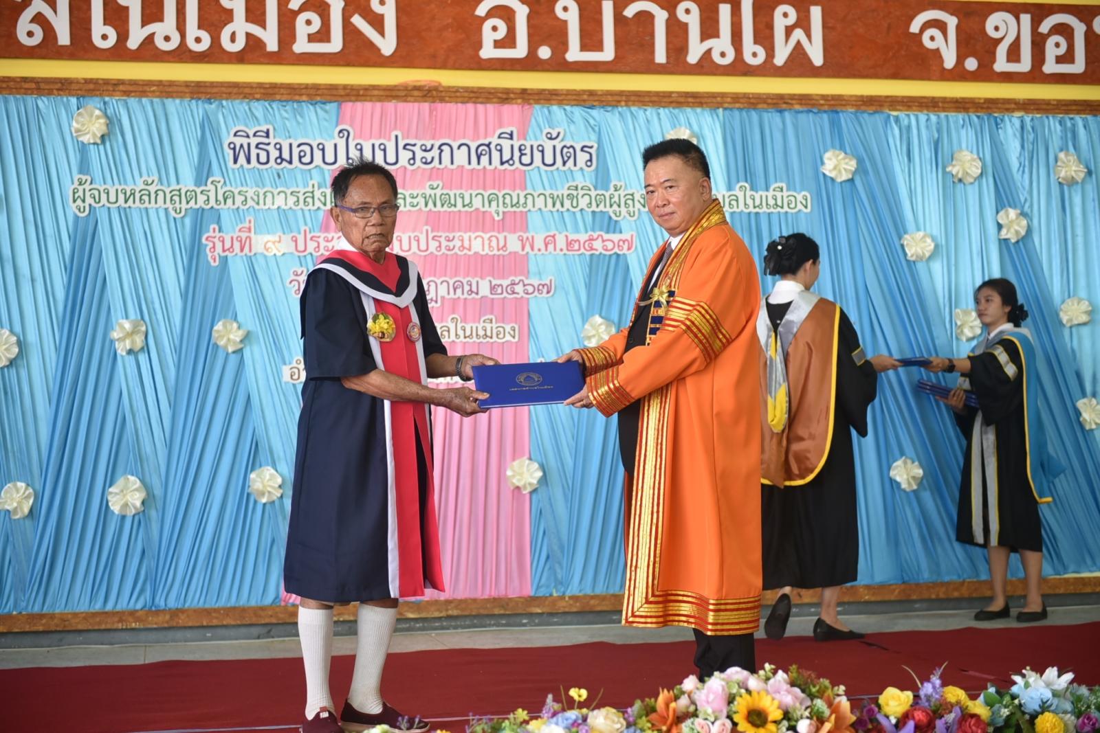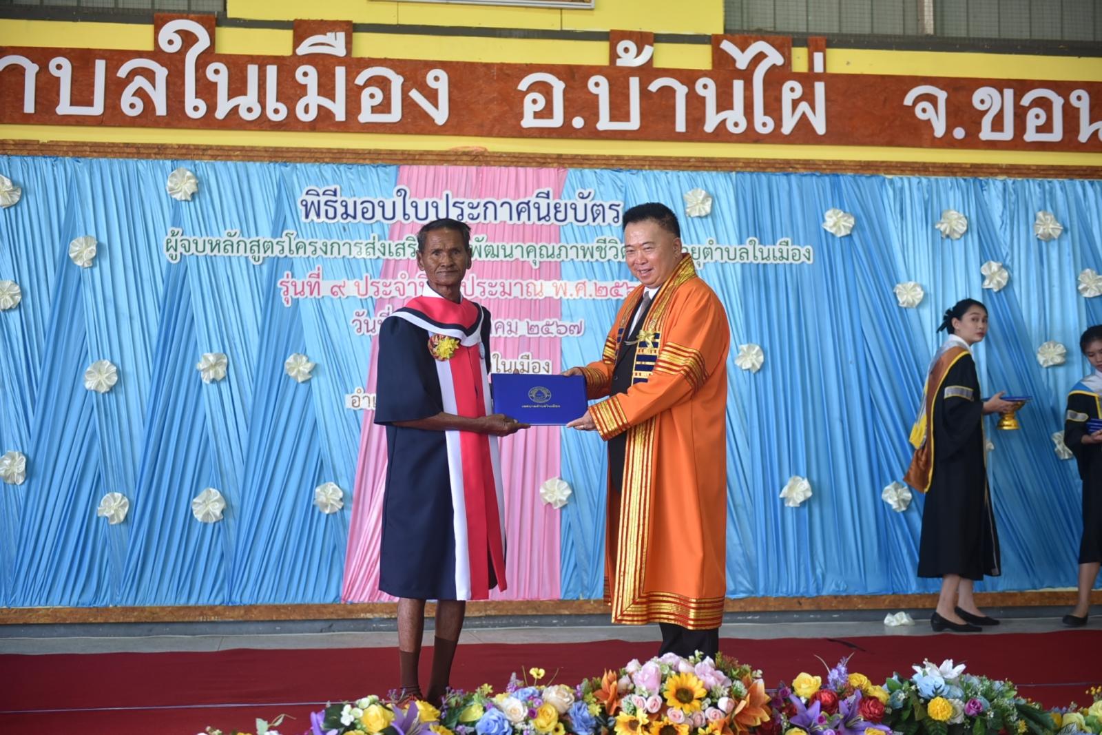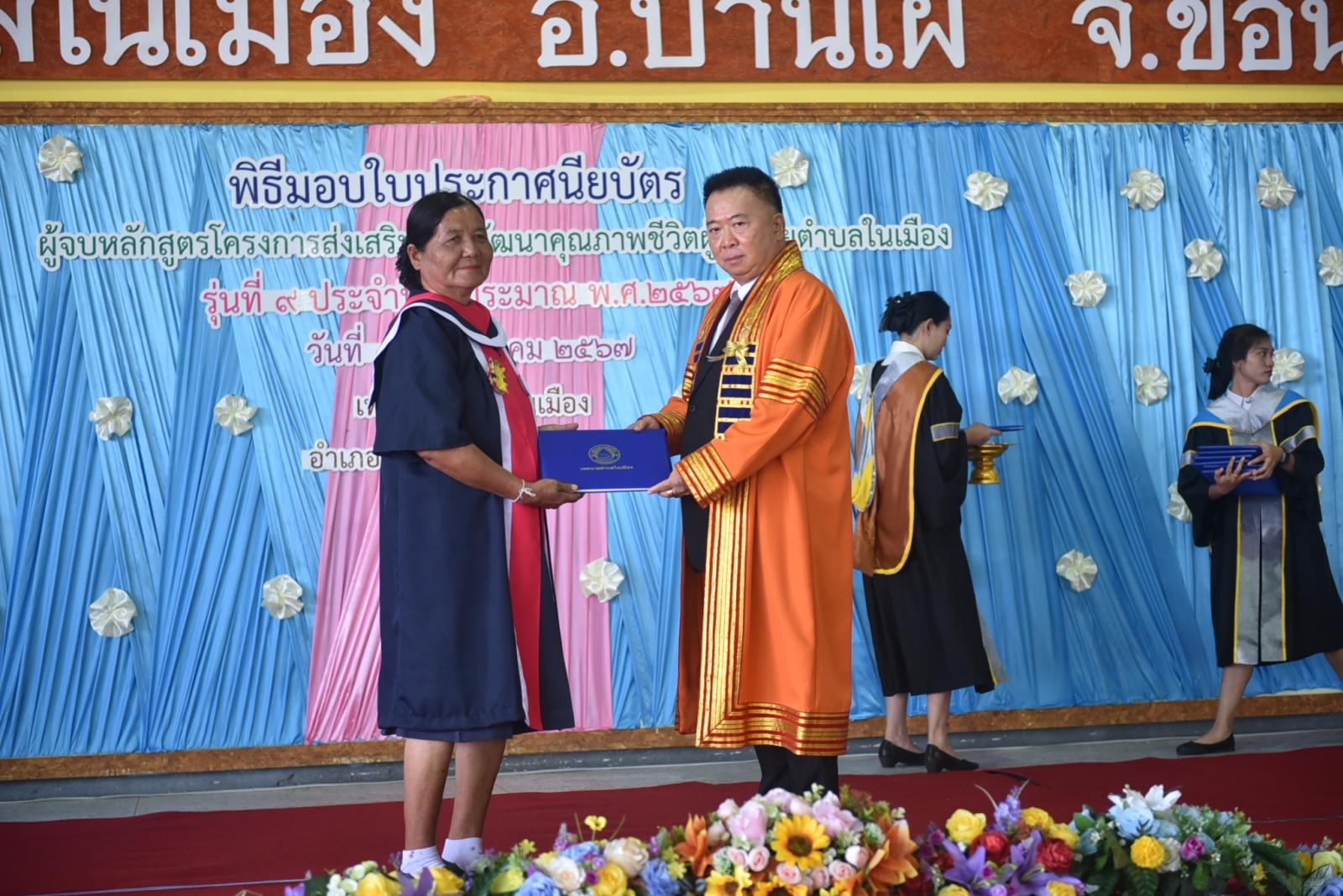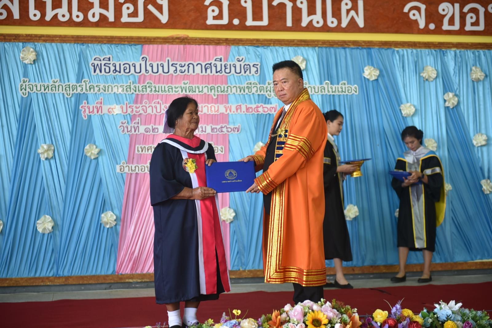 พิธีมอบประกาศนียบัตรให้แก่ผู้สูงอายุที่จบหลักสูตร ตามโครงการส่งเสริมและพัฒนาคุณภาพชีวิตผู้สูงอายุตำบลในเมือง รุ่นที่9 ประจำปีงบประมาณ 2567