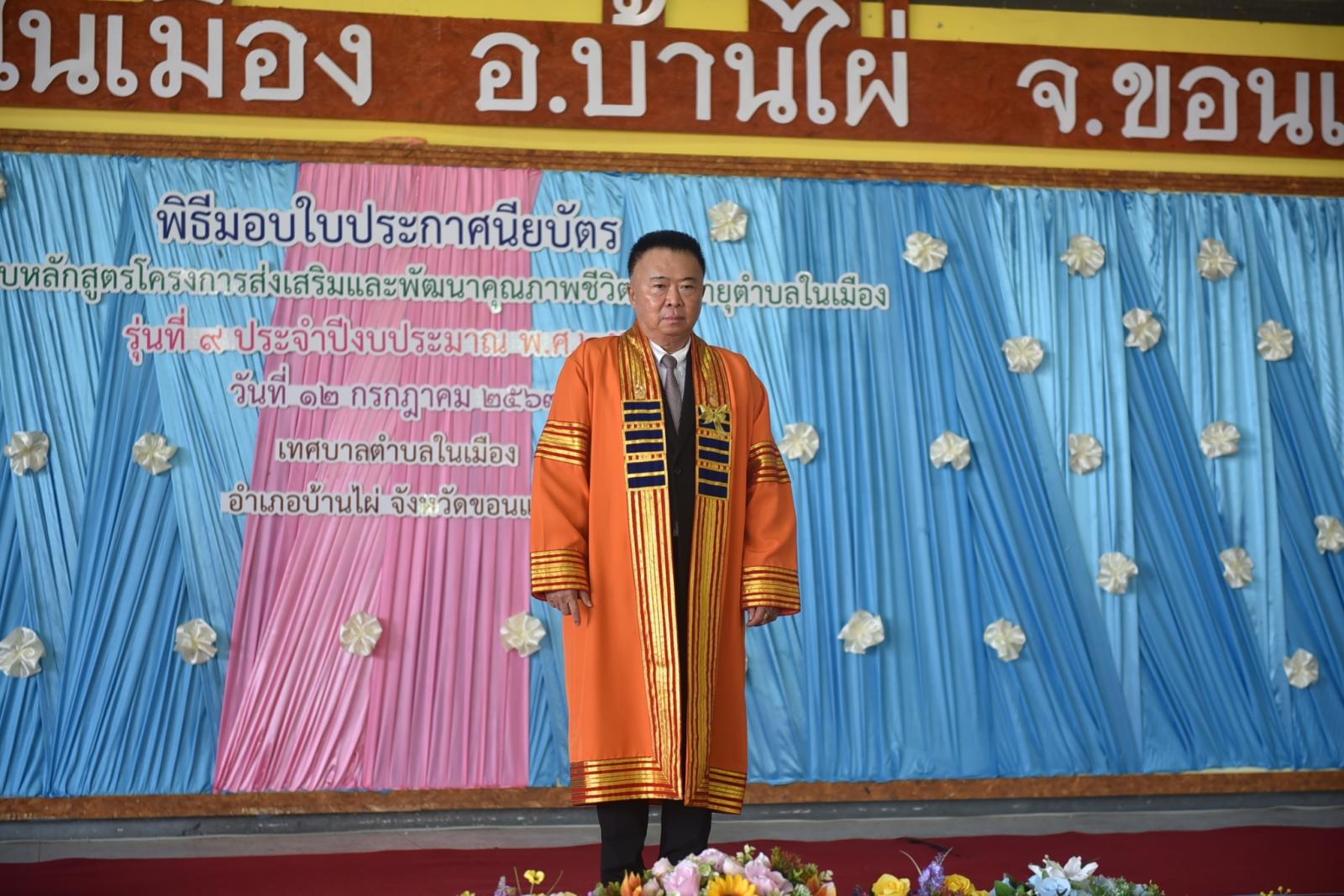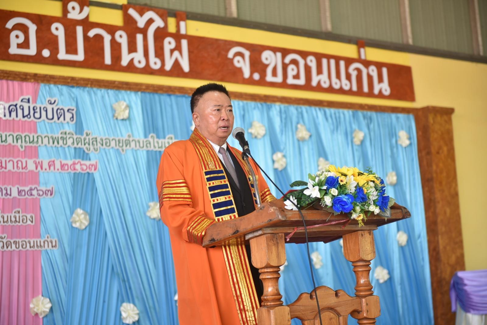 วันที่ 12 กรกฎาคม 2567 เวลา 09.00 น. ดร.พงษ์ศักดิ์ ตั้งวานิชกพงษ์ นายกองค์การบริหารส่วนจังหวัดขอนแก่น เป็นประธานมอบประกาศนียบัตรให้แก่ผู้สูงอายุที่จบหลักสูตร ตามโครงการส่งเสริมและพัฒนาคุณภาพชีวิตผู้สูงอายุตำบลในเมือง รุ่นที่9 ประจำปีงบประมาณ 2567 โดยมี นายรัตนชัย วิชัย นายกเทศมนตรีตำบลในเมือง กล่าวรายงาน ในโอกาสนี้มี นางกฤษณา ศิริพรรณ ส.อบจ.ขอนแก่น เขต อ.บ้านไผ่ ร่วมเป็นเกียรติในพิธี ณ อาคารอเนกประสงค์เทศบาลตำบลในเมือง อำเภอบ้านไผ่ จังหวัดขอนแก่น