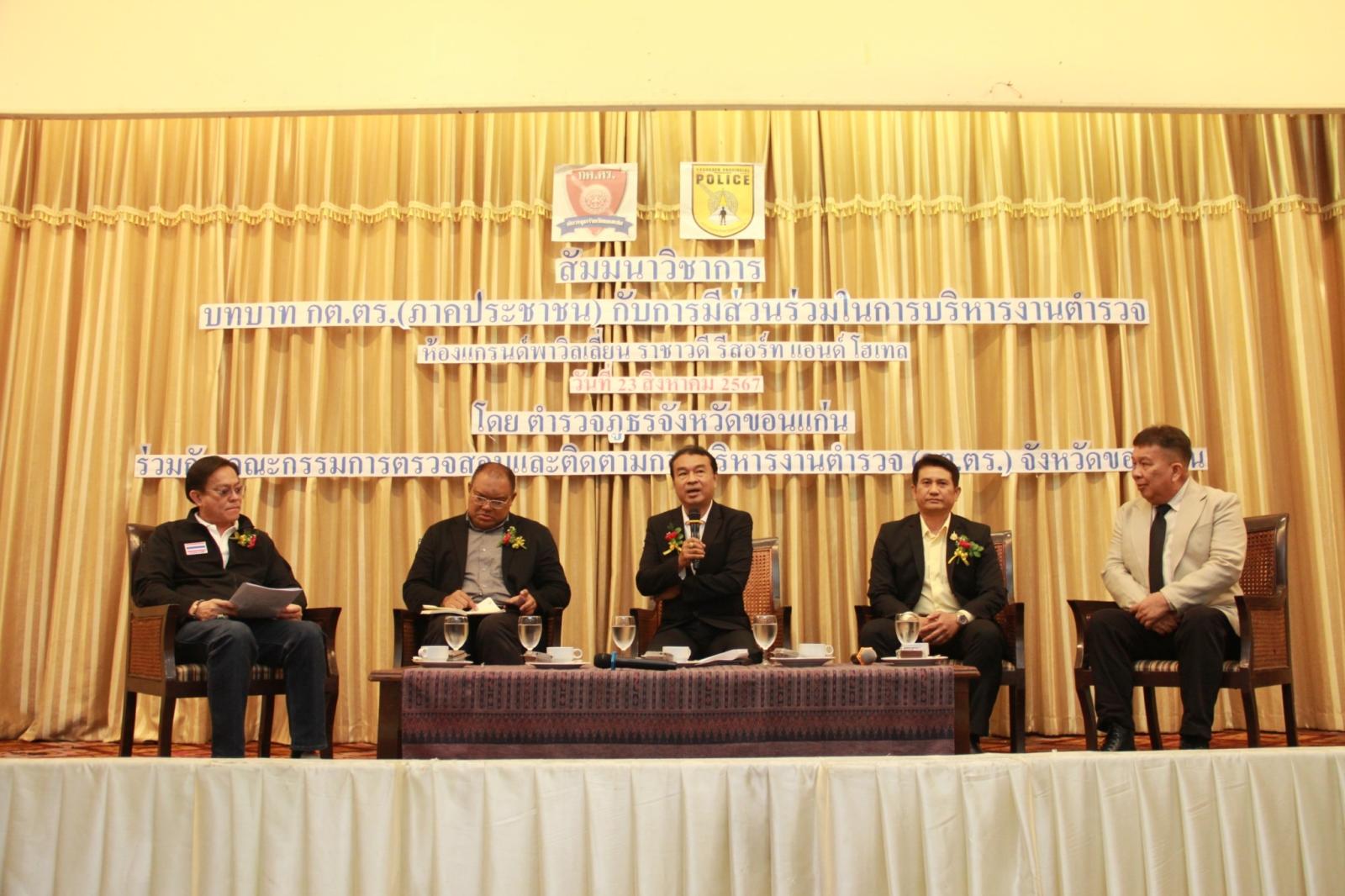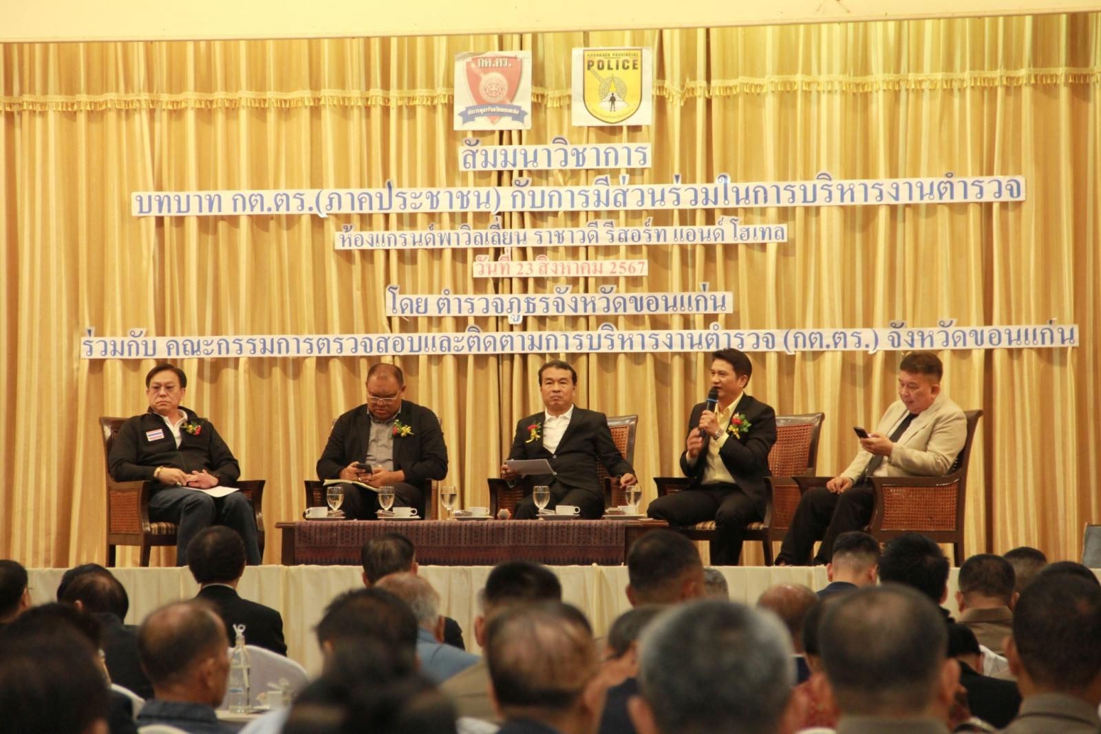 ในวันที่ 23 สิงหาคม 2567 เวลา 10.00 น. องค์การบริหารส่วนจังหวัดขอนแก่น นำโดย ดร.พงษ์ศักดิ์ ตั้งวานิชกพงษ์ นายกองค์การบริหารส่วนจังหวัดขอนแก่น มอบหมายให้ นายสิทธิกุล ภูคำวงศ์ รองนายกองค์การบริหารส่วนจังหวัดขอนแก่น ร่วมเป็นวิทยากรเสวนา “บทบาทการมีส่วนร่วมของคณะกรรมการตรวจสอบและติดตามการบริหารงานตำรวจกับการบริหารงานตำรวจ” ประเด็น-บทบาท องค์กรบริหารส่วนจังหวัด ในการสนับสนุนการทำงานของคณะกรรมการตรวจสอบและติดตามการบริหารงานตำรวจจังหวัดขอนแก่น และคณะกรรมการตรวจสอบและติดตามการบริหารงานตำรวจสถานีตำรวจภูธร โดยมี นายบุญเกียรติ อัศวะสกุลโชคดี กรรมการผู้จัดการบริษัทสยามทรัพย์เข็มเจาะ ผู้แทน กต.ตร.จังหวัดขอนแก่น ภาคประชาชน, นายสมเกียรติ ดีบุญมี ณ ชุมแพ ประทาน กต.ตร. สภ.ชุมแพ รศ.ดร.ฮิมรอน โสะสัน ประธานหลักสูตรรัฐประศาสตร์บัณฑิต สาขาวิชารัฐประศาสนศาสตร์ คณะมนุษยศาสตร์ และสังคม มหาวิทยาลัยขอนแก่น เป็นผู้ร่วมเสวนา