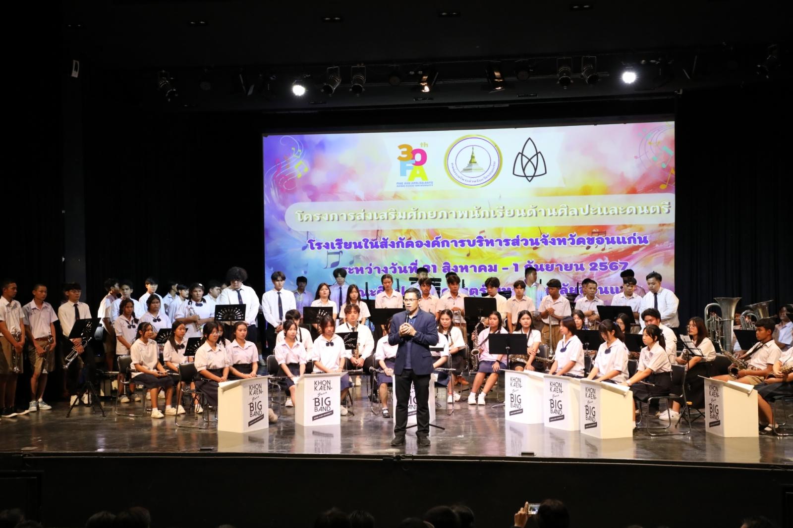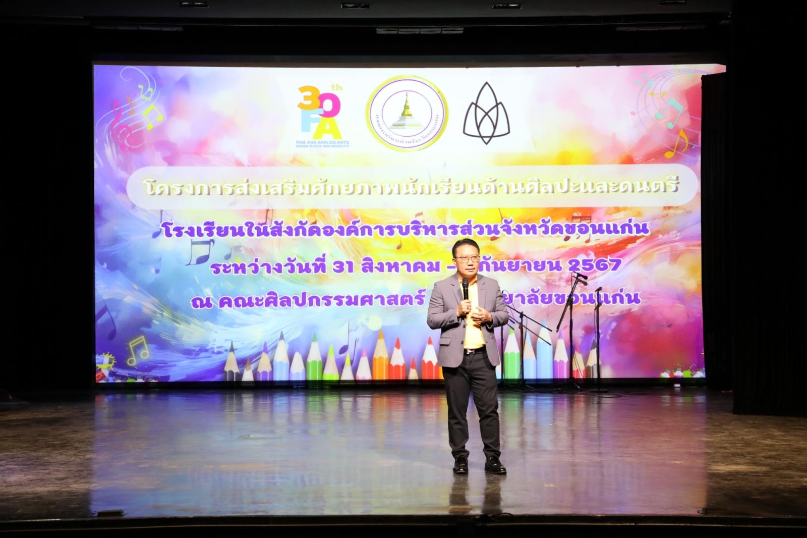 เมื่อวันที่ 1 กันยายน 2567 เวลา 14.00 น. ดร.พงษ์ศักดิ์ ตั้งวานิชกพงษ์ นายก อบจ.ขอนแก่น มอบหมายให้ ว่าที่ร้อยเอก พงเจตน์ พรกุณา ปลัดองค์การบริหารส่วนจังหวัดขอนแก่น เป็นประธานในพิธีเปิด - ปิด ในโครงการส่งเสริมศักยภาพนักเรียนด้านศิลปะและดนตรีโรงเรียนสังกัดองค์การบริหารส่วนจังหวัดขอนแก่น ในการนี้ ได้รับเกียรติจาก ผู้ช่วยศาสตราจารย์ ดร. บุรินทร์ เปล่งดีสกุล คณบดีและคณาจารย์จากคณะศิลปกรรมศาสตร์ มหาวิทยาลัยขอนแก่น และนางบุษกร ศรีสุวรรณ ผู้อำนวยการส่วนส่งเสริมการศึกษา ศาสนาและวัฒนธรรม พร้อมด้วยคณะผู้บริหารสถานศึกษาในสังกัด อบจ.ขอนแก่น เข้าร่วมกิจกรรมในครั้งนี้ ณ คณะศิลปกรรมศาสตร์ มหาวิทยาลัยขอนแก่น