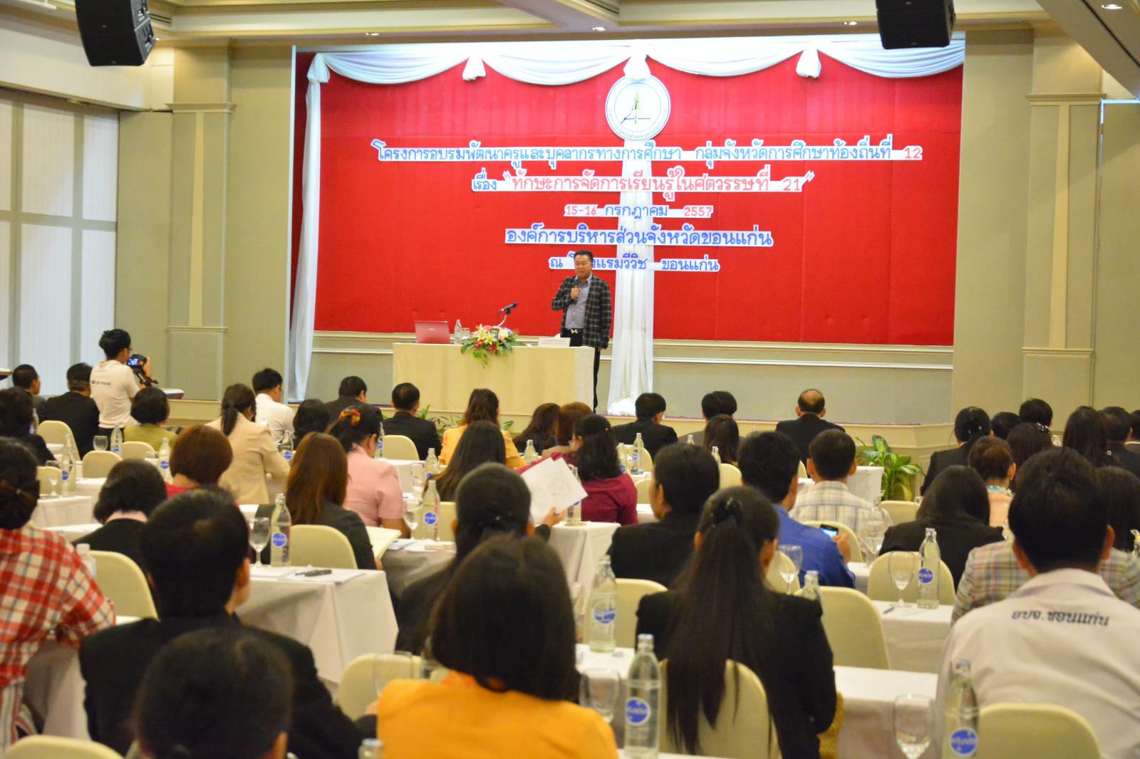 องค์การบริหารส่วนจังหวัดขอนแก่น เป็นเจ้าภาพจัดโครงการฝึกอบรมพัฒนาครูและบุคลากรทางการศึกษาสังกัดกลุ่มการจัดการศึกษาท้องถิ่นที่ 12 เรื่อง “ การจัดการเรียนรู้ในศตวรรษที่ 21 ” เพื่อสร้างความตระหนักและสร้างองค์ความรู้ เกี่ยวกับการจัดการเรียนรู้ระดับการศึกษาขั้นพื้นฐาน เพื่อรองรับการเปลี่ยนแปลงสู่ศตวรรษที่ 21 กลุ่มเป้าหมายประกอบด้วยผู้บริหารการศึกษา ผู้บริหารสถานศึกษา นักวิชาการศึกษา และครูผู้สอน จำนวน 236 คน จากองค์กรปกครองส่วนท้องถิ่นที่มีสถานศึกษาในสังกัด ทั้งระดับปฐมวัย ประถมศึกษาและมัธยมศึกษา จังหวัดขอนแก่น ร้อยเอ็ด มหาสารคาม และกาฬสินธุ์ อบรมระหว่างวันที่ 15-16 กรกฎาคม 2557 ที่ผ่านมา ที่ โรงแรมวีวิชญ์ อำเภอเมือง จังหวัดขอนแก่น โดย ดร.พงษ์ศักดิ์ ตั้งวานิชกพงษ์ นายกองค์การบริหารส่วนจังหวัดขอนแก่น เดินทางมาเป็นประธานในพิธีเปิด และได้รับเกียรติจาก ผศ.ดร.เด่นพงษ์ สุดภักดี รองอธิการบดีฝ่ายวิชาการ และเทคโนโลยีสารสนเทศ มหาวิทยาลัยขอนแก่น บรรยายพิเศษ เรื่อง “ กรอบความคิดสู่การพัฒนาทักษะการเรียนรู้ ” / ดร.ประยุทธ์ ชูสอน บรรยายพิเศษ เรื่อง “ การบริหารสถานศึกษาในศตวรรษที่ 21 ” / ดร.ทวีศิลป์ สารแสน รองผอ.สพม.25 บรรยายพิเศษ เรื่อง “สาระความรู้ในศตวรรษที่ 21 ” รศ.สมปัต ตัญตรัยรัตน์ บรรยายพิเศษ เรื่อง “ ทักษะที่จำเป็นสำหรับผู้เรียนและผู้สอนในศตวรรษ ที่ 21 ” และ รศ.ดร.สันติ วิจักขณาลัญฉ์ บรรยายพิเศษ เรื่อง “ ระบบการส่งเสริมทักษะการเรียนรู้ในศตวรรษ ที่ 21 ”