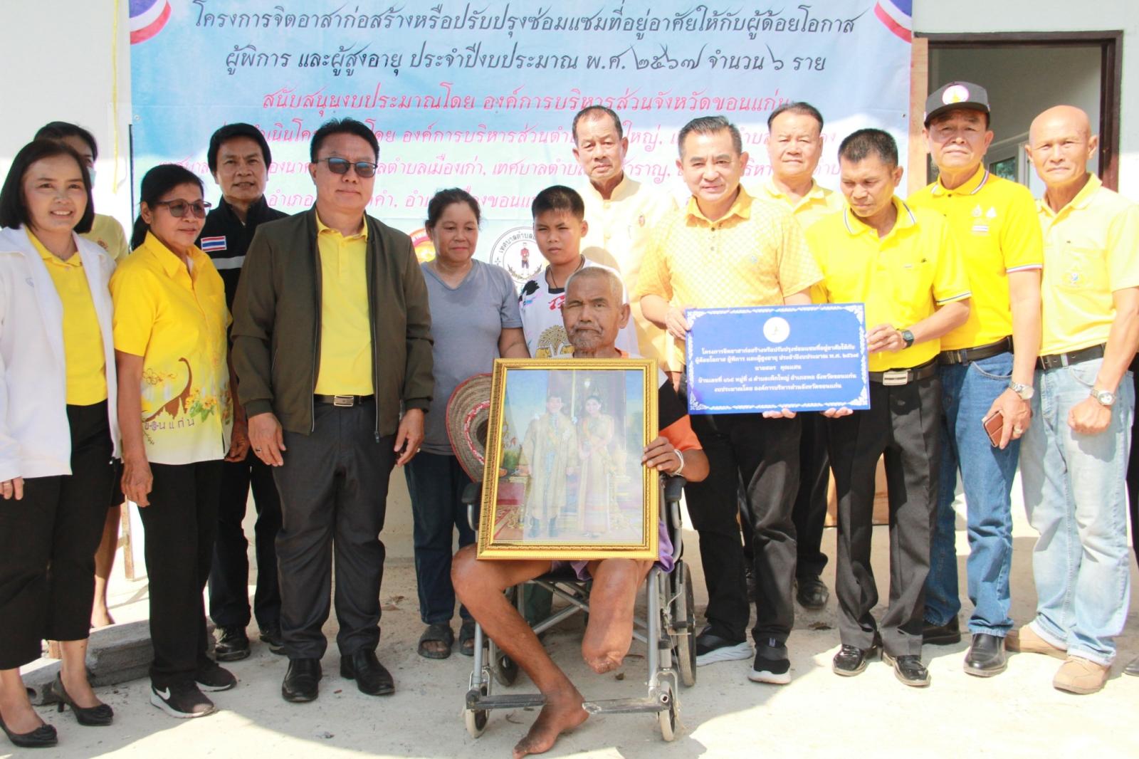 เมื่อวันที่ 11 พฤศจิกายน 2567 เวลา 13.30 น. ว่าที่ร้อยเอกพงเจตน์ พรกุณา ปลัด อบจ.ขอนแก่น ปฏิบัติหน้าที่นายกองค์การบริหารส่วนจังหวัดขอนแก่น เป็นประธานในการส่งมอบบ้านตามโครงการจิตอาสาก่อสร้างหรือปรับปรุงซ่อมแซมที่อยู่อาศัยให้กับผู้ด้อยโอกาส ผู้พิการ และผู้สูงอายุ ประจำปีงบประมาณ พ.ศ.2567 ราย นายสมร คุณแสน อายุ 60 ปี บ้านเลขที่ 165 บ้านโนนหอม หมู่ที่ 8 ตำบลเพ็กใหญ่ อำเภอพล จังหวัดขอนแก่น โดยมี นายเสกสม ลินดาพรประเสริฐ นายอำเภอพล, นางสาวศิริวรรณ สุรินทะ หัวหน้าสำนักปลัด อบจ., นางทิพานัน นามวิจิตร เลขานุการ อบจ.,นางสาวเสาวลักษณ์ แสงนิ่ม ผอ.ส่วนแผนงานและงบประมาณ, ผู้ท้องที่ ผู้นำท้องถิ่น เข้าร่วมเป็นเกียรติและร่วมส่งมอบบ้านนครั้งนี้
