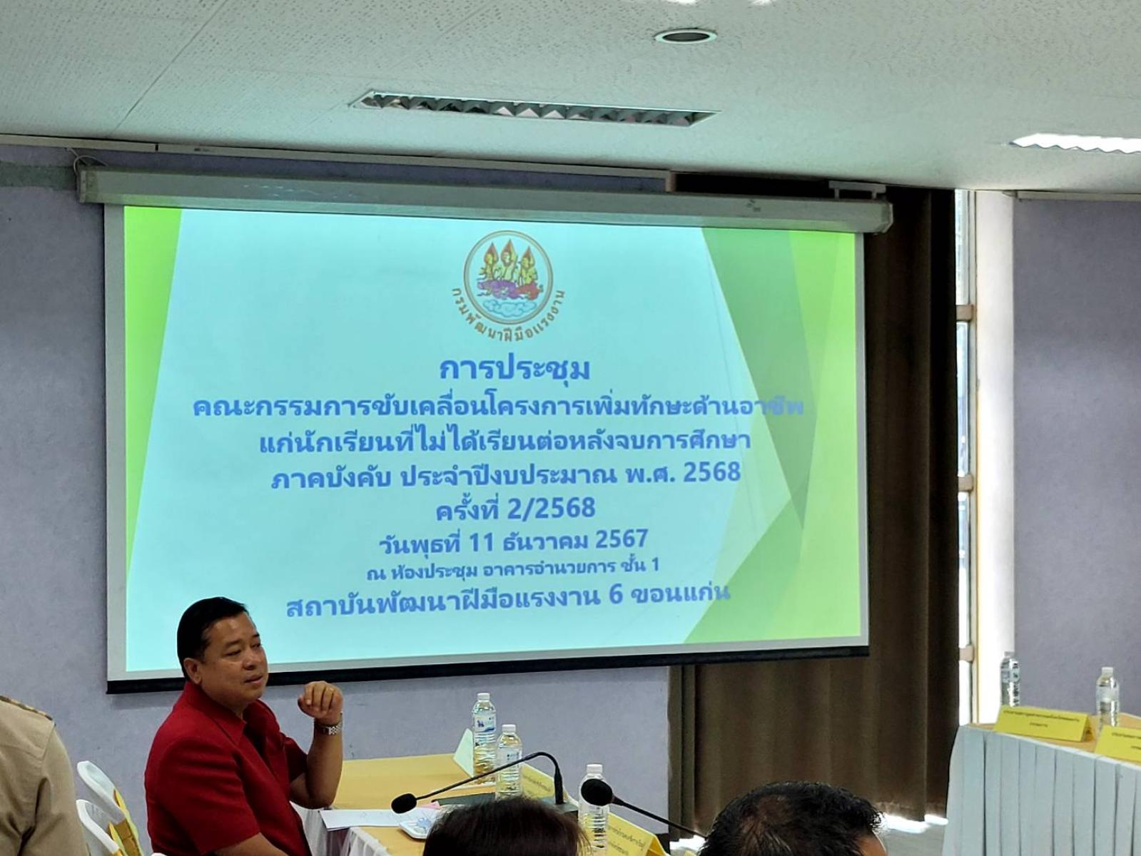 วันที่ 11 ธันวาคม 2567 เวลา 9.30 น. นายวัฒนา ช่างเหลา นายก อบจ.ขอนแก่น มอบหมายให้ นายนำศิลป์ วิเศษ ผอ.สำนักการศึกษาศาสนาและวัฒนธรรม ร่วมประชุมคณะกรรมการขับเคลื่อนโครงการเพิ่มทักษะด้านอาชีพแก่นักเรียนที่ไม่ได้เรียนต่อหลังจบการศึกษาภาคบังคับ ประจำปีงบประมาณ พ.ศ.2568 ครั้งที่ 2/2568 โดยมี นายสมศักดิ์ สุวรรณสุจริต ประธานผู้ตรวจการแผ่นดิน ณ สถาบันพัฒนาฝีมือแรงงาน ภาค 6 จังหวัดขอนแก่น