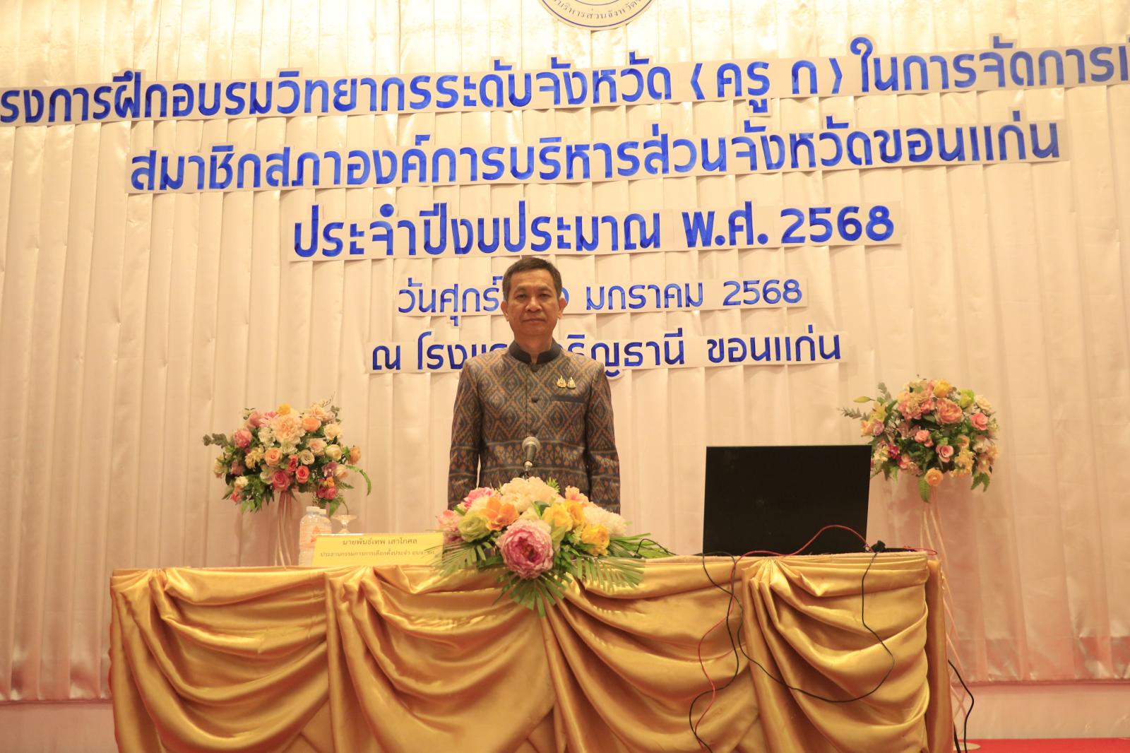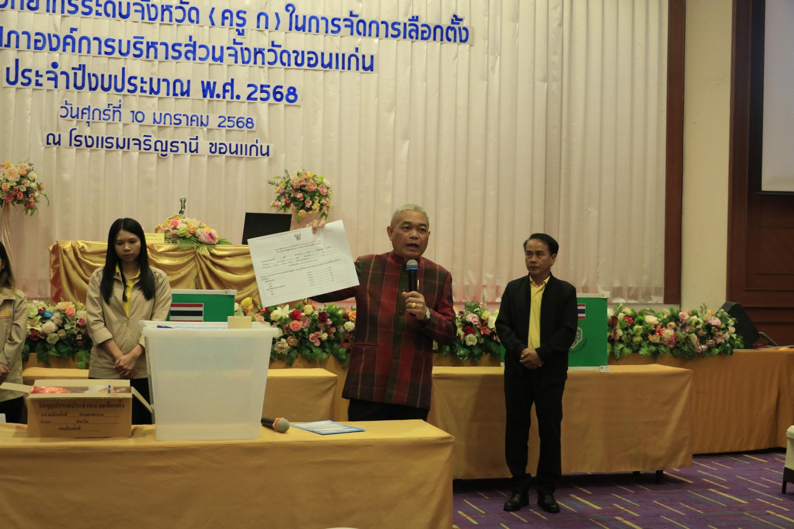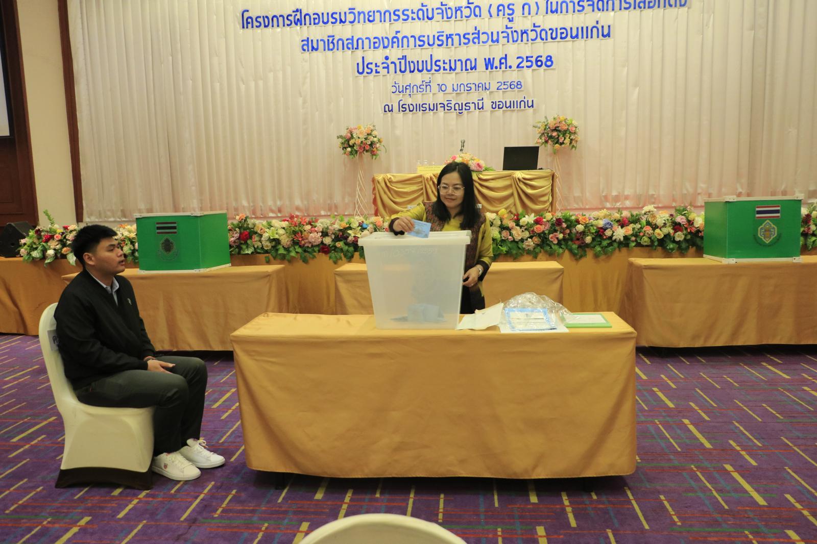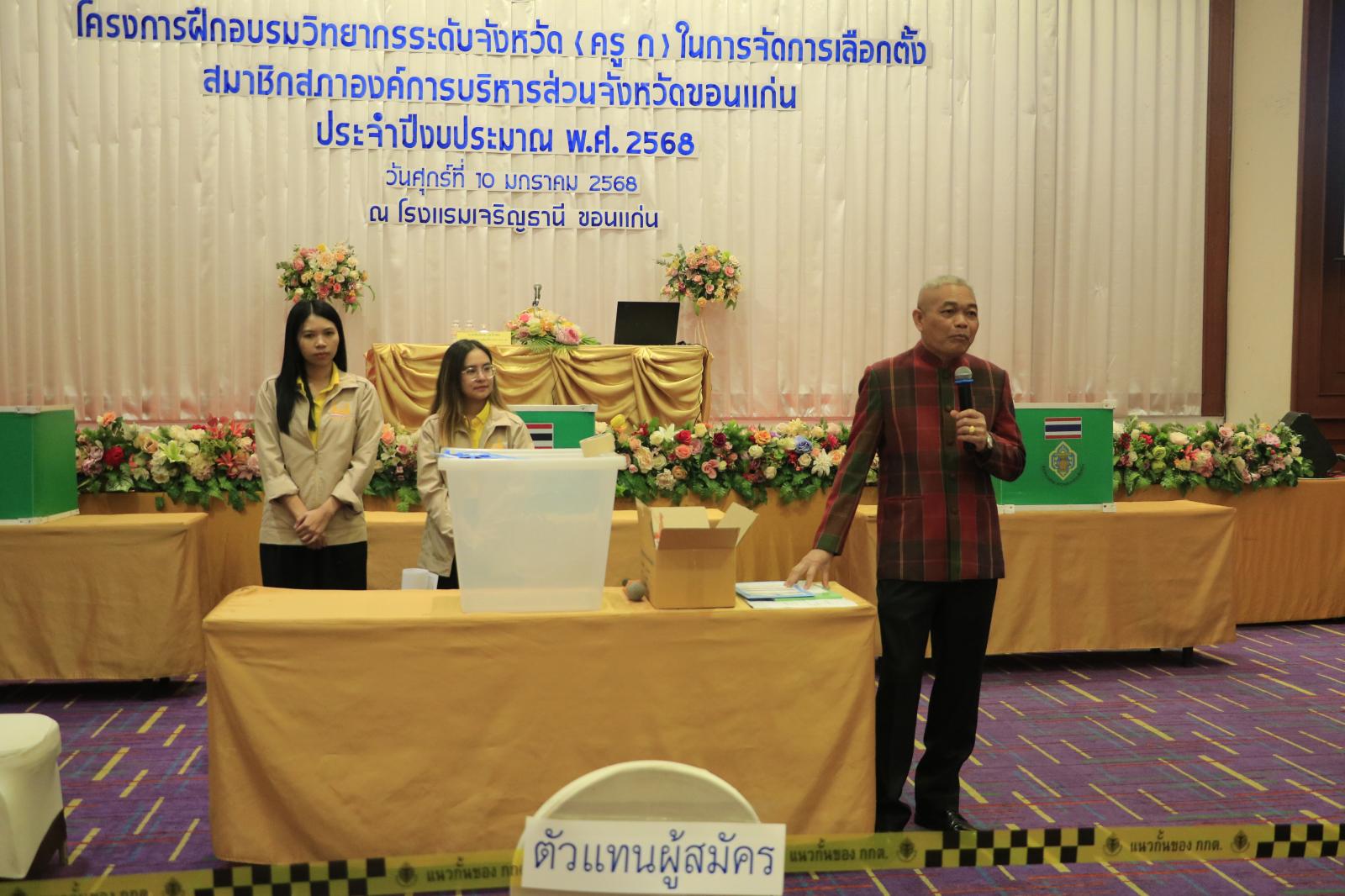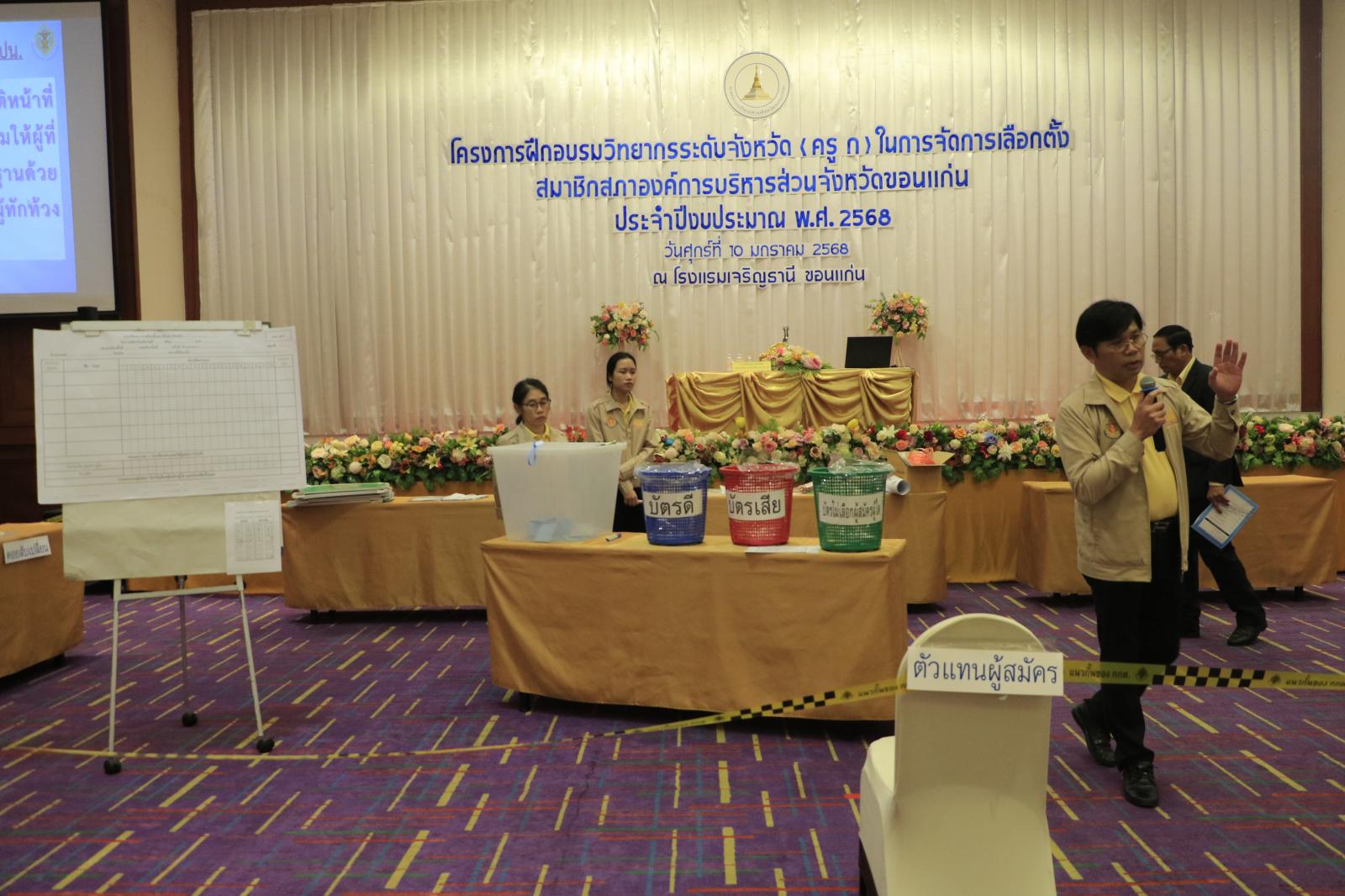 เมื่อวันที่ 10 มกราคม 2568 เวลา 10.00 น. องค์การบริหารส่วนจังหวัดขอนแก่น จัดโครงการฝึกอบรมวิทยากรระดับจังหวัด (ครู ก.) ในการเลือกตั้งสมาชิกสภาองค์การบริหารส่วนจังหวัดขอนแก่น ประจำปีงบประมาณ พ.ศ.2568 โดยมีนายพันธ์เทพ เสาโกศล รองผู้ว่าราชการจังหวัดขอนแก่นในฐานะ ประธานคณะกรรมการการเลือกตั้งนายกองค์การบริหารส่วนจังหวัดขอนแก่น เป็นประธานในพิธีเปิดการฝึกอบรมฯ ในโอกาสนี้มี ว่าที่ร้อยเอกพงเจตน์ พรกุณา ปลัดองค์การบริหารส่วนจังหวัดขอนแก่น ในฐานะผู้อำนวยการการเลือกตั้งประจำองค์การบริหารส่วนจังหวัดขอนแก่น เป็นผู้กล่าวรายงานถึงวัตถุประสงค์ของการอบรมในครั้งนี้ โดยมี นางสาวสิริยากร ภัทร์ธนะวัตน์ รองผู้อำนวยการสำนักงานคณะกรรมการเลือกตั้งประจำจังหวัดขอนแก่น ให้ความรู้ผู้เข้าร่วมการฝึกอบรบฯ โดยมีคณะกรรมการการเลือกตั้งประจำองค์การบริหารส่วนจังงหวัดขอนแก่น คณะกรรมการที่ปรึกษา ที่ปรึกษานายกองค์การบริหารส่วนจังหวัดขอนแก่น ผู้บริหารท้องถิ่น หัวหน้าส่วนราชการองค์การบริหารส่วนจังหวัดขอนแก่น เข้าร่วมเป็นเกียรติในพิธีเปิดในครั้งนี้ ในโอกาสนี้ได้รับเกียรติคณะวิทยากรจากสำนักงานคณะกรรมการการเลือกตั้งประจำจังหวัดขอนแก่น บรรยายให้ความรู้เรื่องเกี่ยวกับโครงสร้างการบริหารจัดการเลือกตั้งท้องถิ่น ประกอบด้วย เจ้าพนักงานผู้ดำเนินการเลือกตั้ง, การปฏิบัติหน้าที่ในการจัดการออกเสียงลงคะแนน, การปฏิบัติหน้าที่ในการดำเนินการนับคะแนนเลือกตั้ง, ข้อพึงระวังในการปฏิบัติหน้าที่, ตัวอย่างแบบพิมพ์ต่าง ๆ ณ โรงแรมเจริญธานี อำเภอเมือง จังหวัดขอนแก่น