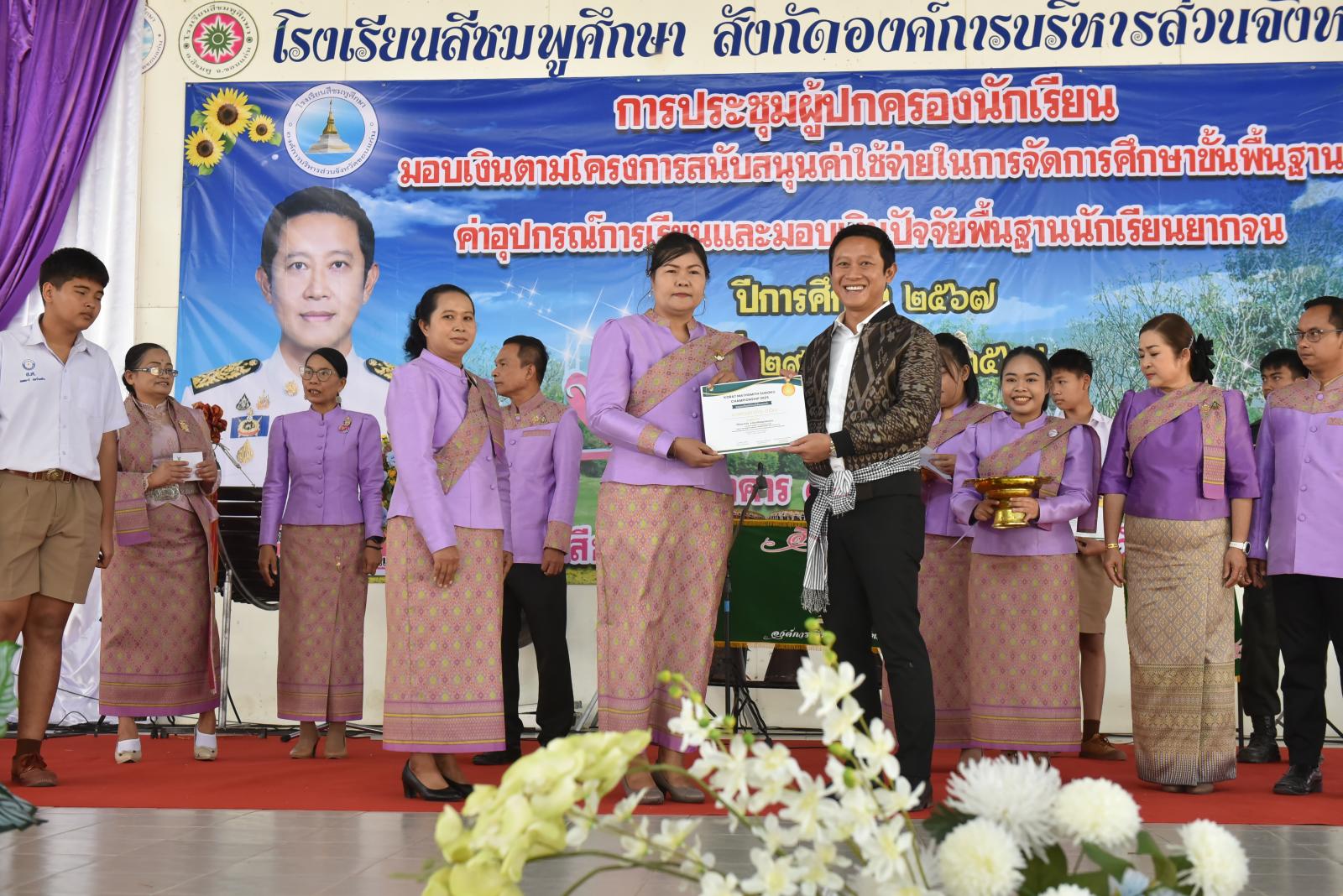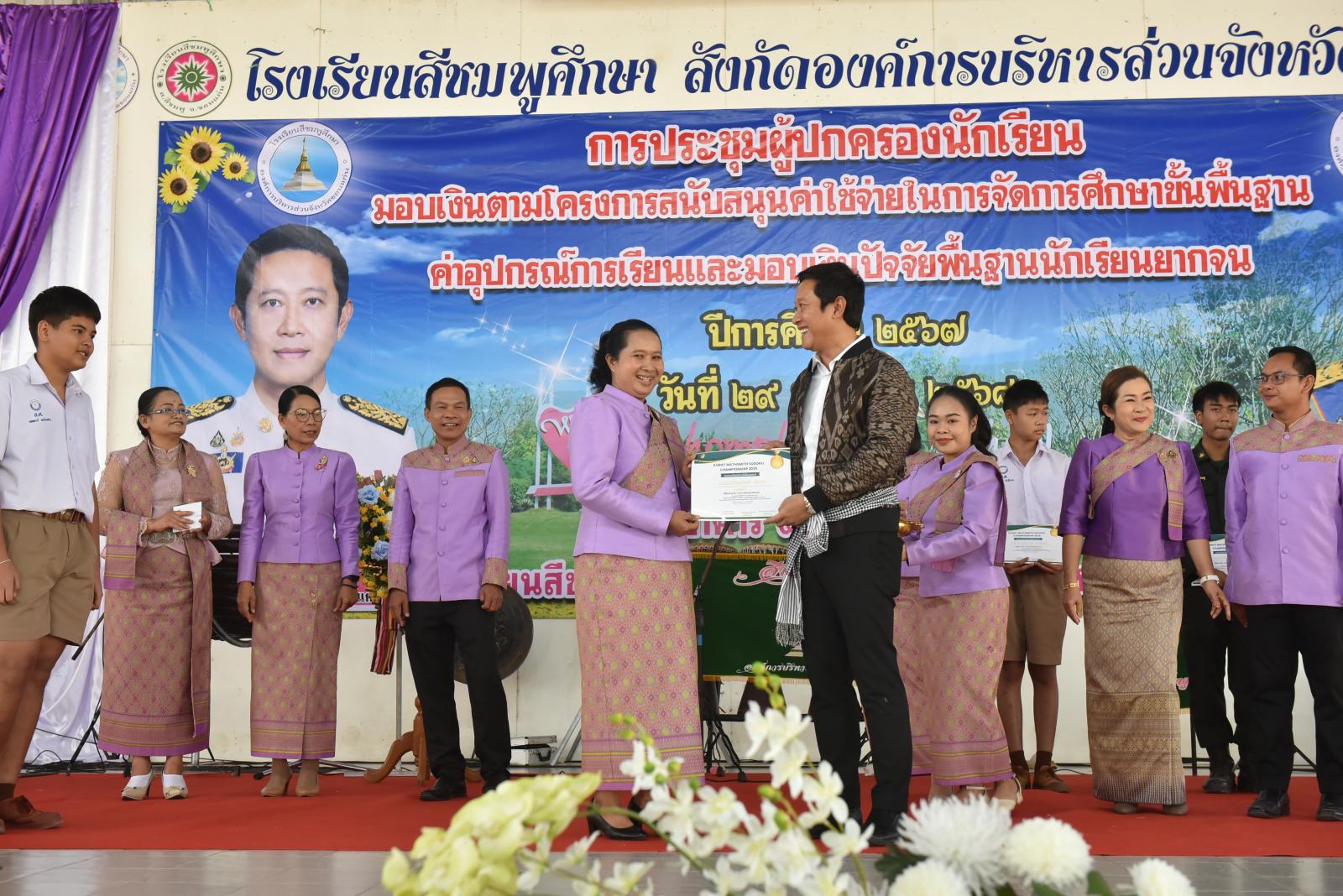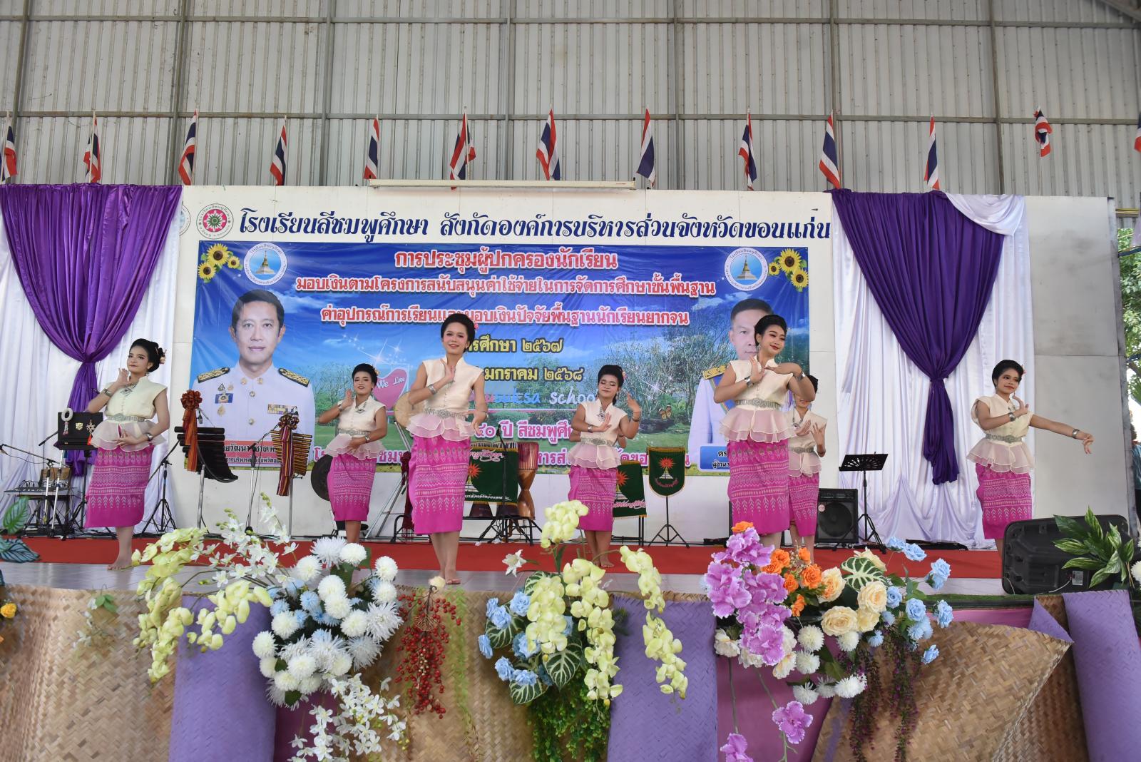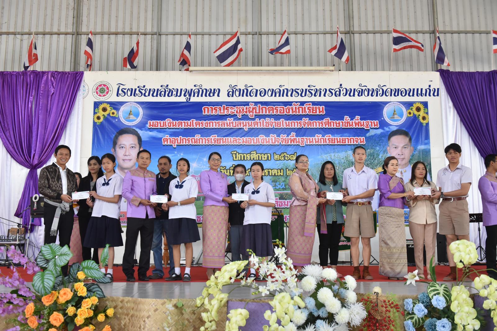 เปิดการประชุมผู้ปกครองนักเรียน มอบเงินตามโครงการสนับสนุนค่าใช้จ่ายในการจัดการศึกษาขั้นพื้นฐาน ค่าอุปกรณ์การเรียนและมอบเงินปัจจัยพื้นฐานนักเรียนยากจน ของโรงเรียนสีชมพูศึกษา ภาคเรียนที่ 2 ปีการศึกษา 2567