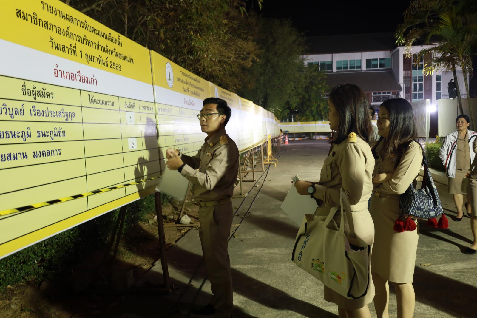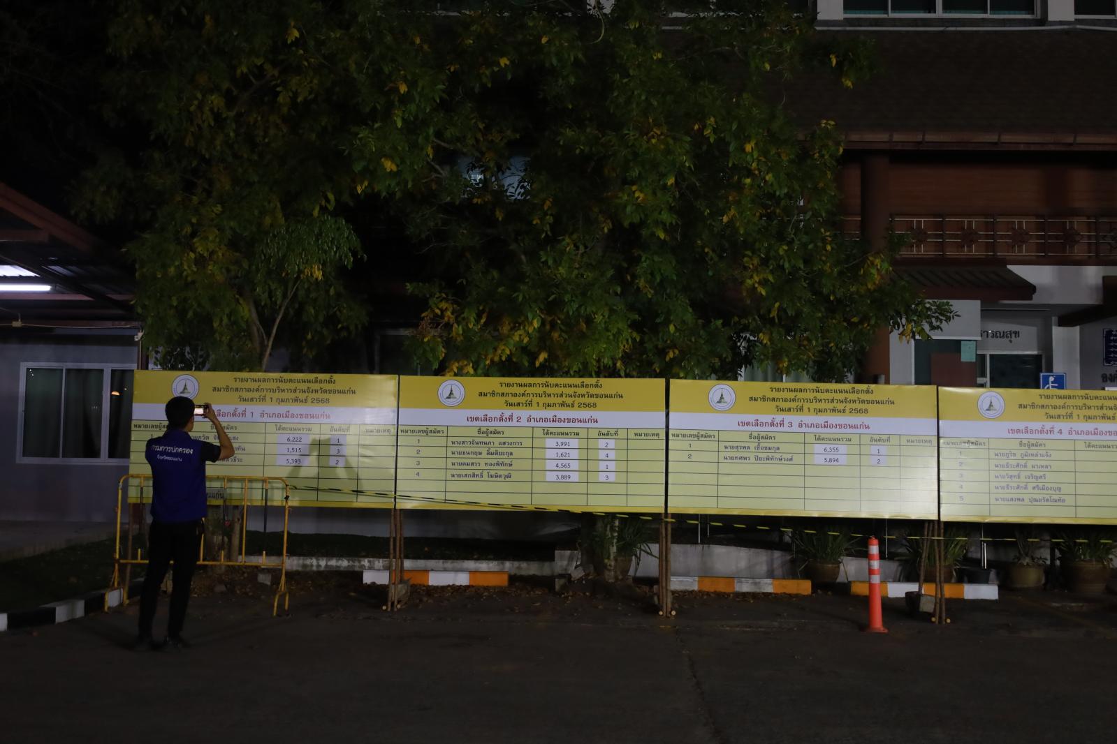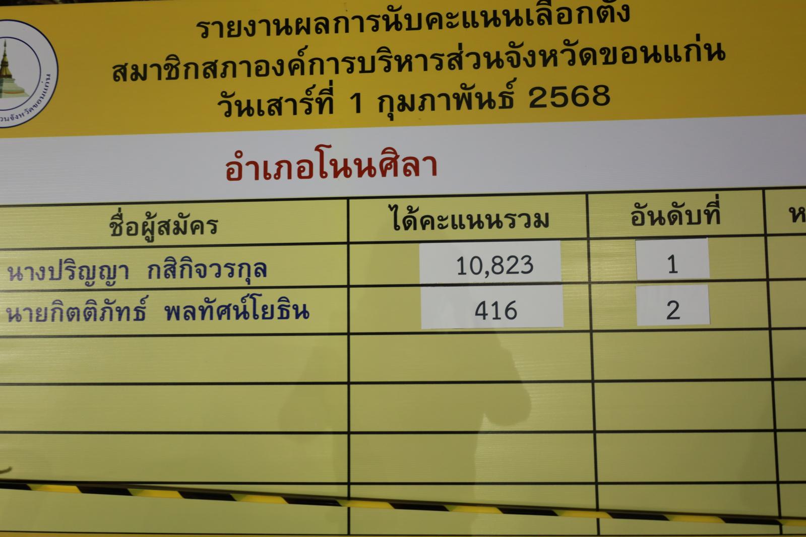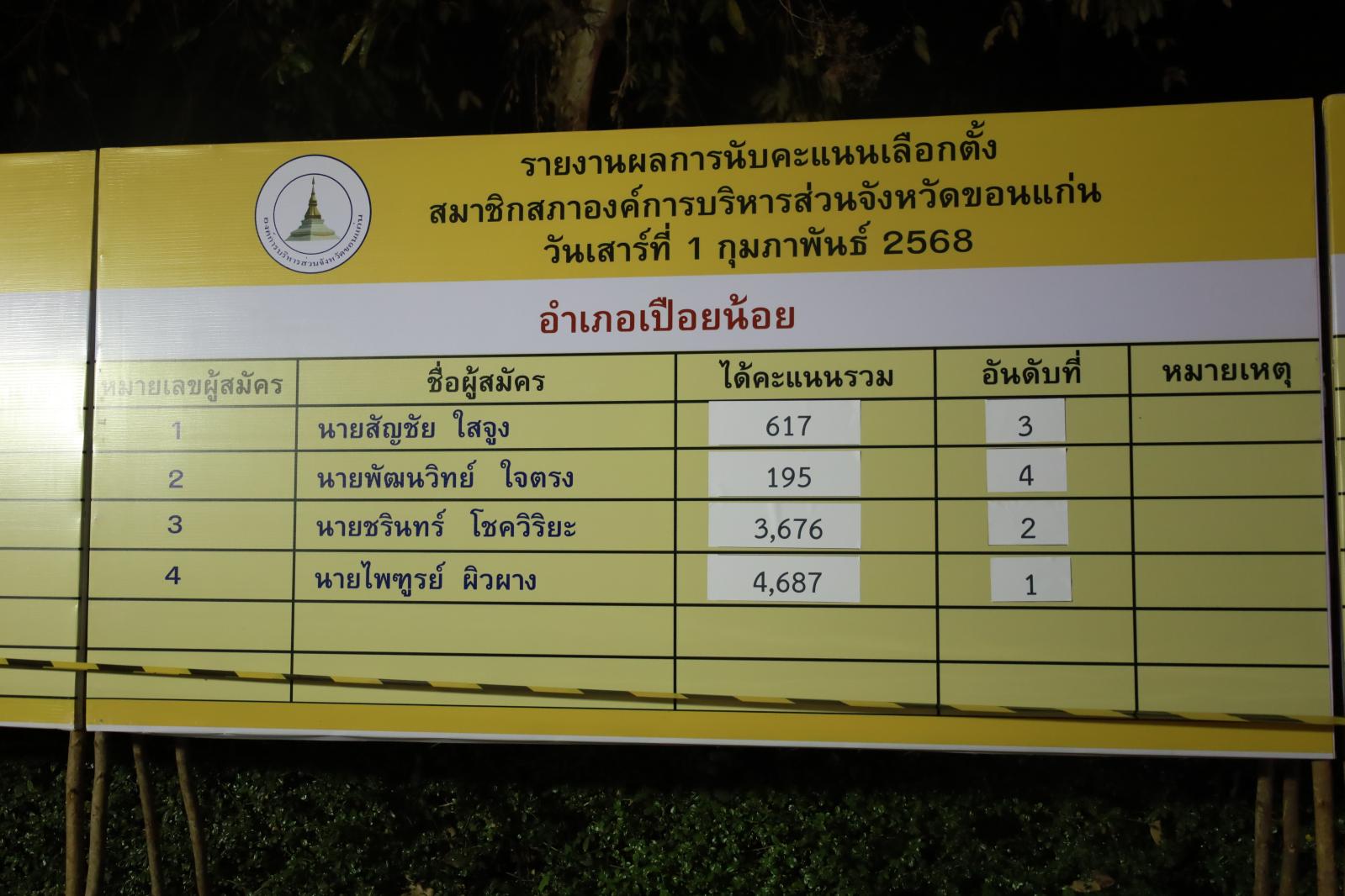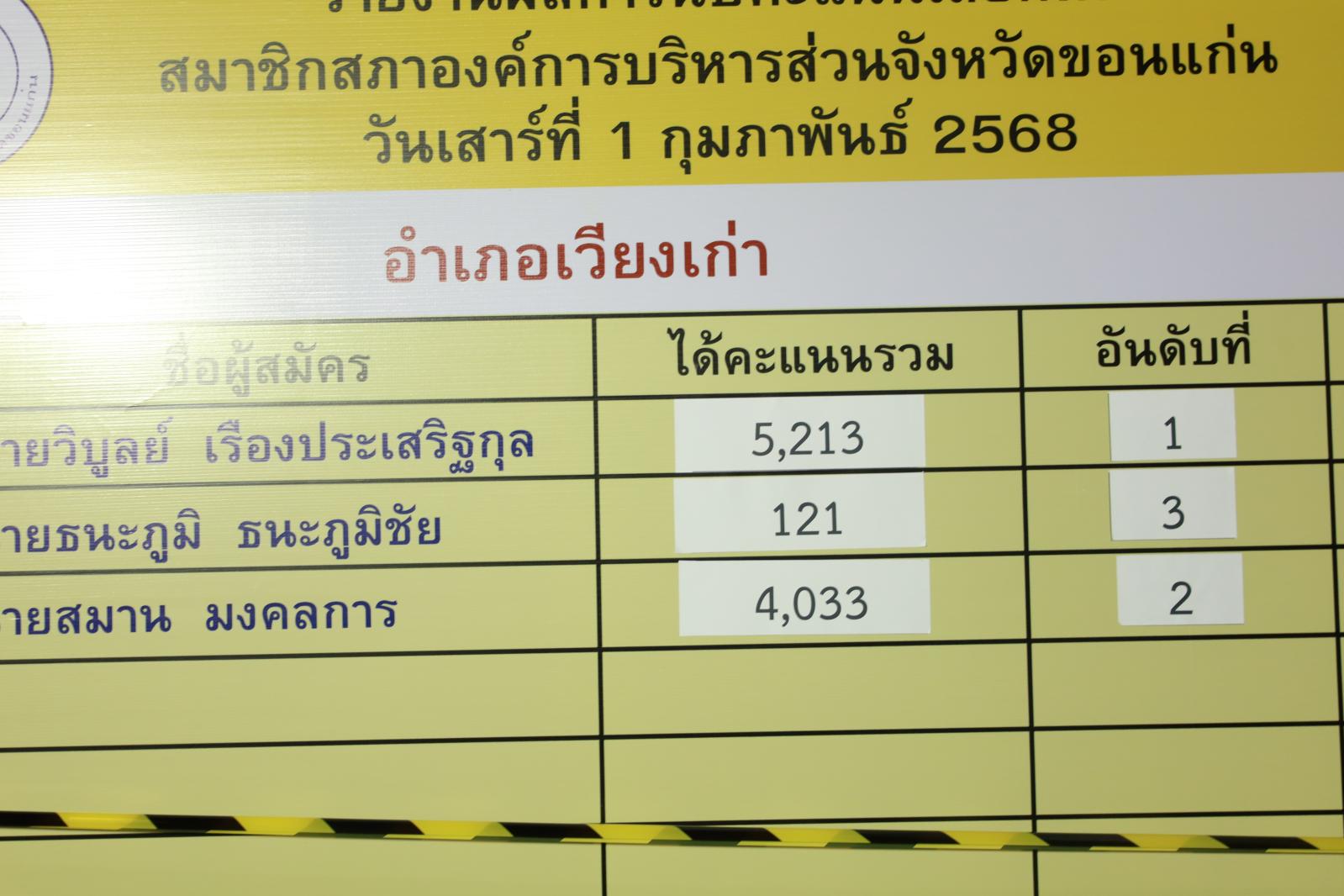 เมื่อวันที่ 1 กุมภาพันธ์ 2568 นายพันธ์เทพ เสาโกศล รองผู้ว่าราชการจังหวัดขอนแก่น ในฐานะประธานคณะกรรมการการเลือกตั้งนายกองค์การบริหารส่วนจังหวัดขอนแก่น ว่าที่ร้อยเอกพงเจตน์ พรกุณา ปลัดองค์การบริหารส่วนจังหวัดขอนแก่น ในฐานะผู้อำนวยการการเลือกตั้งประจำองค์การบริหารส่วนจังหวัดขอนแก่น นายวัชระ สีสาร ผู้อำนวยการสำนักงานคณะกรรมการเลือกตั้งประจำจังหวัดขอนแก่น พร้อมคณะกรรมการการเลือกตั้งประจำองค์การบริหารส่วนจังงหวัดขอนแก่น หัวหน้าส่วนราชการองค์การบริหารส่วนจังหวัดขอนแก่น ร่วมรับฟังการรายงานผลการนับคะแนนสมาชิกสภาองค์การบริหารส่วนจังหวัดขอนแก่น ณ ศูนย์ประสานงานการเลือกตั้งประจำจังหวัดขอนแก่น