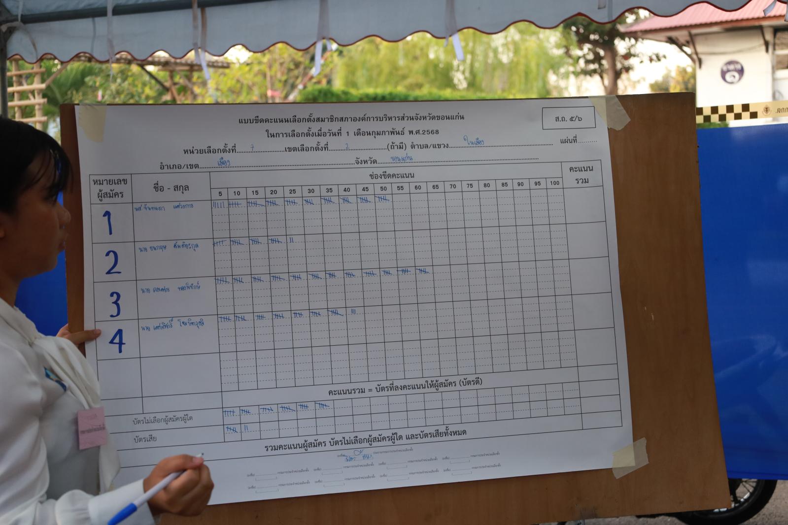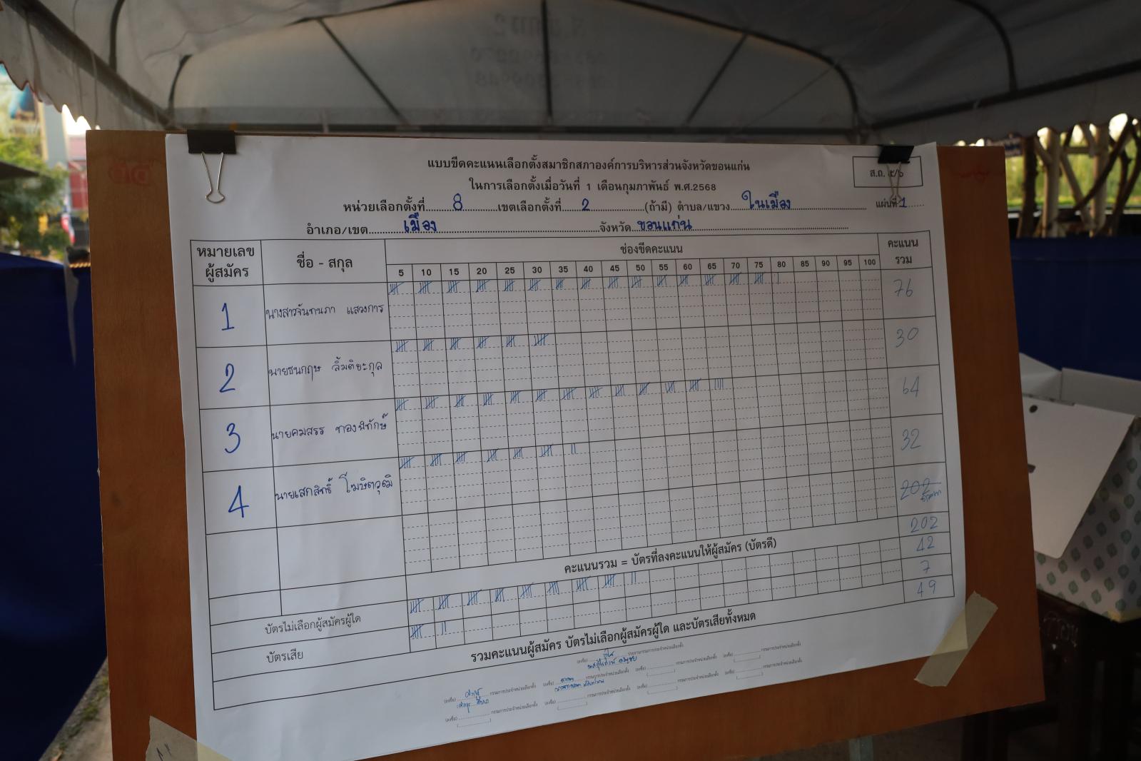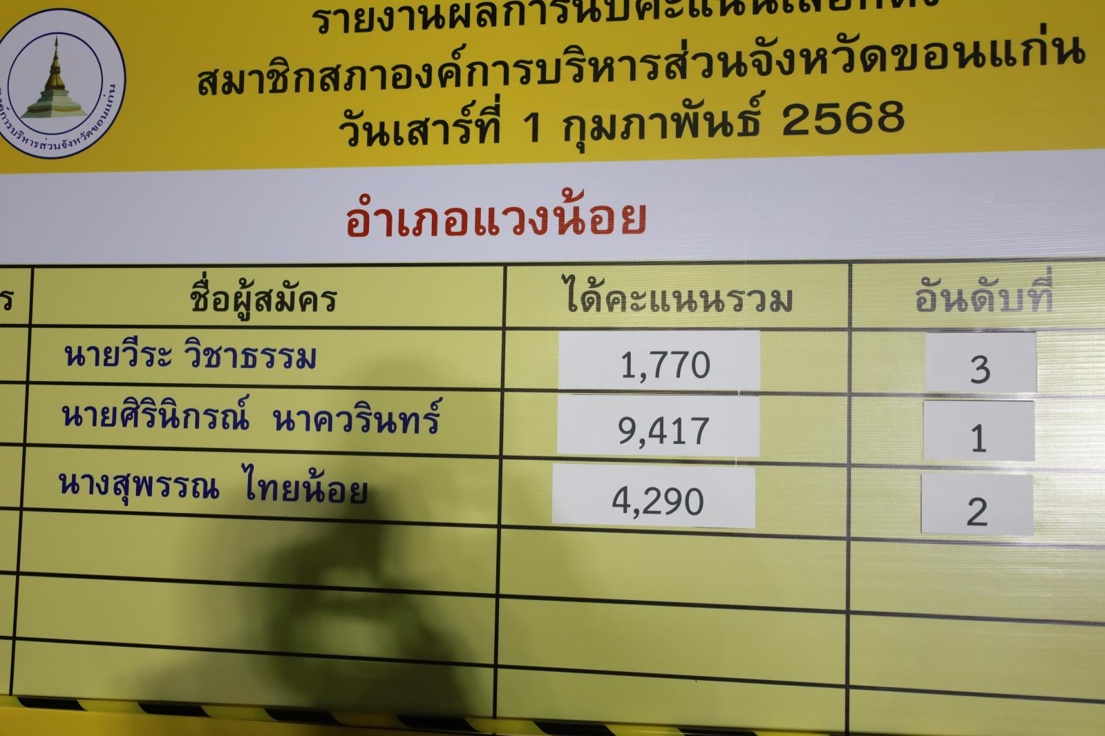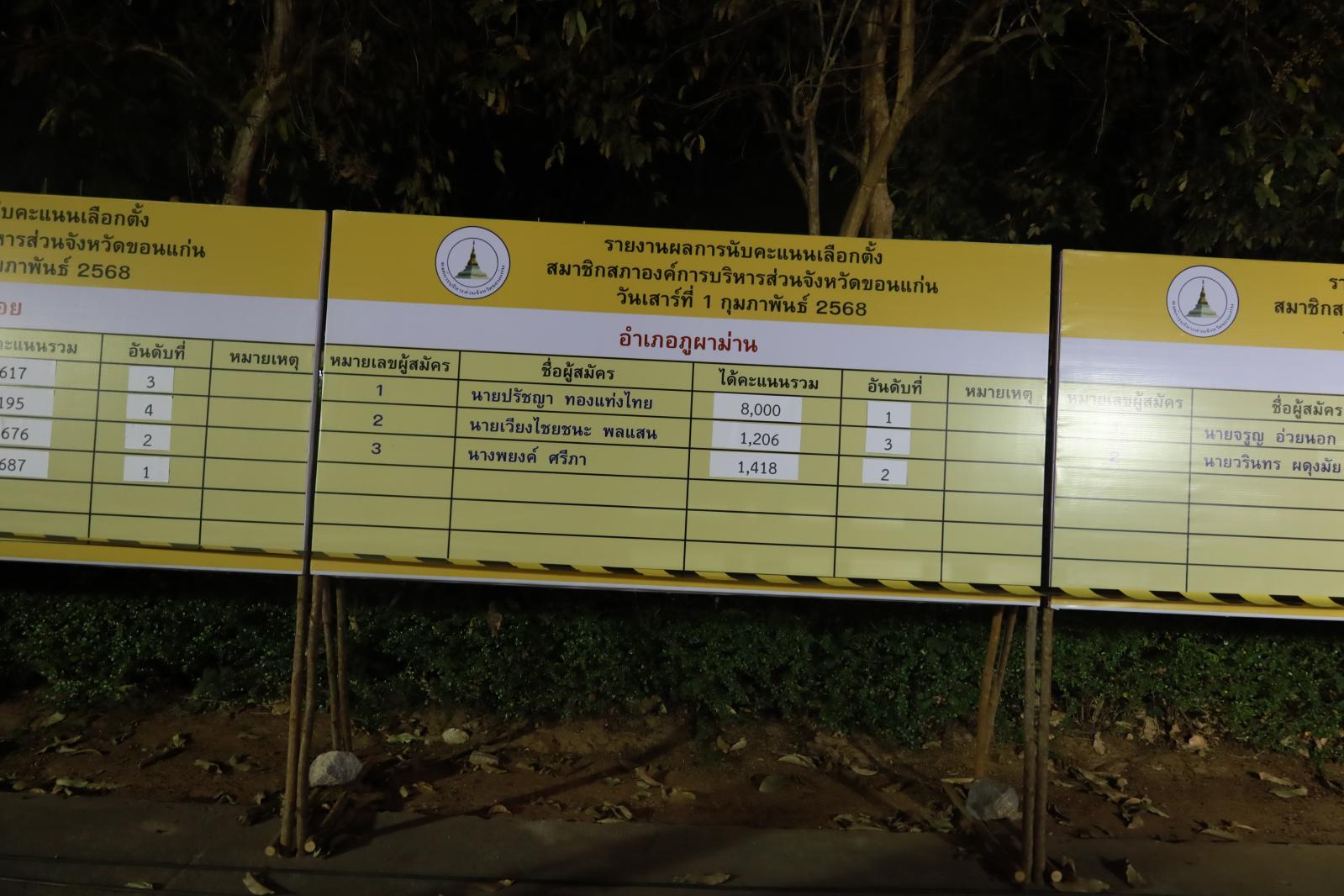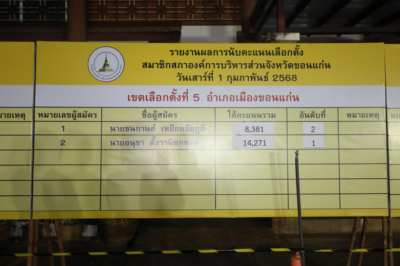 เมื่อวันที่ 1 กุมภาพันธ์ 2568 นายพันธ์เทพ เสาโกศล รองผู้ว่าราชการจังหวัดขอนแก่น ในฐานะประธานคณะกรรมการการเลือกตั้งนายกองค์การบริหารส่วนจังหวัดขอนแก่น ว่าที่ร้อยเอกพงเจตน์ พรกุณา ปลัดองค์การบริหารส่วนจังหวัดขอนแก่น ในฐานะผู้อำนวยการการเลือกตั้งประจำองค์การบริหารส่วนจังหวัดขอนแก่น นายวัชระ สีสาร ผู้อำนวยการสำนักงานคณะกรรมการเลือกตั้งประจำจังหวัดขอนแก่น พร้อมคณะกรรมการการเลือกตั้งประจำองค์การบริหารส่วนจังงหวัดขอนแก่น หัวหน้าส่วนราชการองค์การบริหารส่วนจังหวัดขอนแก่น ร่วมรับฟังการรายงานผลการนับคะแนนสมาชิกสภาองค์การบริหารส่วนจังหวัดขอนแก่น ณ ศูนย์ประสานงานการเลือกตั้งประจำจังหวัดขอนแก่น