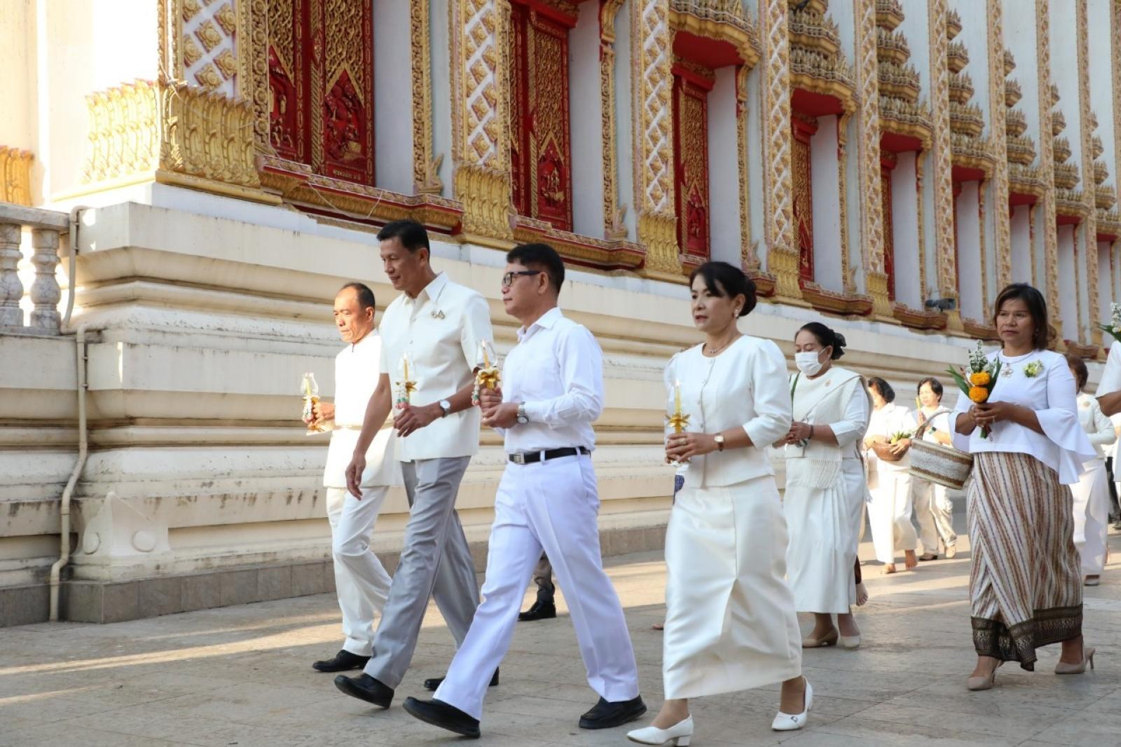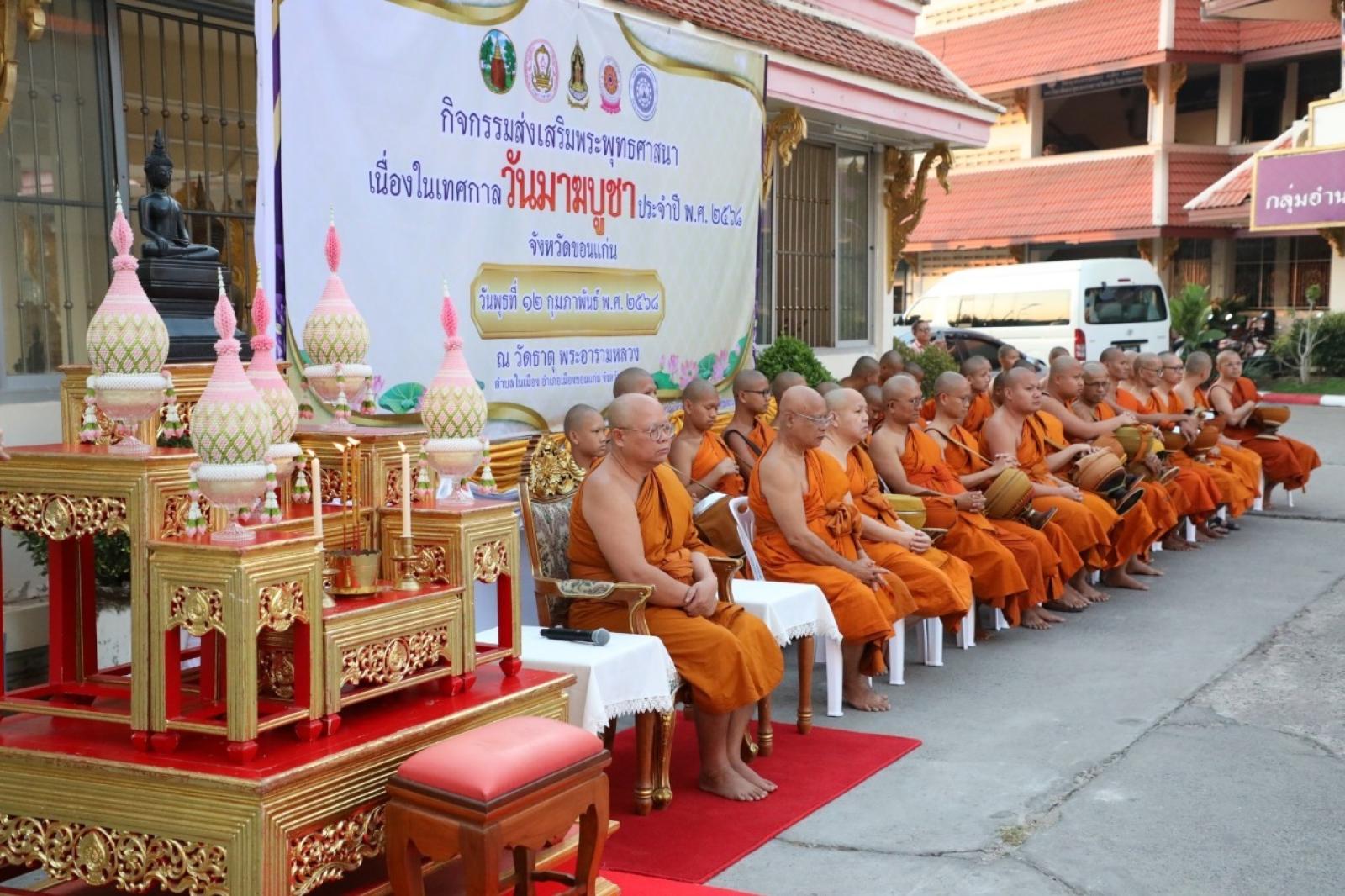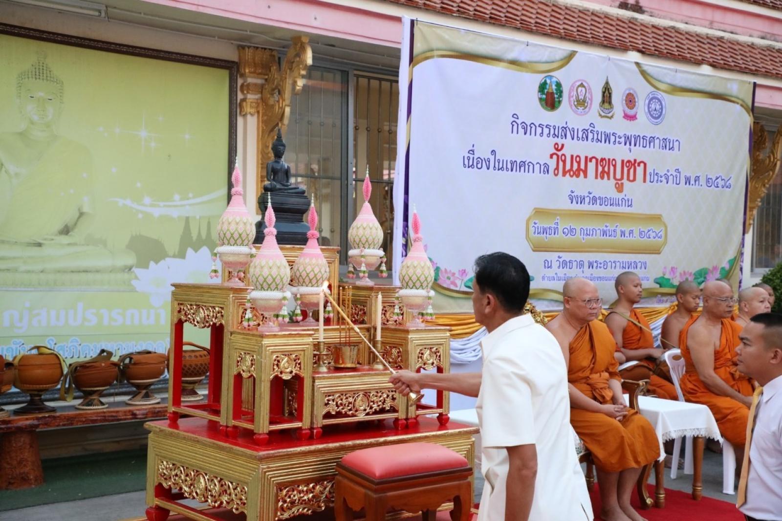 วันที่ 12 กุมภาพันธ์ 2568 เวลา 07.00 น. นายวัฒนา ช่างเหลา นายกองค์การบริหารส่วนจังหวัดขอนแก่น มอบหมายให้นางบุษกร ศรีสุวรรณ์ ผู้อำนวยการส่วนส่งเสริมการศึกษา ศาสนาและวัฒนธรรม พร้อมด้วยหัวหน้าส่วนราชการจากองค์การบริหารส่วนจังหวัดขอนแก่น เข้าร่วมกิจกรรมส่งเสริมพระพุทธศาสนา เนื่องในเทศกาลวันมาฆบูชา ประจำปี 2568 เพื่อส่งเสริมให้พุทธศาสนิกชนได้มีส่วนร่วมกิจกรรมทางพระพุทธศาสนา และกิจกรรมส่งเสริมคุณธรรม จริยธรรม ณ วัดธาตุ พระอารามหลวง ตำบลในเมือง อำเภอเมือง จังหวัดขอนแก่น โดยมีนายประจวบ รักแพทย์ รองผู้ว่าราชการจังหวัดขอนแก่น เป็นประธานในพิธี