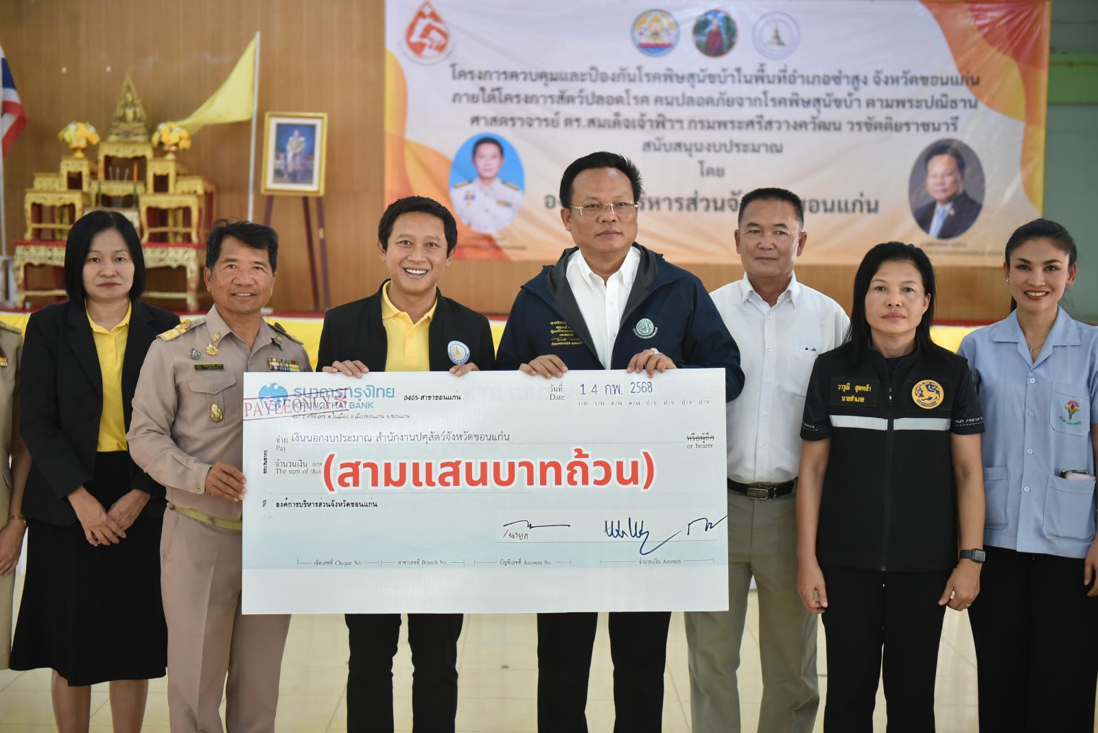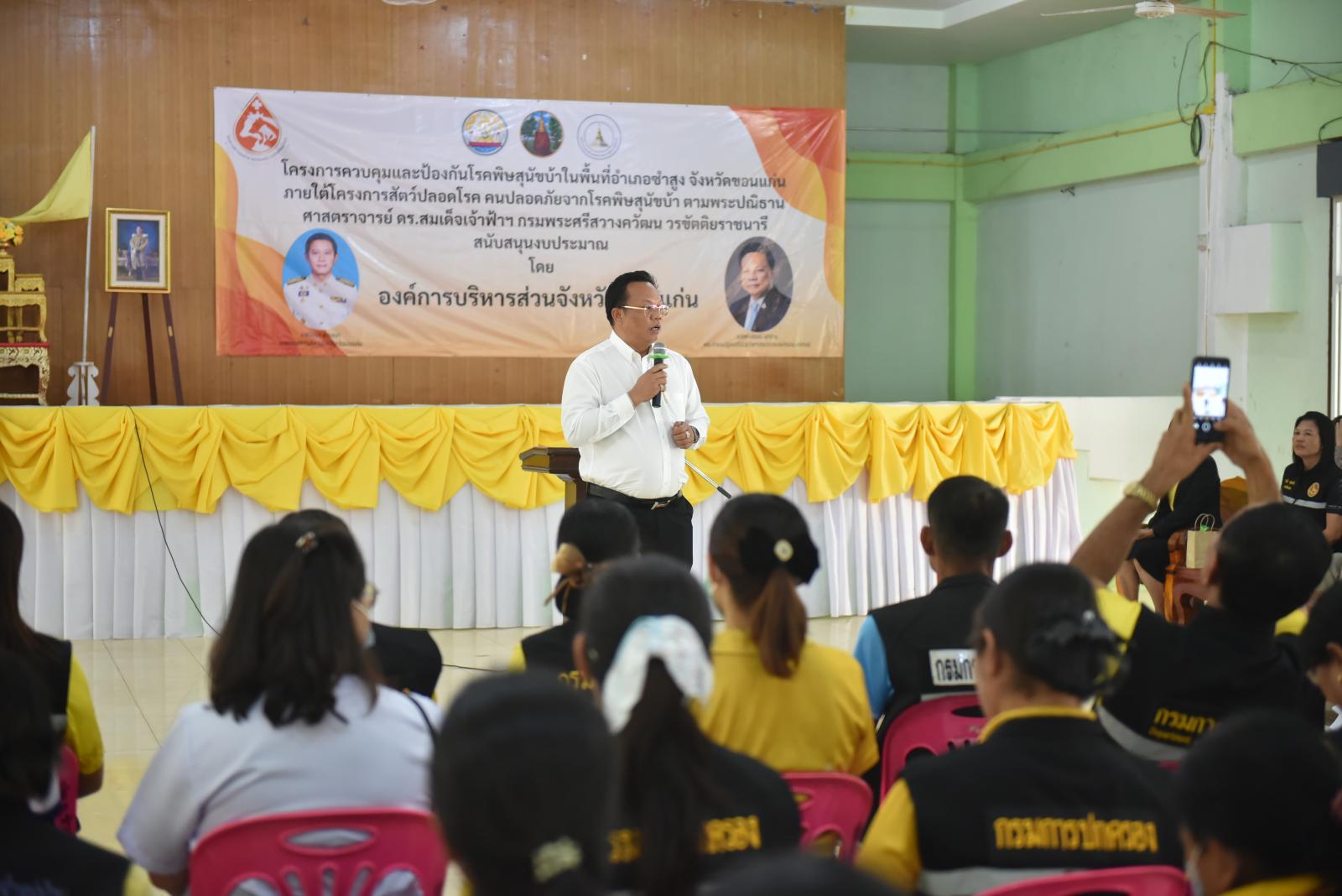 เมื่อวันที่ 17 กุมภาพันธ์ 2568 เวลา 14.00 น. นายวัฒนา ช่างเหลา นายก อบจ.ขอนแก่น เป็นประธานเปิดโครงการควบคุมและป้องกันโรคพิษสุนัขบ้าในพื้นที่อำเภอซำสูง จังหวัดขอนแก่น ภายใต้โครงการสัตว์ปลอดโรค คนปลอดภัยจากโรคพิษสุนัขบ้า ตามพระปณิธานศาสตราจารย์ ดร.สมเด็จเจ้าฟ้าฯ กรมพระศรีสวางควัฒน วรขัตติยราชนารี ซึ่งองค์การบริหารส่วนจังหวัดขอนแก่นสนับสนุนงบประมาณในการจัดโครงการนี้ จำนวน 300,000 บาท โดยมี นางวารุณี สุดหล้า นายอำเภอซำสูง กล่าวต้อนรับ นายชาญประเสริฐ พลซา ปศุสัตว์จังหวัดขอนแก่น กล่าวรายงาน ในโอกาสนี้มี นายพงศกรณ์ เสาร์ทน คณะทำงานรัฐมนตรีช่วยว่าการกระทรวงเกษตรและสหกรณ์, นางสาวนิศากร ดอนกระสินธุ์ ผอ.กองสาธารณสุข อบจ.ขอนแก่น กำนัน ผู้ใหญ่บ้าน ในพื้นที่อำเภอซำสูงอ.เมืองขอนแก่น จ.ขอนแก่น