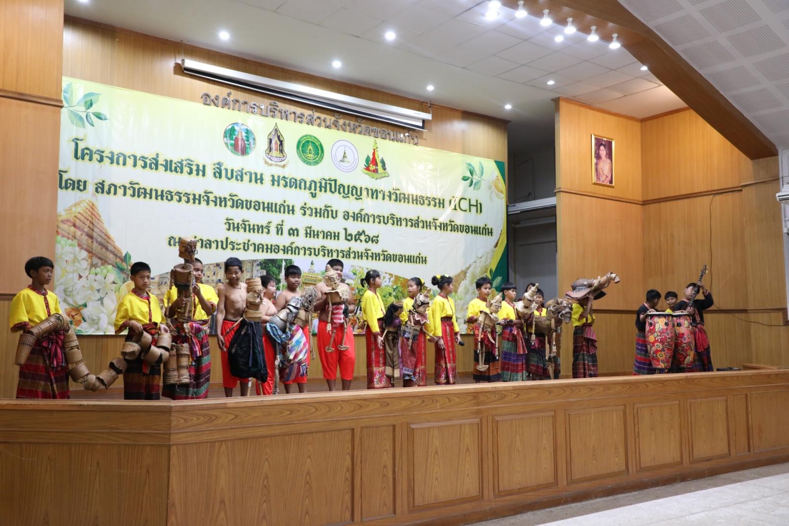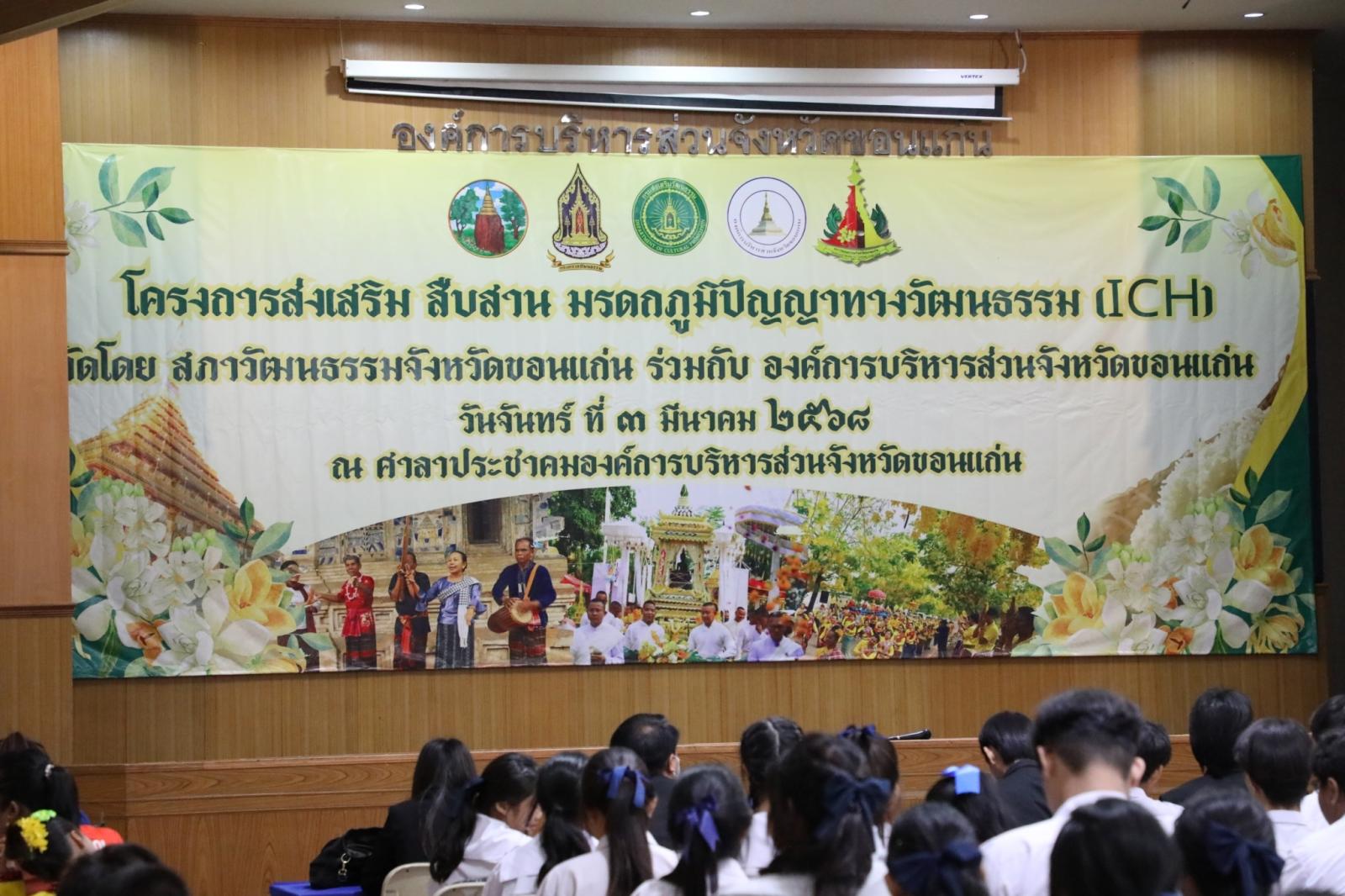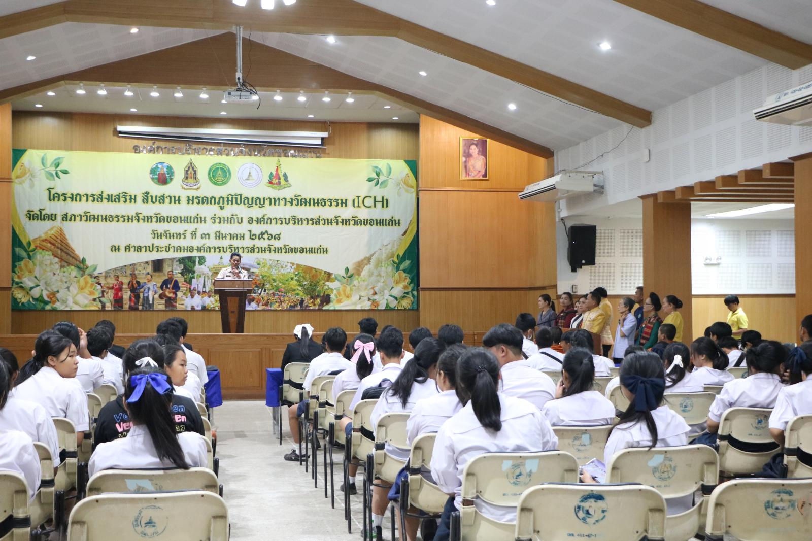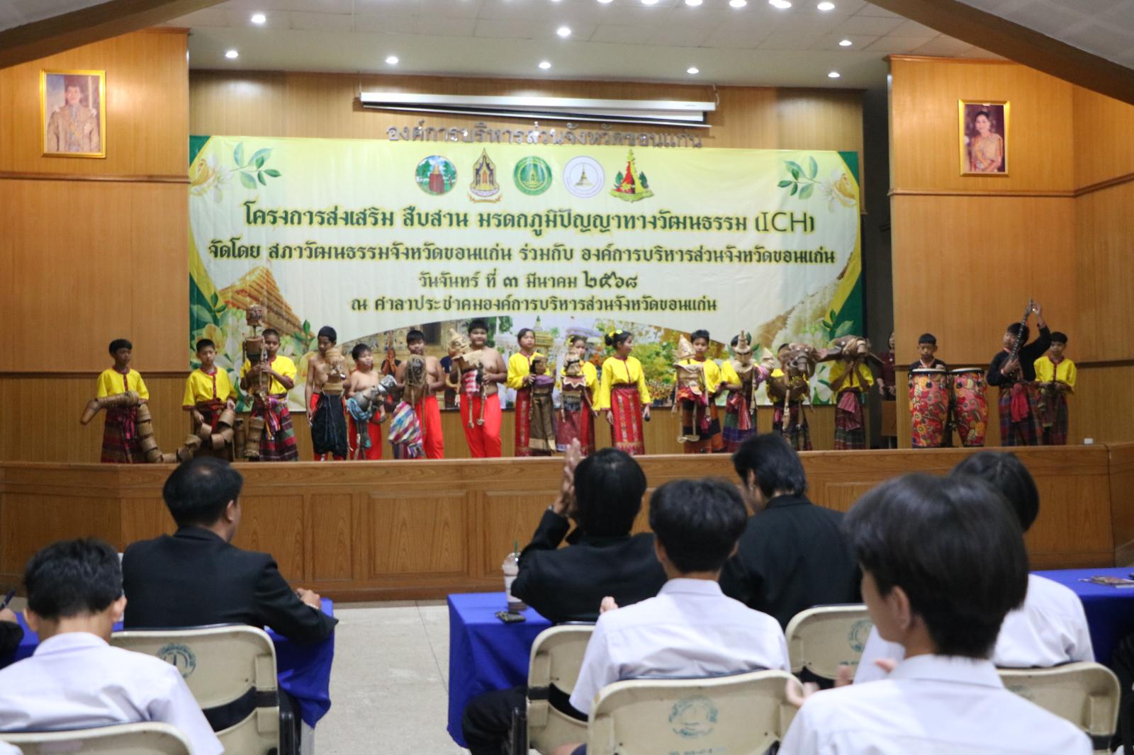 เมื่อวันที่ 3 มีนาคม 2568 เวลา 09.30 น. องค์การบริหารส่วนจังหวัดขอนแก่น นำโดย นายวัฒนา ช่างเหลา นายกองค์การบริหารส่วนจังหวัดขอนแก่น มอบหมายให้ นายอดุลย์ คามดิษฐ์ รองนายกองค์การบริหารส่วนจังหวัดขอนแก่น เป็นประธาน ในพิธีเปิดโครงการส่งเสริม สืบสาน มรดกภูมิปัญญาทางวัฒนธรรม (ICH) โดยมี ดร.เรืองยศ แวดล้อม รองประธานสภาวัฒนธรรม เป็นผู้กล่าวรายงานถึงวัตถุประสงค์ของโครงการ เพื่อปลูกฝังจิตสำนึกแก่เครือข่ายวัฒนธรรมให้เห็นคุณค่าของมรดกภูมิปัญญาทางวัฒนธรรม อีกทั้งเสริมสร้างภูมิคุ้มกันให้เด็กและเยาวชนให้มีคุณธรรมจริยธรรมเป็นคนดีของสังคม ตลอดจนเผยแพ่มรดกทางวัฒนธรรม ภาษาไทยและภาษาถิ่นภูมิปัญญาท้องถิ่น รวมทั้งความหลากหลายของศิลปวัฒนธรรมไทย การเรียนรู้ สร้างความภูมิใจในประวัติศาสตร์และความเป็นไทยให้คงอยู่สืบไป ในโอกาสนี้มีนางบุษกร ศรีสุวรรณ์ ผู้อำนวยการส่วนส่งเสริมการศึกษา ศาสนาและวัฒนธรรม แขกผู้มีเกียรติ คณะผู้บริหาร คณะวิทยากร คณะนักเรียนจากโรงเรียนศรีจันทร์ เข้าร่วมงาน ณ ศาลาประชาคมองค์การบริหารส่วนจังหวัดขอนแก่น