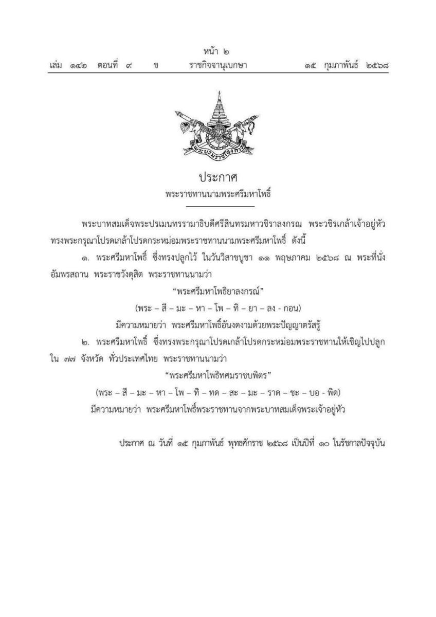 สำหรับ พระศรีมหาโพธิ์ ที่ทรงพระกรุณาโปรดเกล้าโปรดกระหม่อมพระราชทานให้เชิญไปปลูกใน ๗๗ จังหวัดทั่วประเทศ พระราชทานนามว่า“พระศรีมหาโพธิทศมราชบพิตร” (พระ - สี - มะ - หา - โพ - ทิ - ทด - สะ - มะ - ราด - ชะ - บอ - พิด) มีความหมายว่า พระศรีมหาโพธิ์พระราชทานจากพระบาทสมเด็จพระเจ้าอยู่หัว ส่วนพระศรีมหาโพธิ์ ที่จะทรงปลูกในวันวิสาขบูชา 11 พฤษภาคม 2568 ณ พระที่นั่งอัมพรสถาน พระราชวังดุสิต พระราชทานนามว่า “พระศรีมหาโพธิยาลงกรณ์” (พระ - สี - มะ - หา - โพ - ทิ - ยา - ลง - กอน) มีความหมายว่า พระศรีมหาโพธิ์อันงดงามด้วยพระปัญญาตรัสรู้