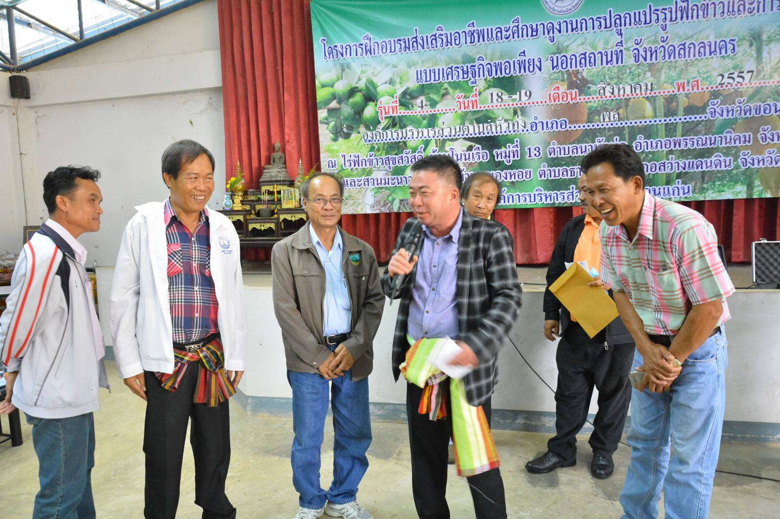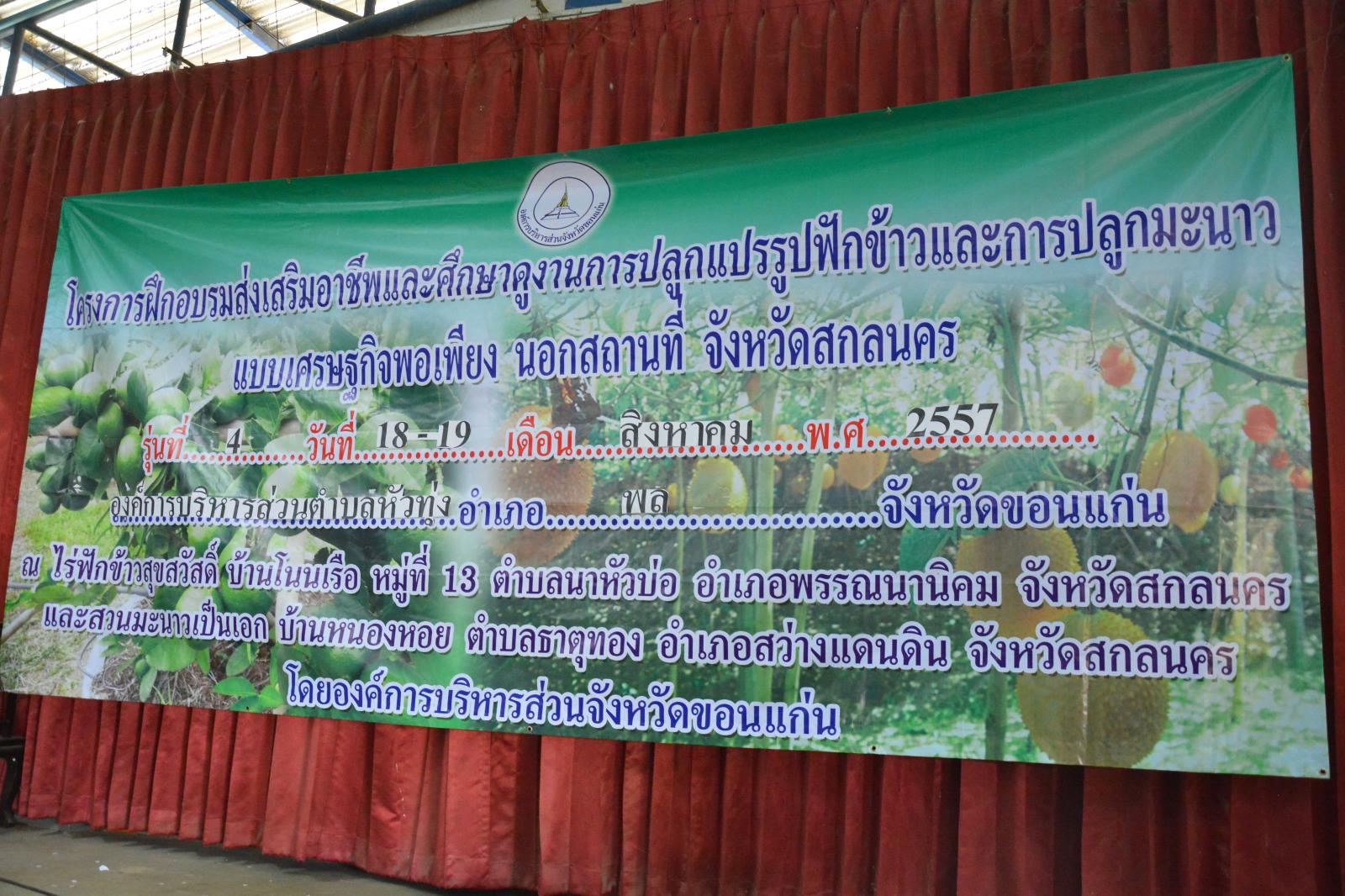 เมื่อวันที่ 19 สิงหาคม 2557 ที่ห้องประชุมองค์การบริหารส่วนตำบลหัวทุ่ง อำเภอพล จังหวัดขอนแก่น ดร.พงษ์ศักดิ์ ตั้งวานิชกพงษ์ นายกองค์การบริหารส่วนจังหวัดขอนแก่น เป็นประธานเปิดโครงการฝึกอบรมส่งเสริมอาชีพ และศึกษาดูงานการปลูกแปรรูปฟักข้าวและการปลูกมะนาว แบบเศรษฐกิจพอเพียงนอกสถานที่ ณ ไร่ฟักข้าวสุขสวัสดิ์ บ้านโนนเรือ หมู่ที่ 13 ตำบลนาหัวบ่อ อำเภอพรรณนานิคม และสวนมะนาวเป็นเอก บ้านหนองหอย ตำบลธาตุทอง อำเภอสว่างแดนดิน จังหวัดสกลนคร โดยมี นายเดชคำรณ สิงคลีบุตร ส.อบจ.ขอนแก่น อ.บ้านไผ่ เขต 1 นายอดุลย์ คามดิษฐ์ ส.อบจ.ขอนแก่น อ.ชนบท นายคจิตร พงษ์คำพันธ์ และ นายคงฤทธิ์ อัศวพัฒนากูล ส.อบจ.ขอนแก่น เขต อ.พล พร้อมคณะให้การต้อนรับ