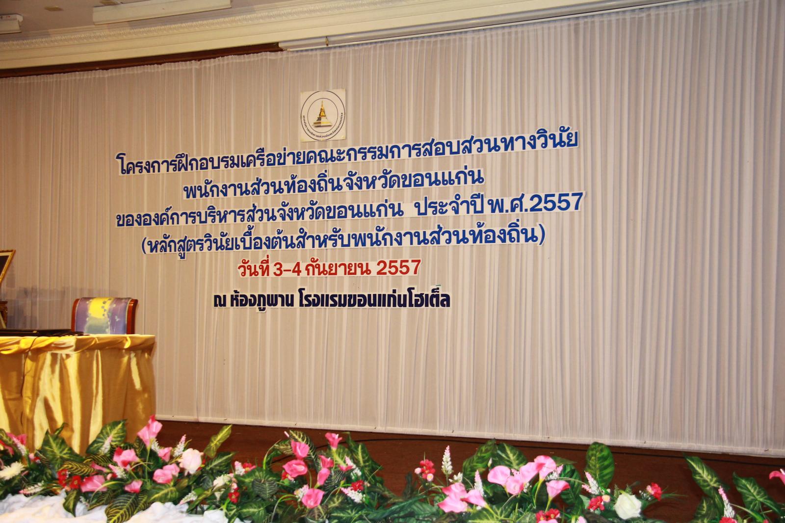 องค์การบริหารส่วนจังหวัดขอนแก่น จัดโครงการ “ฝึกอบรมเครือข่ายคณะกรรมการสอบสวนทางวินัยพนักงานส่วนท้องถิ่นจังหวัดขอนแก่น” (หลักสูตรวินัยเบื้องต้นสำหรับพนักงานส่วนท้องถิ่น) ขององค์การบริหารส่วนจังหวัดขอนแก่น ประจำปีงบประมาณ ๒๕๕๗ ระหว่างวันที่ ๓ - ๔ กันยายน ๒๕๕๗ โดยได้จัดทำพิธีเปิดโครงการ ในวันที่ ๓ กันยายน ๒๕๕๗ เวลา๐๙.๐๐ น. ณ ห้องภูพาน โรงแรมขอนแก่นโฮเต็ล จังหวัดขอนแก่น และได้รับเกียรติจากนายพงษ์ศักดิ์ ตั้งวานิชกพงษ์ นายกองค์การบริหารส่วนจังหวัดขอนแก่น เป็นประธานในพิธีเปิด สำหรับผู้ที่เข้าอบรมประกอบด้วย ปลัดและบุคลากรขององค์กรปกครองส่วนท้องถิ่น ในเขตจังหวัดขอนแก่นจำนวน ๑๕๕ คน มีวัตถุประสงค์เพื่อให้ ผู้ที่ผ่านการฝึกอบรมมีความรู้ความเข้าใจพื้นฐานเกี่ยวกับเรื่องวินัยและการรักษาวินัยของข้าราชการและเป็นผู้ที่มีวินัยในการปฏิบัติราชการดีขึ้น ตลอดจนเกิดการประสานความร่วมมือระหว่างผู้แทนเครือข่ายวินัยจังหวัดขอนแก่นกับผู้เข้ารับการฝึกอบรมเพื่อประโยชน์ในการแลกเปลี่ยนเรียนรู้ในการนำไปใช้ประโยชน์ในการปฏิบัติราชการต่อไป