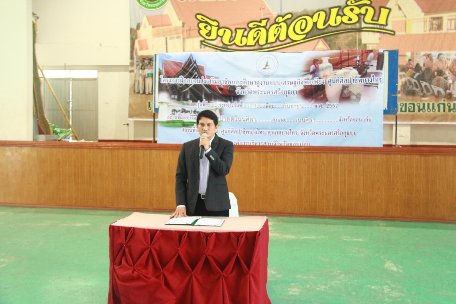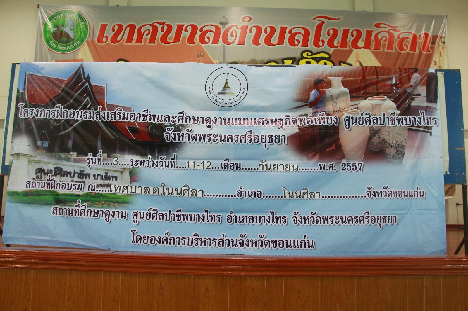 ในวันที่ 15 กันยายน 2557 นายก อบจ.ขอนแก่น ดร.พงษ์ศักดิ์ ตั้งวานิชกพงษ์ มอบหมายให้ รองนายก อบจ.ขอนแก่น นายสิทธิกุล ภูคำวงศ์ เป็นประธานในพิธีเปิดโครงการ “ฝึกอบรมส่งเสริมอาชีพและศึกษาดูงานแบบเศรษฐกิจพอเพียง” ณ ศูนย์ศิลปาชีพบางไทร อ.บางไทร จ.พระนครศรีอยุธยา โดยมี ส.อบจ.ขอนแก่น เขต อ.แวงใหญ่ นายทองสุข ธนูรัตน์ และ ส.อบจ.ขอนแก่น เขต อ.โนนศิลา นายศรัญ กสิกิจวรกุล ร่วมเป็นเกียรติในพิธี วัตถุประสงค์ในการฝึกอบรมเพื่อสร้างความรู้ ความเข้าใจ การดำเนินชีวิตตามหลักปรัชญาเศรษฐกิจพอเพียงให้เกษตรกร ได้เรียนรู้ การฝึกอบรมอาชีพจากศูนย์ฝึกอาชีพ และสามารถพัฒนาเป็นอาชีพของตนเองให้ดีขึ้น ณ เทศบาลตำบลโนนศิลา อ.โนนศิลา จ.ขอนแก่น