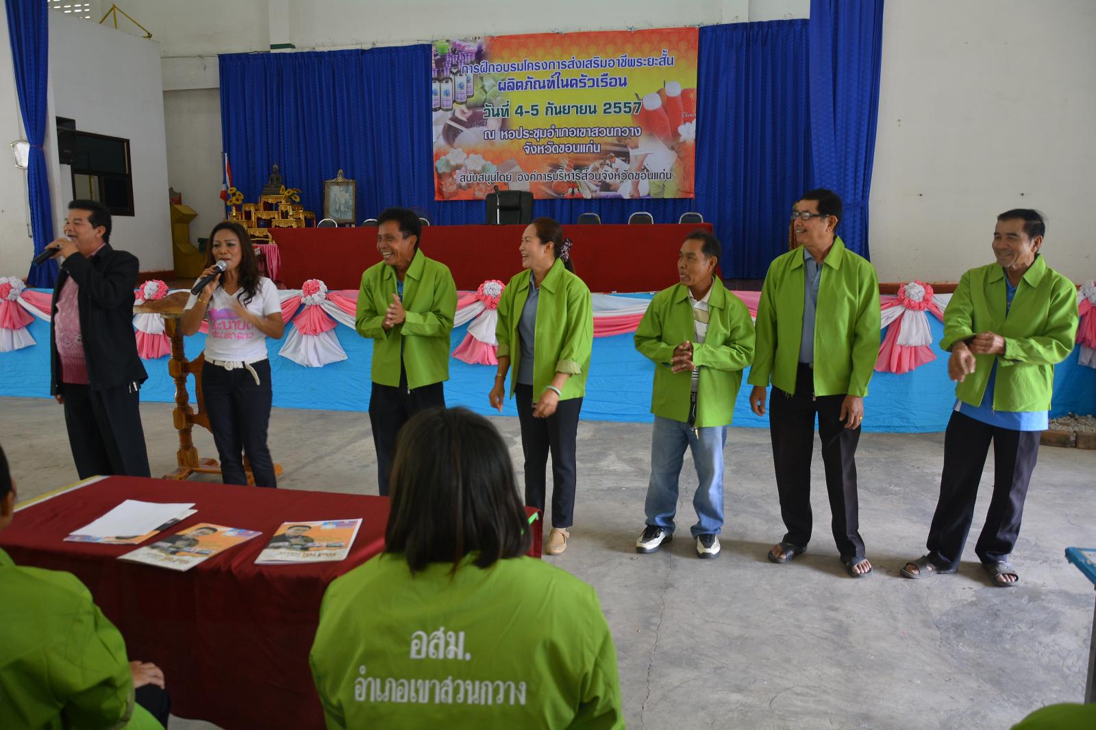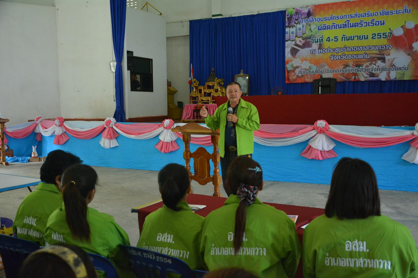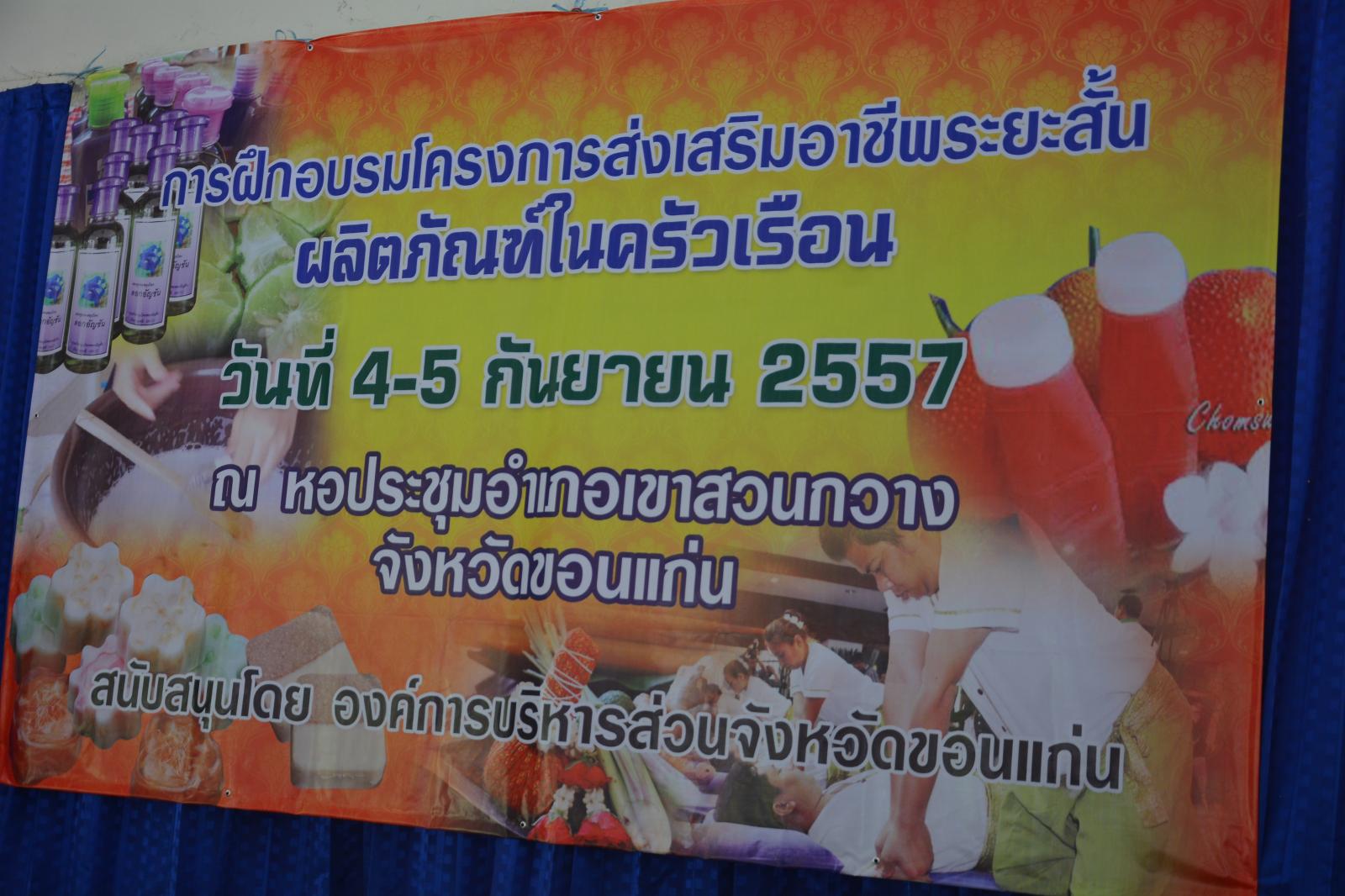 เมื่อวันที่ 4 กันยายน 2557 นายกองค์การบริหารส่วนจังหวัดขอนแก่น ดร.พงษ์ศักดิ์ ตั้งวานิชกพงษ์ เป็นประธานเปิดโครงการระยะสั้น ผลิตภัณฑ์ในครัวเรือน ที่หอประชุมอำเภอเขาสวนกวาง โดยมี ส.อบจ.ขอนแก่น อ.เขาสวนกวาง นายสมศักดิ์ ลี้ตระกูล และ ส.อบจ.ขอนแก่น อ.บ้านไผ่ เขต 1 นายเดชคำรณ สิงคลีบุตร ลงพื้นที่อำเภอเขาสวนกวาง จังหวัดขอนแก่น โดยโครงการดังกล่าวมีวัตถุประสงค์ เพื่อพัฒนาความรู้และทักษะในอาชีพต่างๆให้แก่ประชาชน เยาวชน และผู้สนใจ เพื่อให้สามารถนำไปเป็นอาชีพเสริมก่อให้เกิดรายได้ต่อครอบครัวต่อไป เพื่อให้ผู้เข้าร่วมโครงการใช้เวลาว่างให้เกิดประโยชน์ เป็นการร่วมกันคิด กันทำและร่วมพัฒนา ก่อให้เกิดความรักความสามัคคีในชุมชน เพื่อให้ผู้เข้ารับการอบรมมีความรู้สามารถเผยแพร่ให้กับผู้สนใจต่อไปได้ ซึ่งในครั้งนี้เป็นการจัดฝึกอบรมหลักสูตรระยะสั้น โดยอบรมทั้งภาคทฤษฎีและภาคปฏิบัติ
