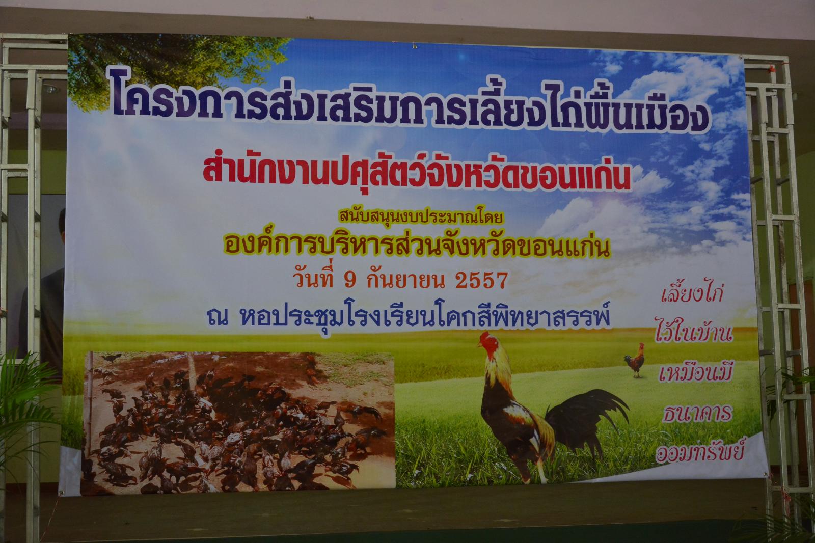 เมื่อวันที่ 9 กันยายน 2557 นายกองค์การบริหารส่วนจังหวัดขอนแก่น ดร.พงษ์ศักดิ์ ตั้งวานิชกพงษ์ เป็นประธานเปิดโครงการส่งเสริมการเลี้ยงไก่พื้นเมือง โดยมี ส.อบจ.ขอนแก่น อ.เมือง เขต 6 นายสุดใจ ทุยบึงฉิม ปศุสัตว์อำเภอเมืองขอนแก่น นายโสภณ ภูมิทัต ให้การต้อนรับ โครงการดังกล่าวจัดขึ้นเพื่อสร้างอาชีพแก่เกษตรกรและผลิตอาหาร โปรตีน ให้เพียงพอต่อการบริโภค มีเกษตรกร จากตำบลโคกสี ตำบลบึงเนียม ตำบลพระลับ และตำบลหนองตูม อำเภอเมือง จังหวัดขอนแก่น รวมจำนวน 200 คน เข้าร่วมโครงการ ณ โรงเรียนโคกสีพิทยาสรรพ์ อำเภอเมือง จังหวัดขอนแก่น