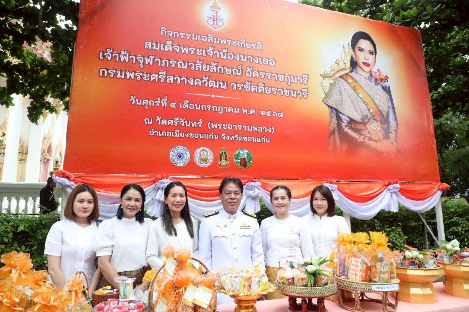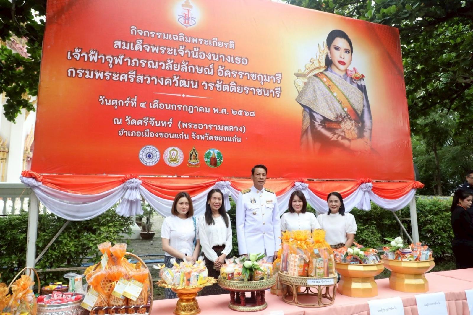 เมื่อวันที่ 4 กรกฎาคม 2568 เวลา 07.00 น องค์การบริหารส่วนจังหวัดขอนแก่น นำโดย นายวัฒนา ช่างเหลา นายกองค์การบริหารส่วนจังหวัดขอนแก่น มอบหมายให้ นายสอิสร์ โบราณ ที่ปรึกษานายกองค์การบริหารส่วนจังหวัดขอนแก่น พร้อมด้วย นางบุษกร ศรีสุวรรณ์ ผู้อำนวยการส่วนส่งเสริมการศึกษา ศาสนาและวัฒนธรรม และเจ้าหน้าที่จากสำนักการศึกษาฯเข้าร่วมกิจกรรมเฉลิมพระเกียรติสมเด็จพระเจ้าน้องนางเธอ เจ้าฟ้าจุฬาภรณวลัยลักษณ์ อัครราชกุมารี กรมพระศรีสวางควัฒน วรขัตติยราชนารี 4 กรกฎาคม โดยกำหนดกิจกรรม ดังนี้ พิธีทำบุญตักบาตร พิธีเจริญพระพุทธมนต์ และพิธีลงนามถวายพระพรชัยมงคลเวลาโดยมี นายไกรสร กองฉลาด ผู้ว่าราชการจังหวัดขอนแก่น เป็นประธานในพิธี ณ วัดศรีจันทร์ พระอารามหลวง ตำบลในเมือง อำเภอเมืองขอนแก่น