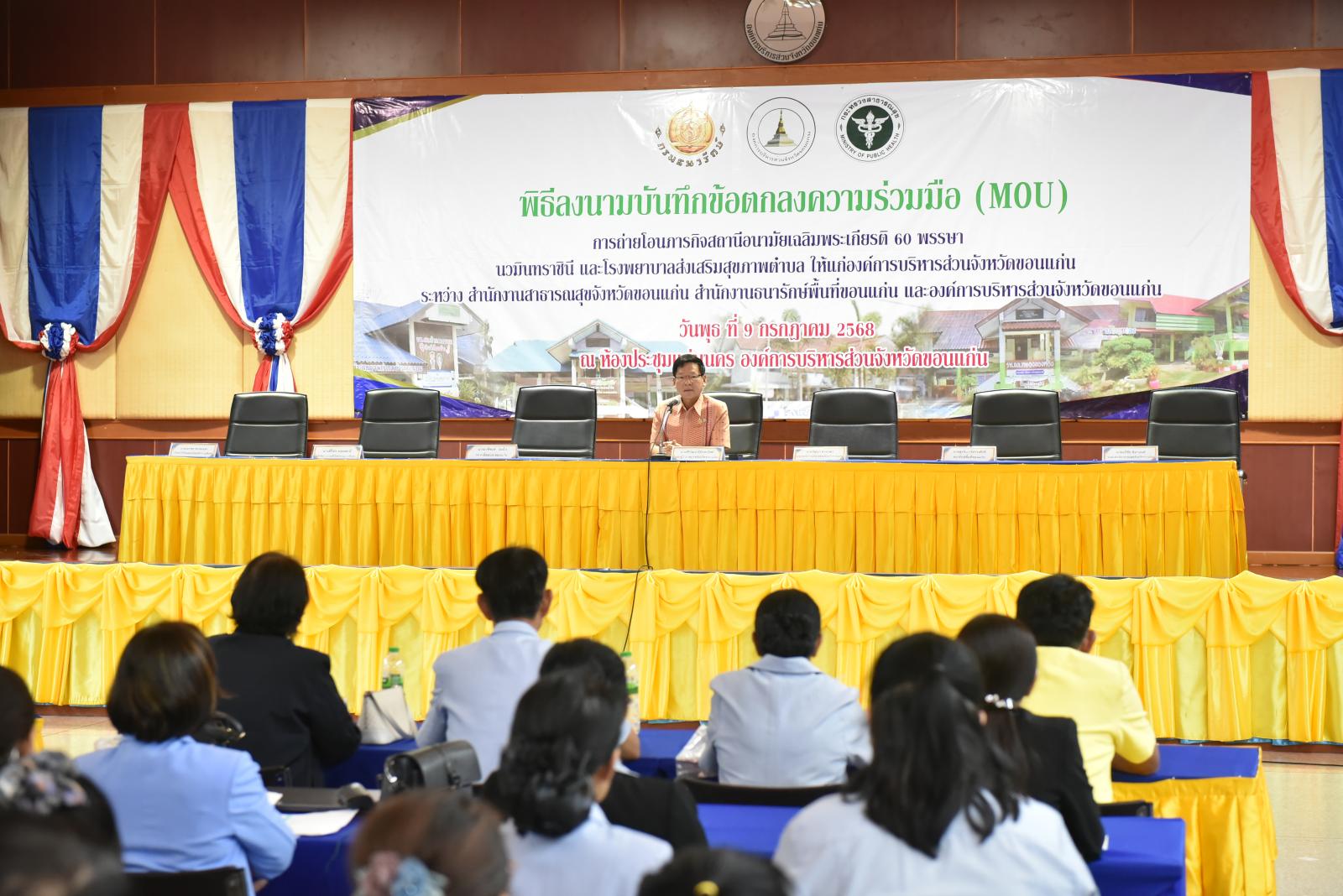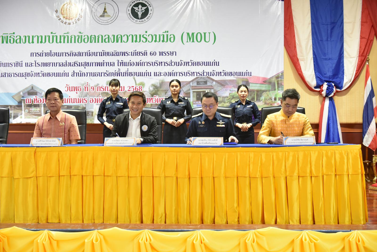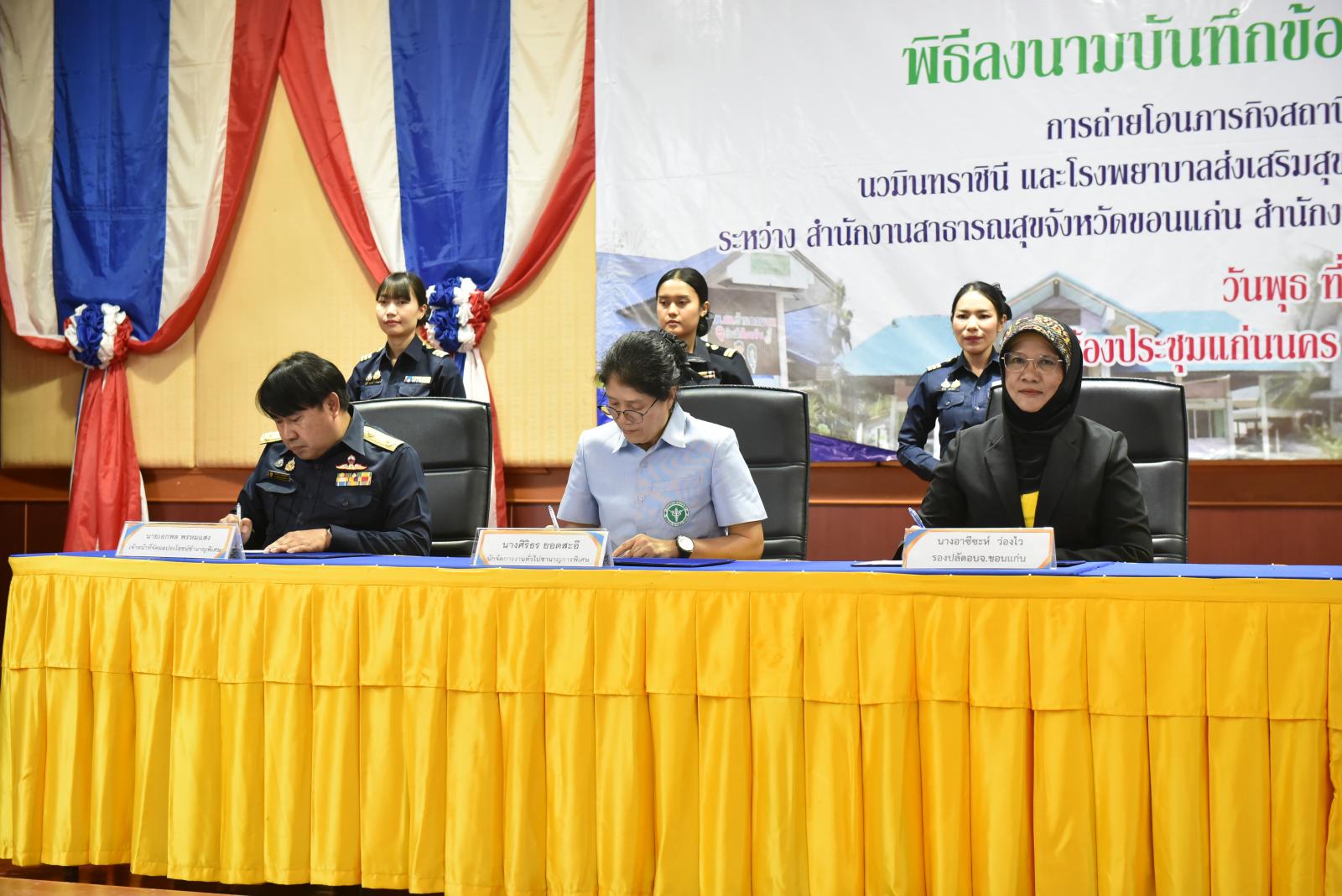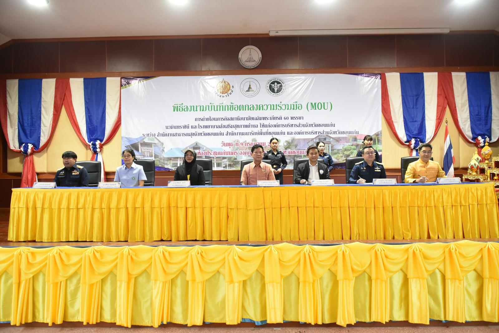 พิธีลงนามบันทึกข้อตกลงความร่วมมือ (MOU) การถ่ายโอนภารกิจสถานีอนามัยเฉลิมพระเกียรติ 60 พรรษา นวมินทราชินี และโรงพยาบาลส่งเสริมสุขภาพตำบล ระหว่าง สำนักงานสาธารณสุขจังหวัดขอนแก่น สำนักงานธนารักษ์พื้นที่ขอนแก่น และองค์การบริหารส่วนจังหวัดขอนแก่น