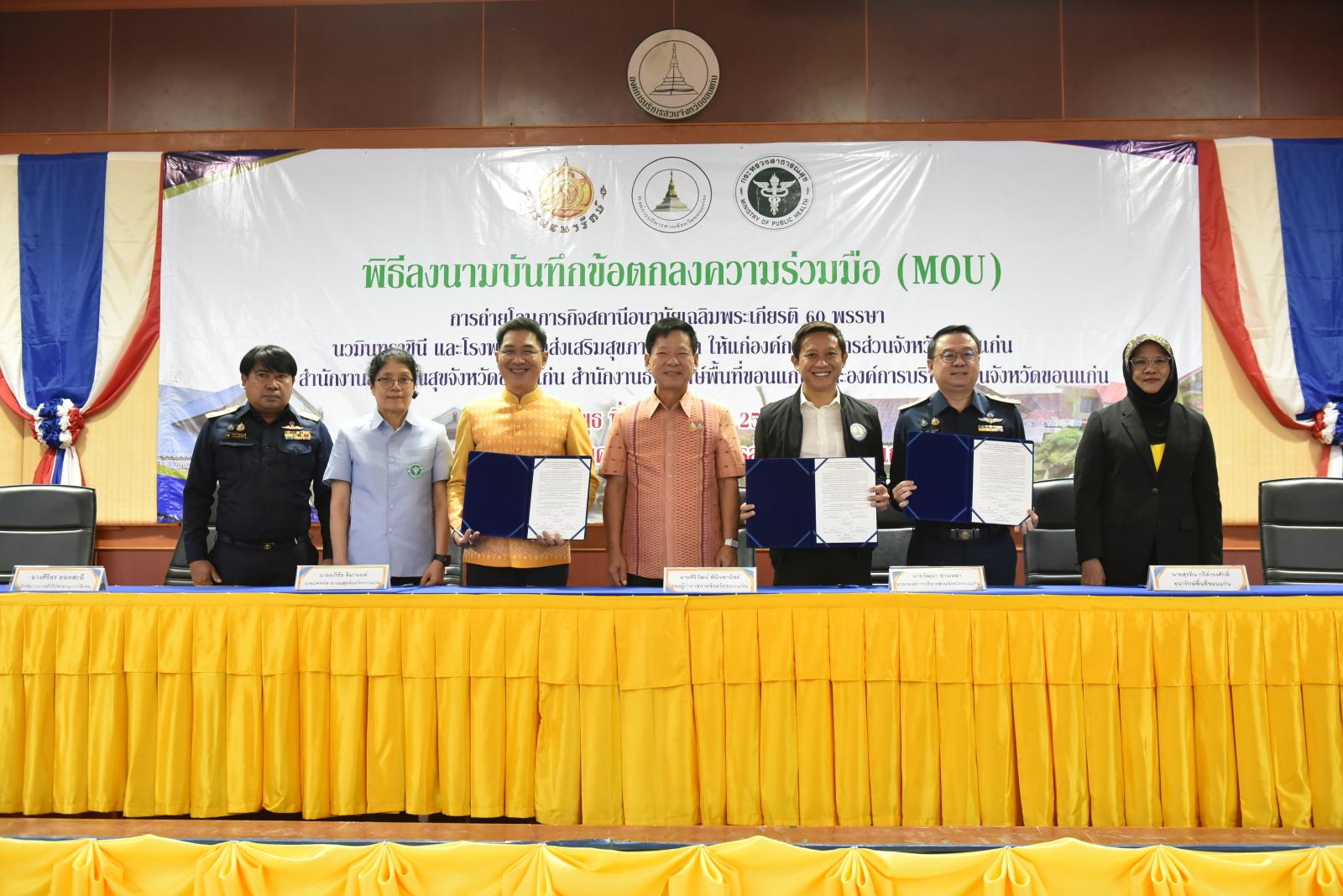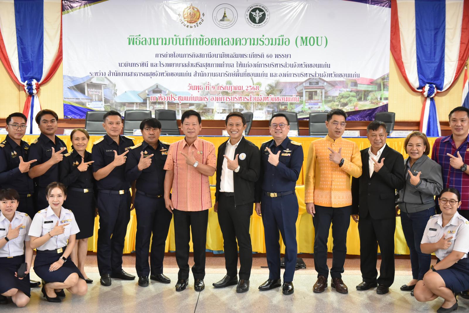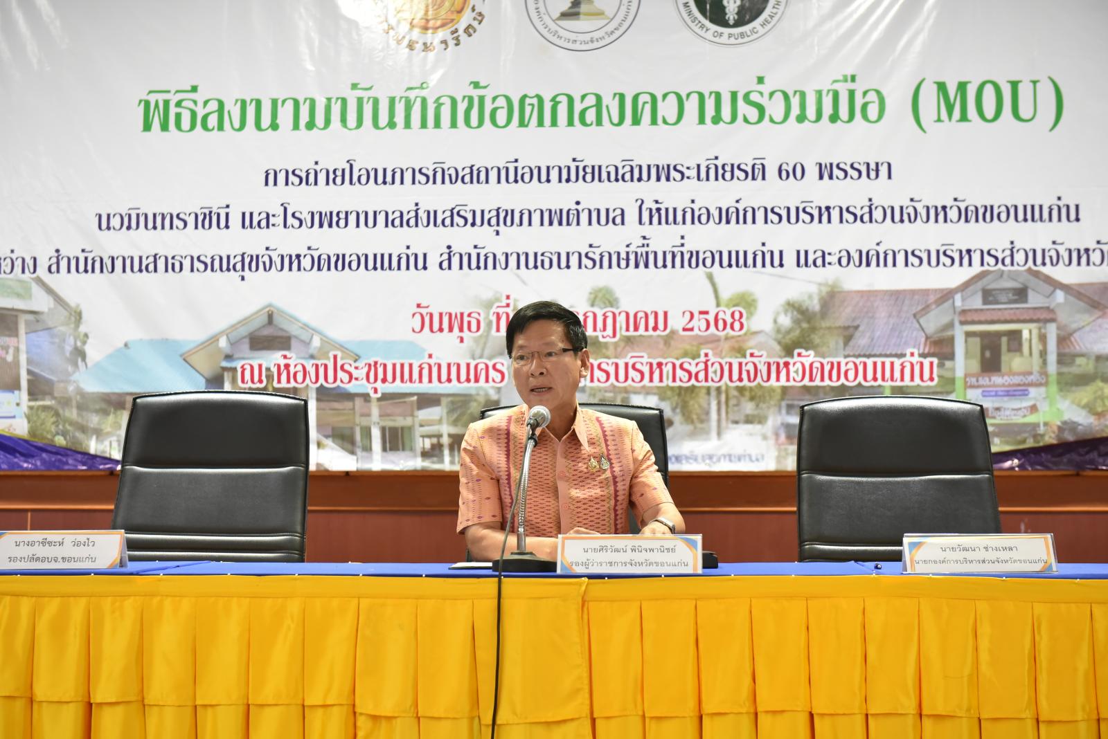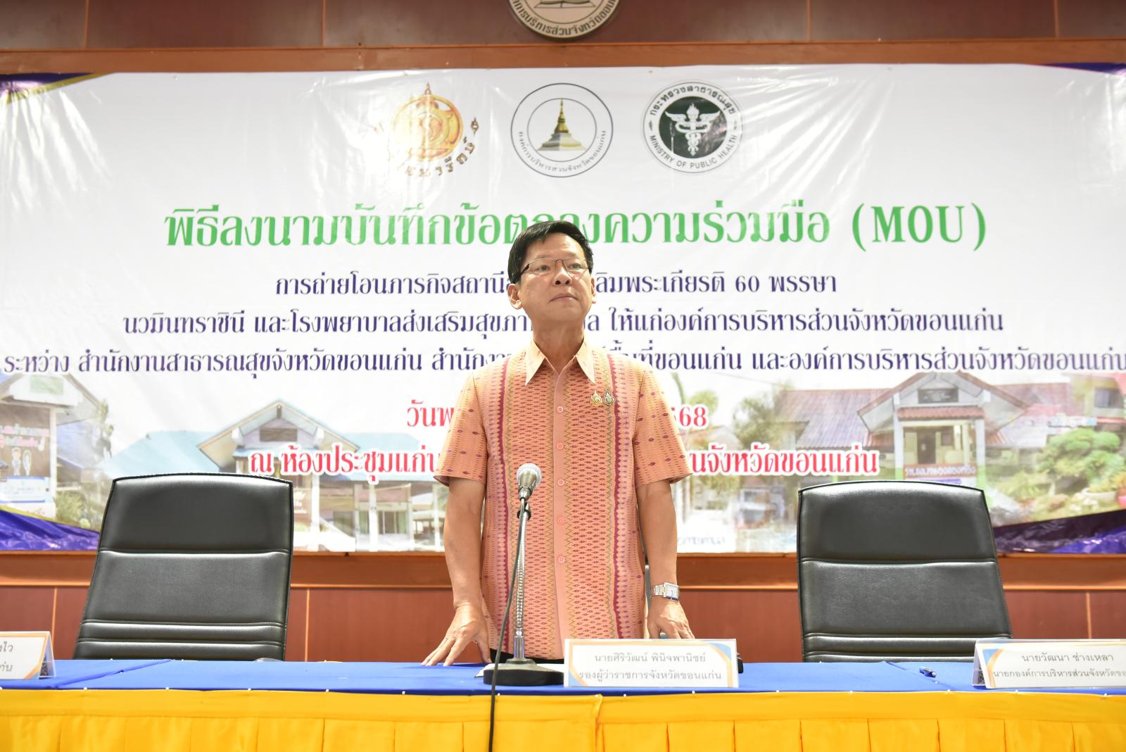 พิธีลงนามบันทึกข้อตกลงความร่วมมือ (MOU) การถ่ายโอนภารกิจสถานีอนามัยเฉลิมพระเกียรติ 60 พรรษา นวมินทราชินี และโรงพยาบาลส่งเสริมสุขภาพตำบล ระหว่าง สำนักงานสาธารณสุขจังหวัดขอนแก่น สำนักงานธนารักษ์พื้นที่ขอนแก่น และองค์การบริหารส่วนจังหวัดขอนแก่น