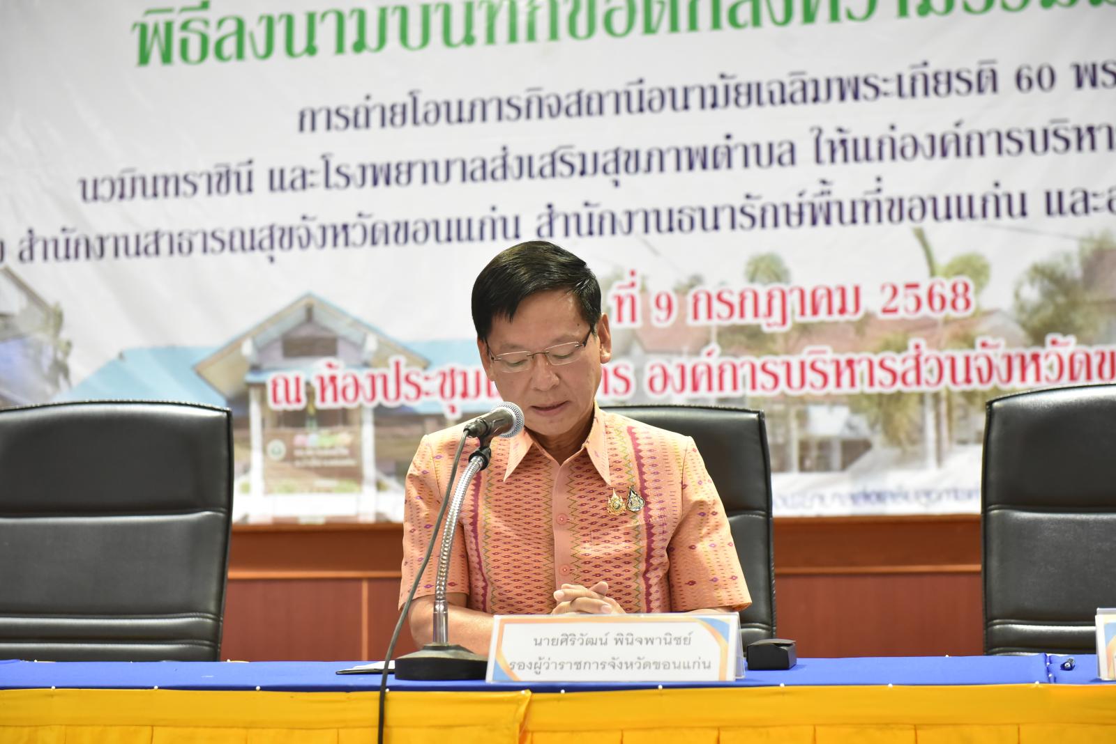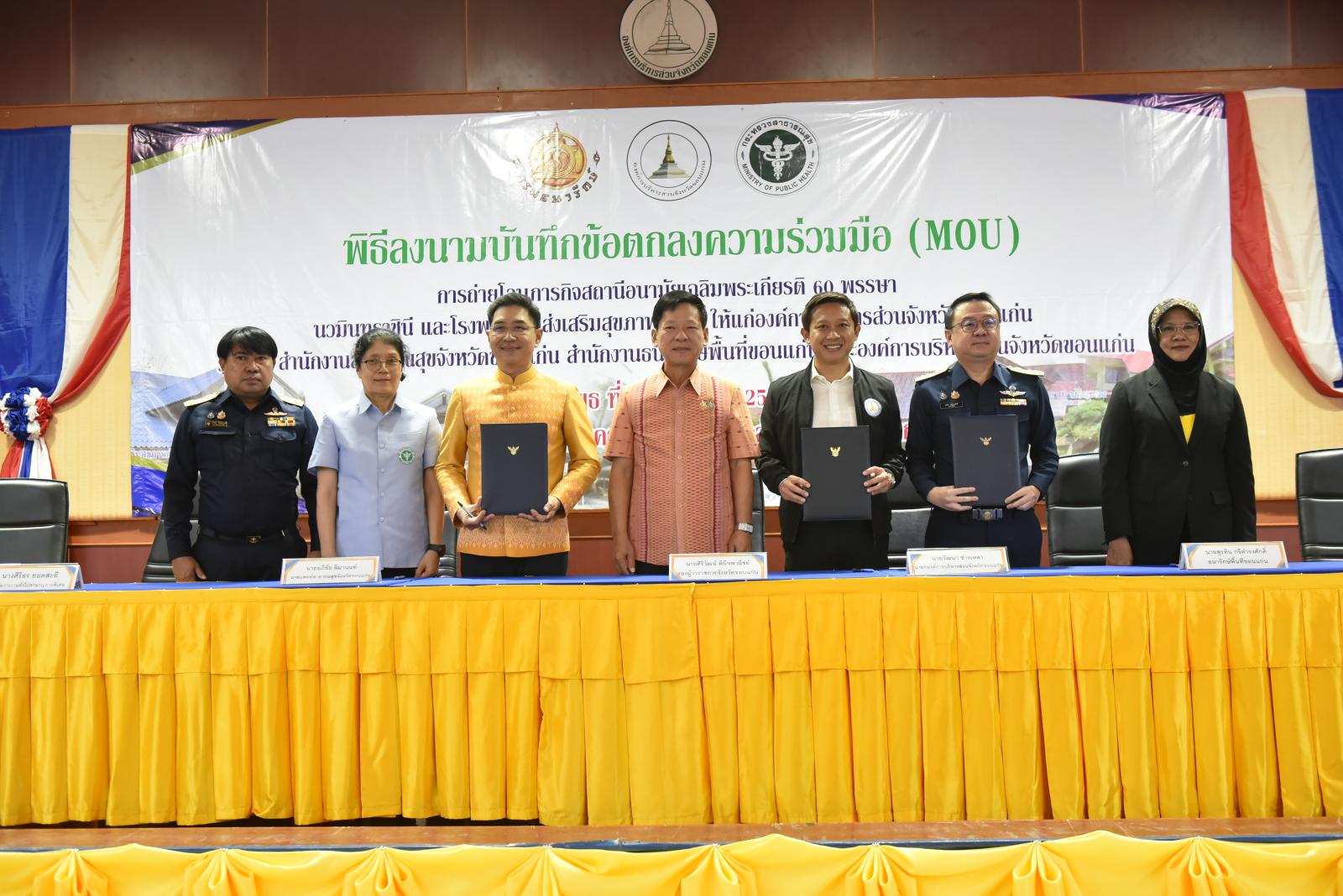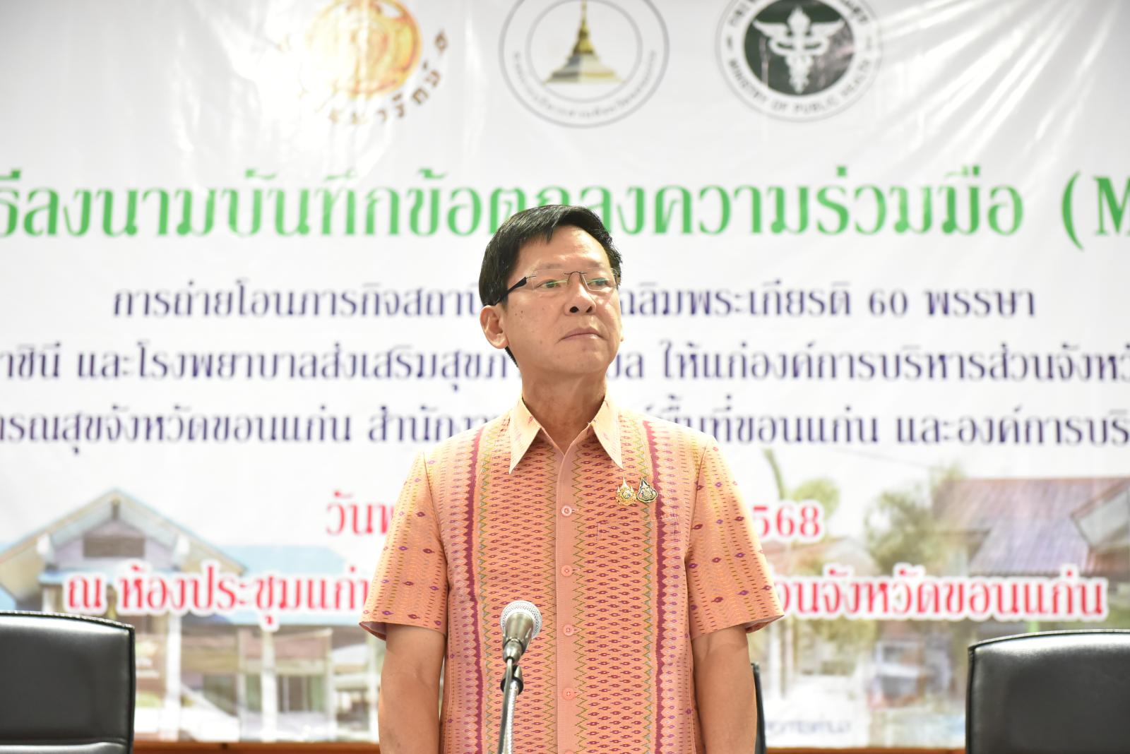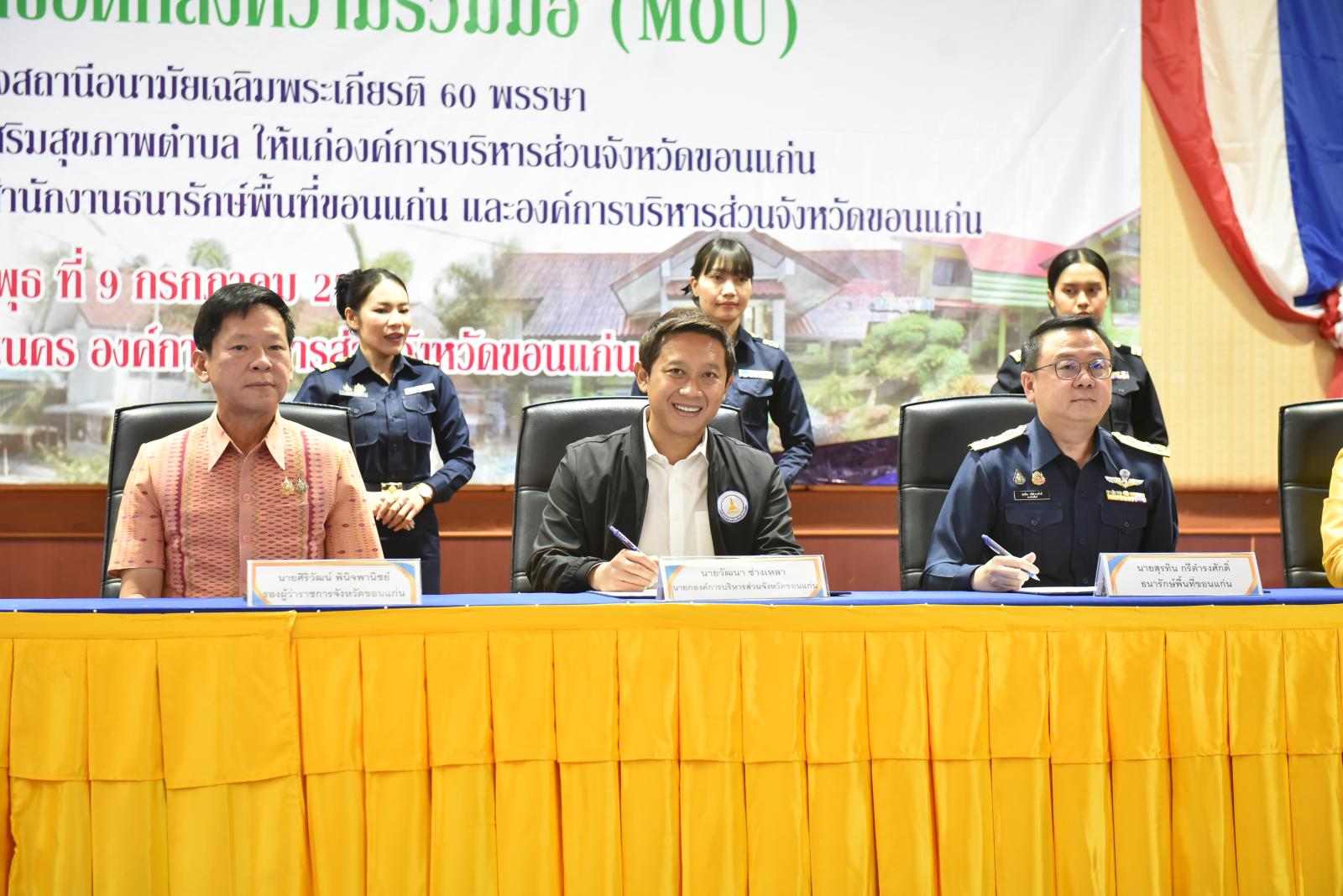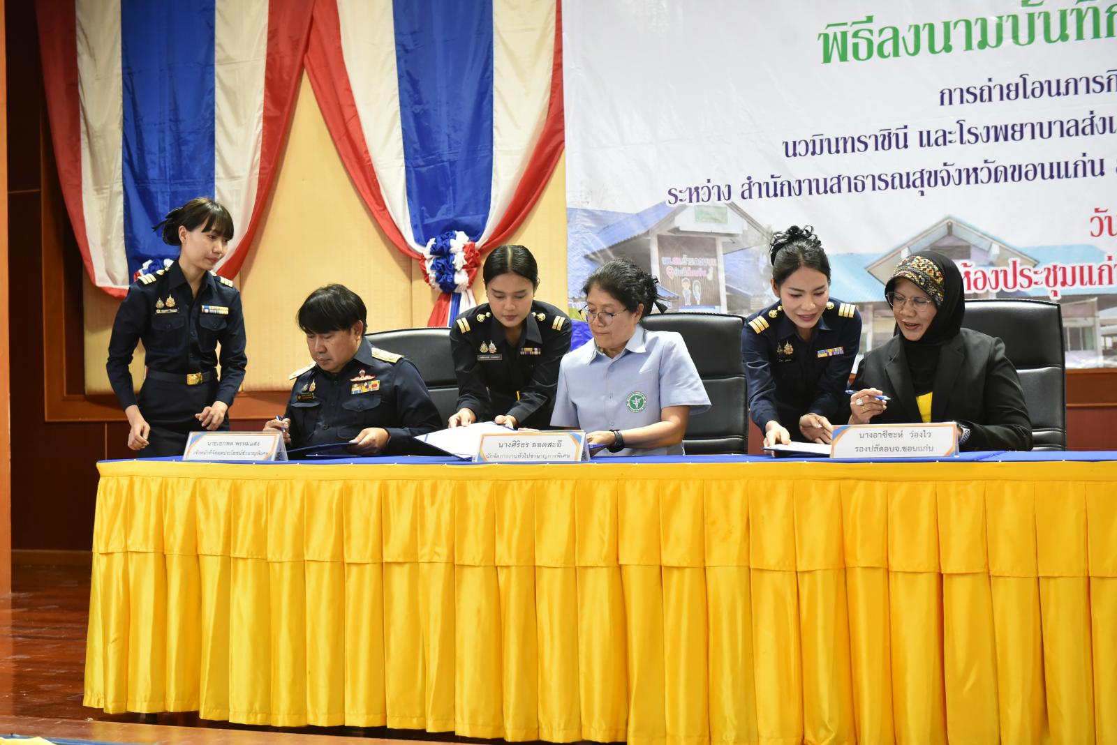 พิธีลงนามบันทึกข้อตกลงความร่วมมือ (MOU) การถ่ายโอนภารกิจสถานีอนามัยเฉลิมพระเกียรติ 60 พรรษา นวมินทราชินี และโรงพยาบาลส่งเสริมสุขภาพตำบล ระหว่าง สำนักงานสาธารณสุขจังหวัดขอนแก่น สำนักงานธนารักษ์พื้นที่ขอนแก่น และองค์การบริหารส่วนจังหวัดขอนแก่น