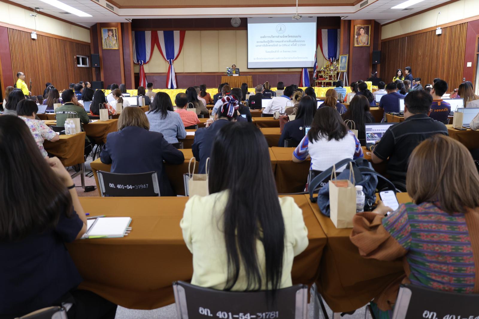 เมื่อวันที่ 14 สิงหาคม 2568 เวลา 09.30 น. องค์การบริหารส่วนจังหวัดขอนแก่น นำโดย นายวัฒนา ช่างเหลา นายกองค์การบริหารส่วนจังหวัดขอนแก่น มอบหมายให้ นายนาวิน คำเวียง รองนายกองค์การบริหารส่วนขอนแก่น เป็นประธาน เปิดอบรมเชิงปฏิบัติการคณะทำงานขับเคลื่อนระบบอิเล็กทรอนิกส์ e-Office ครั้งที่ 1/2568 เพื่อเพิ่มศักยภาพและเสริมทักษะการปฏิบัติงานด้านการใช้ระบบสารบรรณอิเล็กทรอนิกส์ และการจัดการเอกสารออนไลน์ ให้กับบุคลากรภายในหน่วยงาน พร้อมกล่าวถึงความสำคัญของการพัฒนาระบบการทำงานในยุคดิจิทัล ซึ่ง e-Office จะช่วยให้การติดต่อสื่อสารและการดำเนินงานภายในหน่วยงานมีความรวดเร็ว โปร่งใส และตรวจสอบได้ ในโอกาสนี้มี ว่าที่ร้อยเอกพงเจตน์ พรกุณา ปลัดองค์การบริหารส่วนจังหวัดขอนแก่น หัวหน้าส่วนราชการ บุคลากรในสังกัดองค์การบริหารส่วนจังหวัดขอนแก่น เข้าร่วมอบรม ณ ห้องประชุมแก่นนคร องค์การบริหารส่วนจังหวัดขอนแก่น
