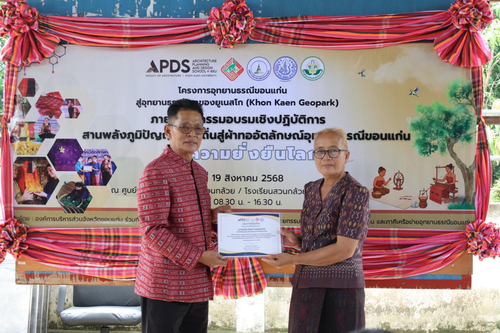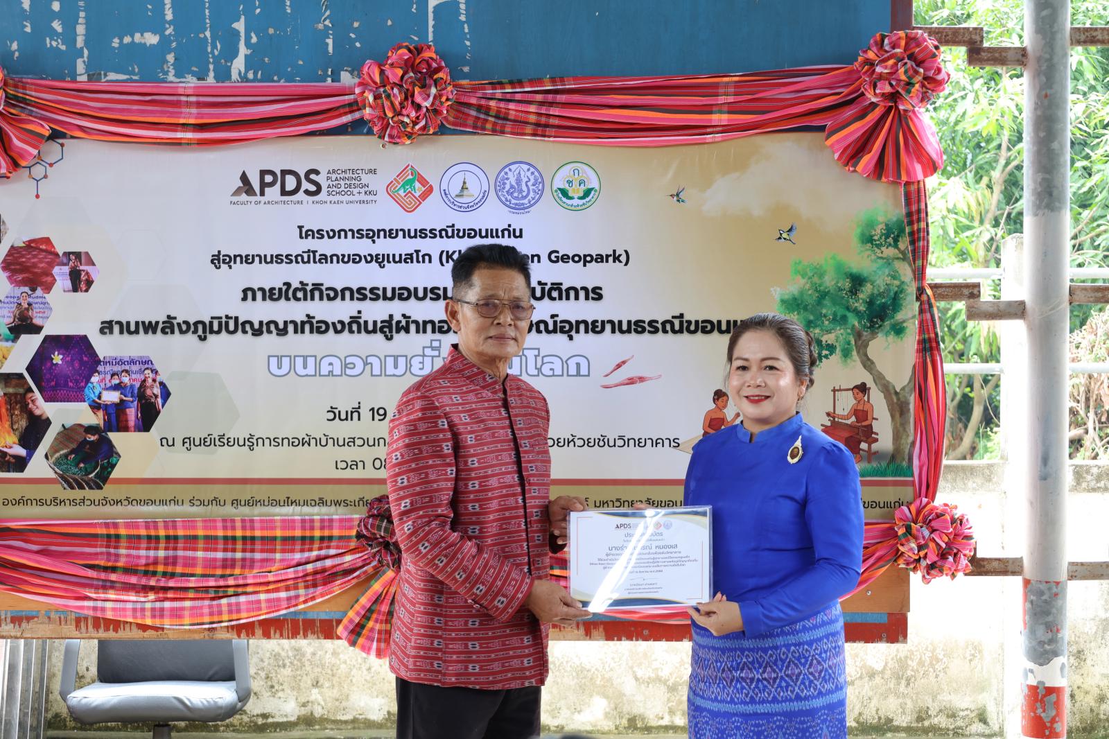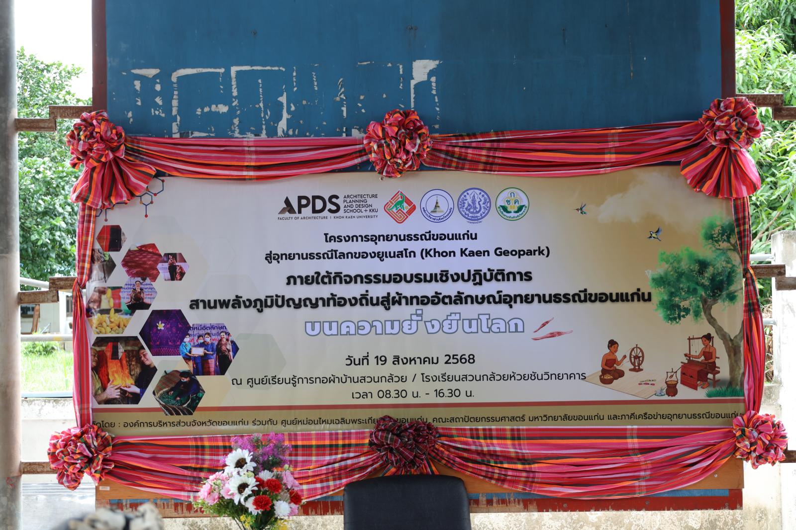 ภายใต้กิจกรรม อบรมเชิงปฏิบัติการสานพลังแห่งภูมิปัญญาท้องถิ่น สู่ผ้าทออัตลักษณ์อุทยานธรณีขอนแก่น บนเส้นทางความยั่งยืนโลก โดยมี นางสุภาพร ภูเงิน ผู้อำนวยการกองการท่องเที่ยวและกีฬา องค์การบริหารส่วนจังหวัดขอนแก่น กล่าวรายงาน ในโอกาสนี้ได้รับเกียรติจาก นางวิภา เรืองประเสริฐกุล สมาชิกองค์การบริหารส่วนจังหวัดขอนแก่น เขตอำเภอภูเวียง นางสุวรรณา วรรณศรี นายอำเภอภูเวียง หัวหน้าส่วนราชการ ชาวบ้าน รวมทั้งคณะครูและนักเรียนจากโรงเรียนสวนกล้วยห้วยชันวิทยาคาร เข้าร่วมกิจกรรมอย่างพร้อมเพรียง งานจัดขึ้น ณ ศูนย์เรียนรู้การทอผ้าไหมบ้านสวนกล้วย อำเภอภูเวียง จังหวัดขอนแก่น โดยมีวัตถุประสงค์เพื่อส่งเสริมภูมิปัญญาท้องถิ่น สร้างอัตลักษณ์ผ้าทอที่สะท้อนความโดดเด่นของอุทยานธรณีขอนแก่น และก้าวสู่มาตรฐานในระดับสากลอย่างยั่งยืน