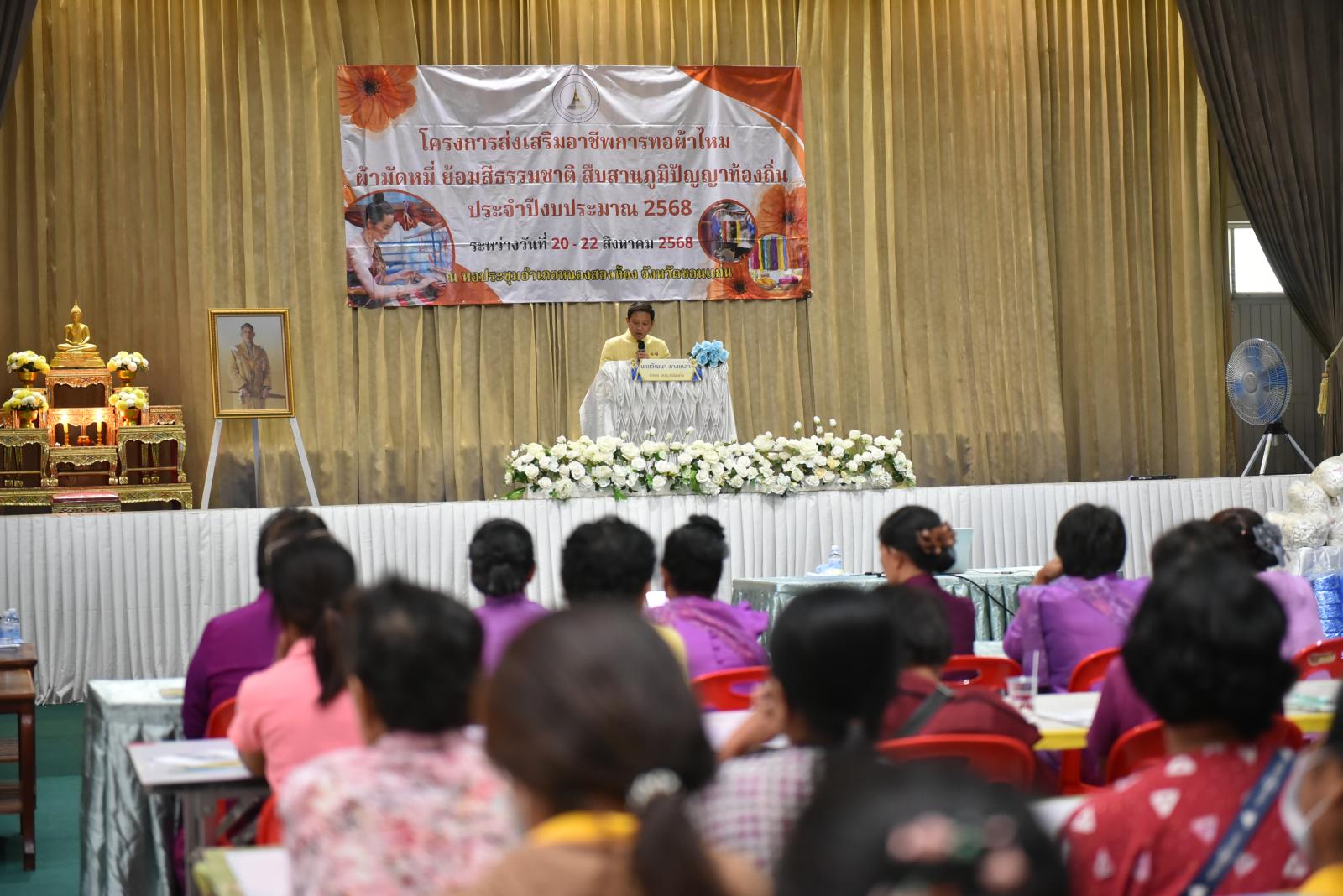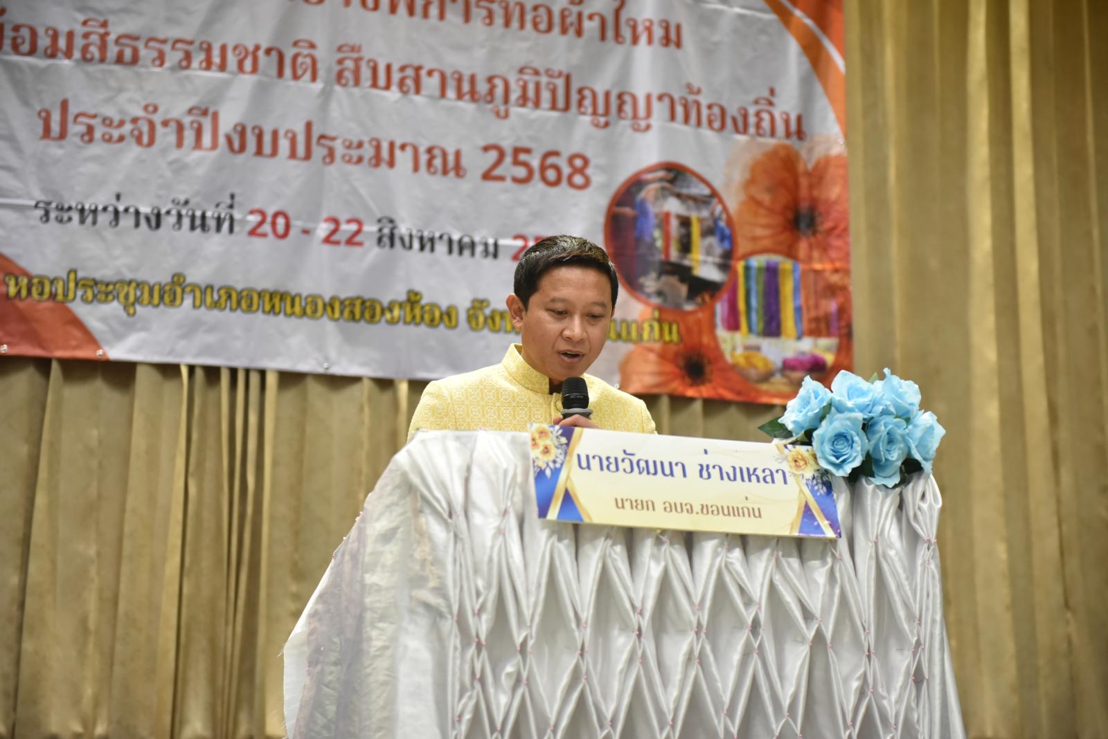 เมื่อวันที่ 20 สิงหาคม 2568 เวลา 09.30 น. นายวัฒนา ช่างเหลา นายกองค์การบริหารส่วนจังหวัดขอนแก่น เป็นประธาน โครงการส่งเสริมอาชีพการทอผ้าไหม ผ้ามัดหมี่ ย้อมสีธรรมชาติ สืบสานภูมิปัญญาท้องถิ่น ประจำปีงบประมาณ 2568 โดยมี นางศิริวรรณ สุรินทะ หัวหน้าสำนักปลัดองค์การบริหารส่วนจังหวัด กล่าวรายงาน ในโอกาสนี้ นางดวงแข อรรณนพพร นายอดุลย์ คามดิษฐ์ รองนายกองค์การบริหารส่วนจังหวัดขอนแก่น, ดร.รัตนาภรณ์ สมบูณณ์ อดีตสมาชิกวุฒิสภาฯ, นางสาวกมลชนก ฉัตรชัยพลรัตน์ นายณัฐพล กลุ่มเหรียญทอง ส.อบจ.ขอนแก่น เขต 1,2 คณะผู้อำนวยการ รพ.สต. ผู้นำท้องที่ ผู้นำท้องถิ่น ในเขตพื้นที่อำเภอหนองสองห้อง เข้าร่วมเป็นเกียรติ ณ หอประชุมที่ว่าการอำเภอหนองสองห้อง