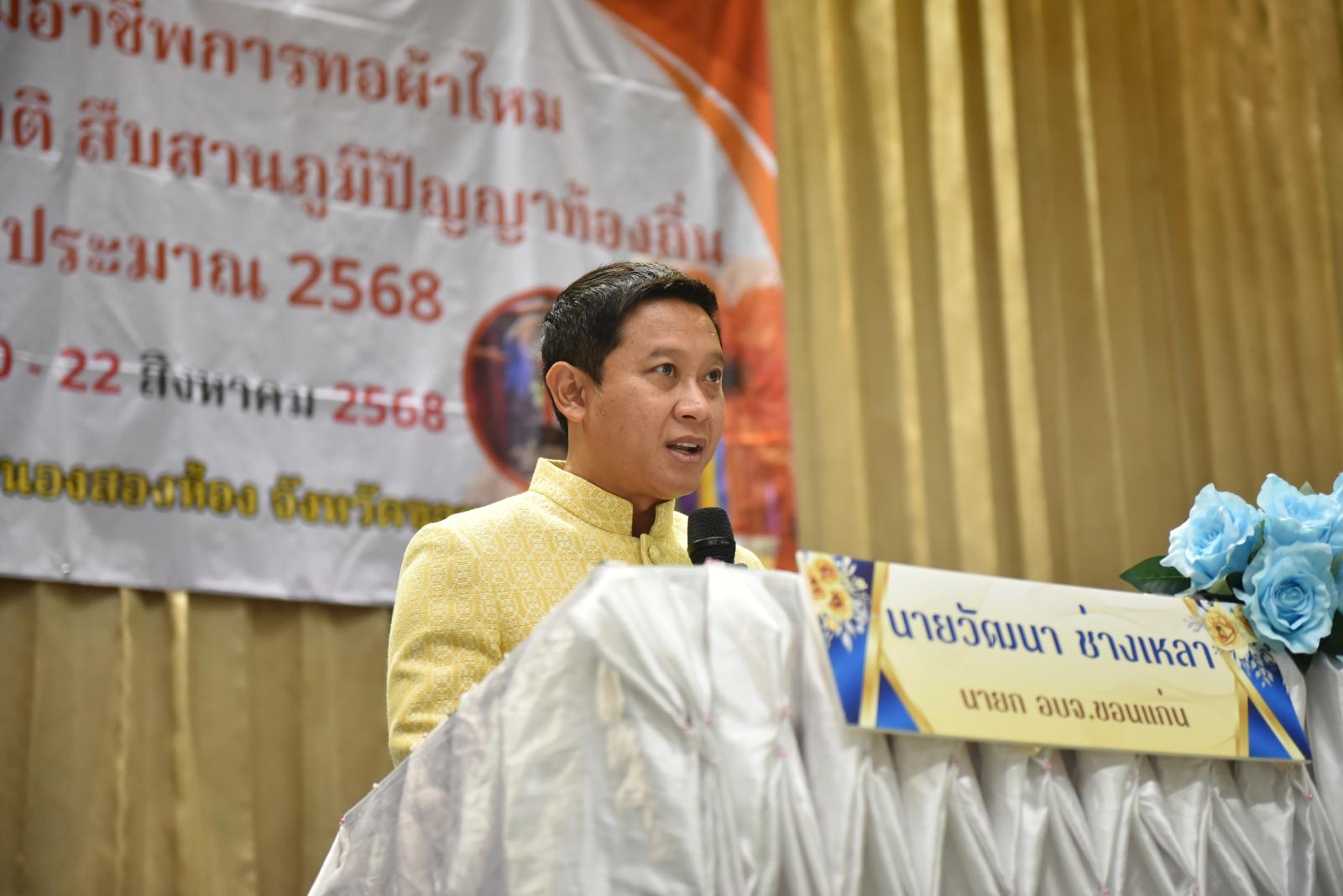 นายวัฒนา ช่างเหลา กล่าวว่า การจัดโครงการอบรมในครั้งนี้เป็นภารกิจตามอำนาจหน้าที่ขององค์การบริหารส่วนจังหวัดขอนแก่น ในการส่งเสริมการประกอบอาชีพให้กับประชาชนในพื้นที่ โดยการส่งเสริมและพัฒนาอาชีพให้กับกลุ่มทอผ้าไหม ผ้าไหมมัดหมี่ ย้อมสีธรรมชาติก็เป็นอีกภารกิจหนึ่ง จะเห็นว่าอาชีพการทอผ้าไหม, ผ้าไหมมัดหมี่ เป็นอีกหนึ่งอาชีพของประชาชนในหลายเขตพื้นที่ในจังหวัดขอนแก่น ที่ได้รับสืบทอดจากรุ่นสู่รุ่น ซึ่งเป็นภูมิปัญญาชาวบ้านที่มีมายาวนาน ในปัจจุบันมีการเรียนรู้และพัฒนามากยิ่งขึ้นในหลาย ๆ พื้นที่ มีการออกแบบลายผ้าเพื่อเป็นการอนุรักษ์ภูมิปัญญาการทอผ้า ที่เป็นอัตลักษณ์ของแต่ละพื้นที่ และเพิ่มมูลค่าของสินค้า ย่อมส่งผลให้ผู้ประกอบอาชีพมีรายได้เพิ่มขึ้น นำไปสู่พัฒนาอาชีพอย่างมั่นคงต่อไป