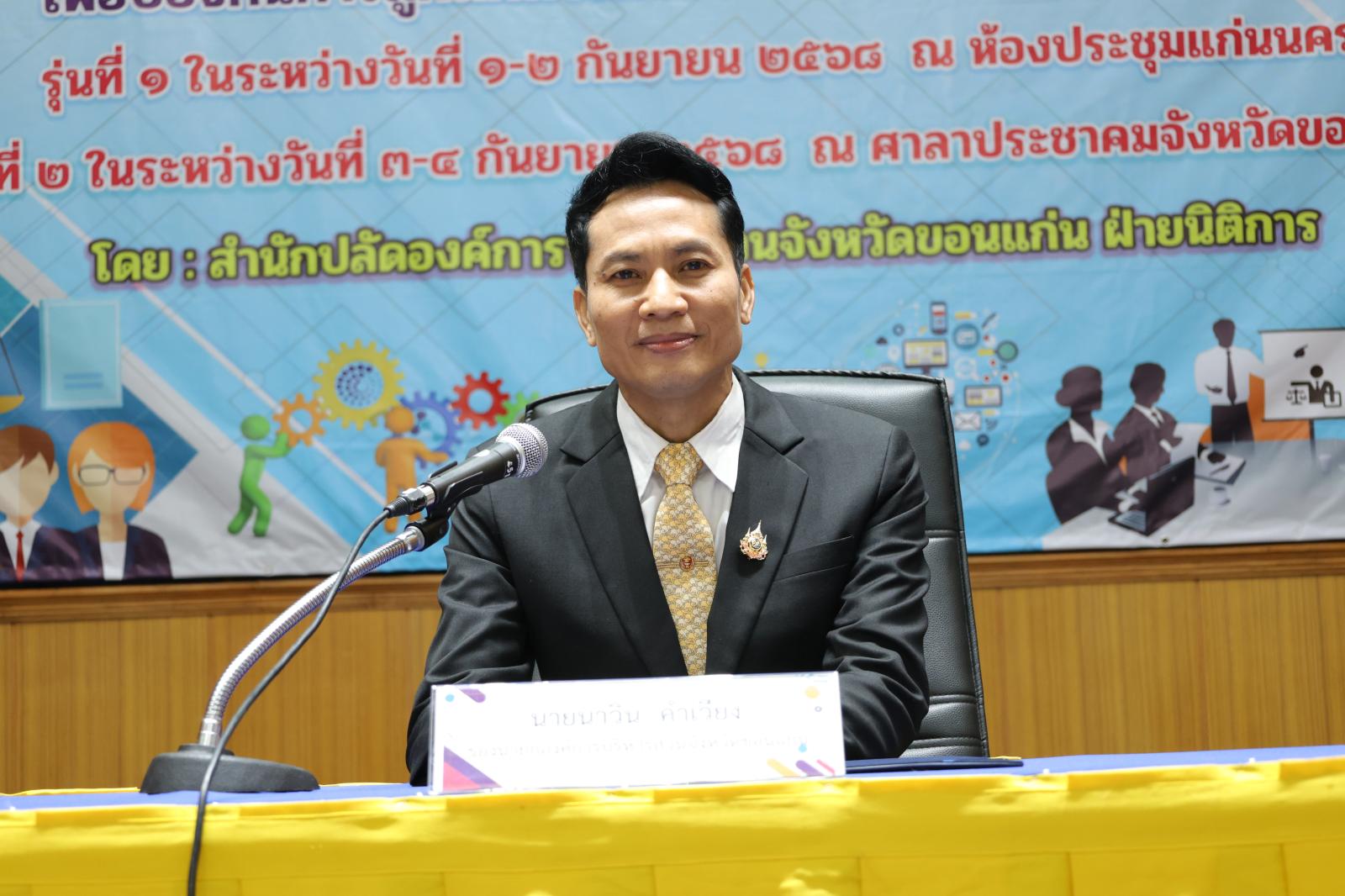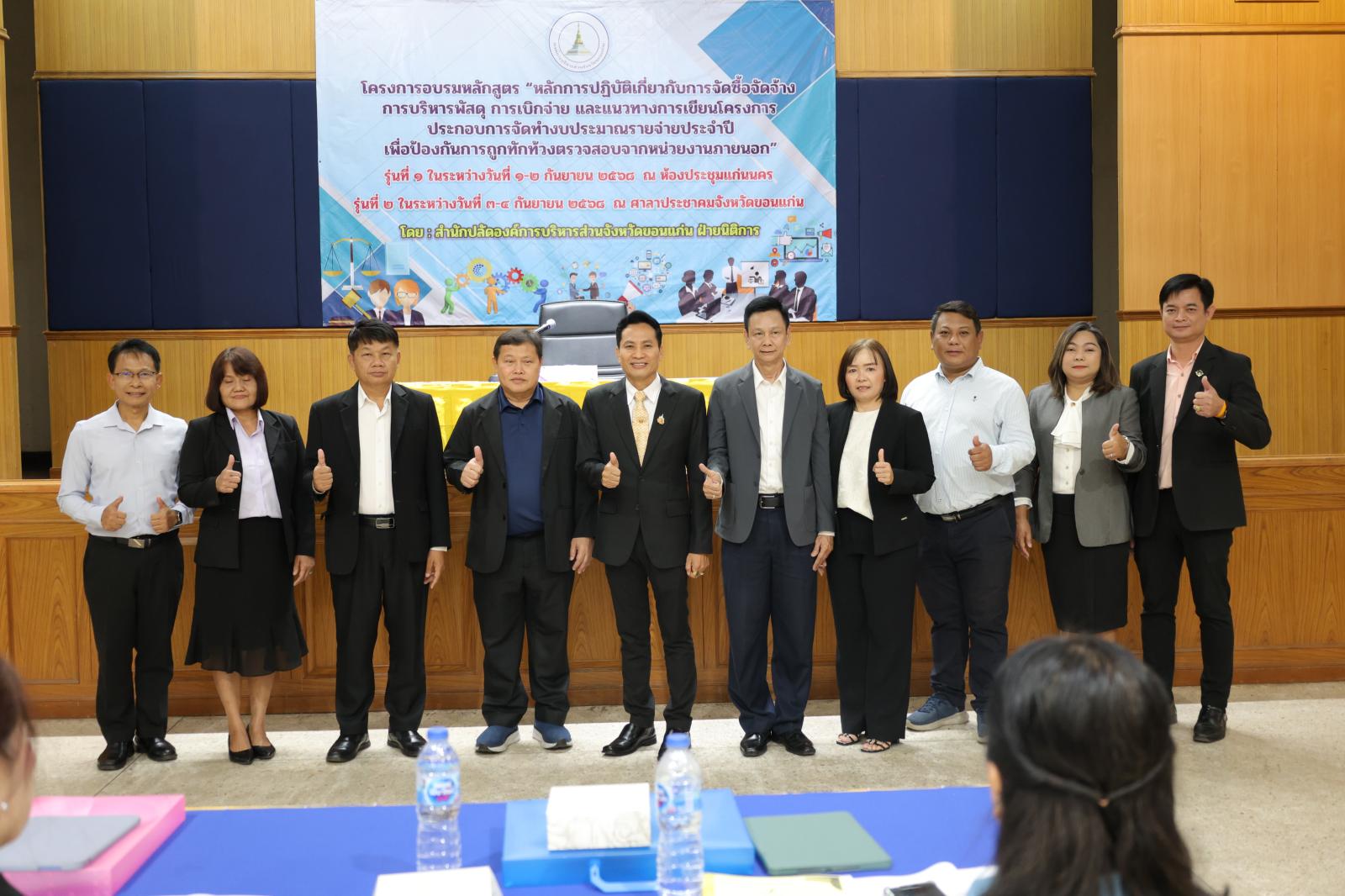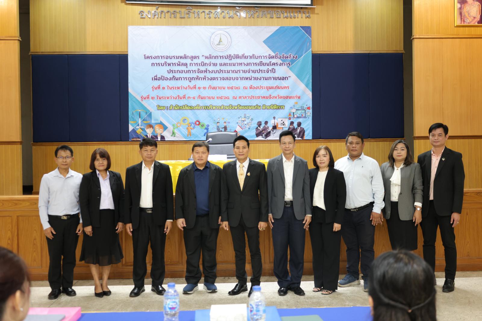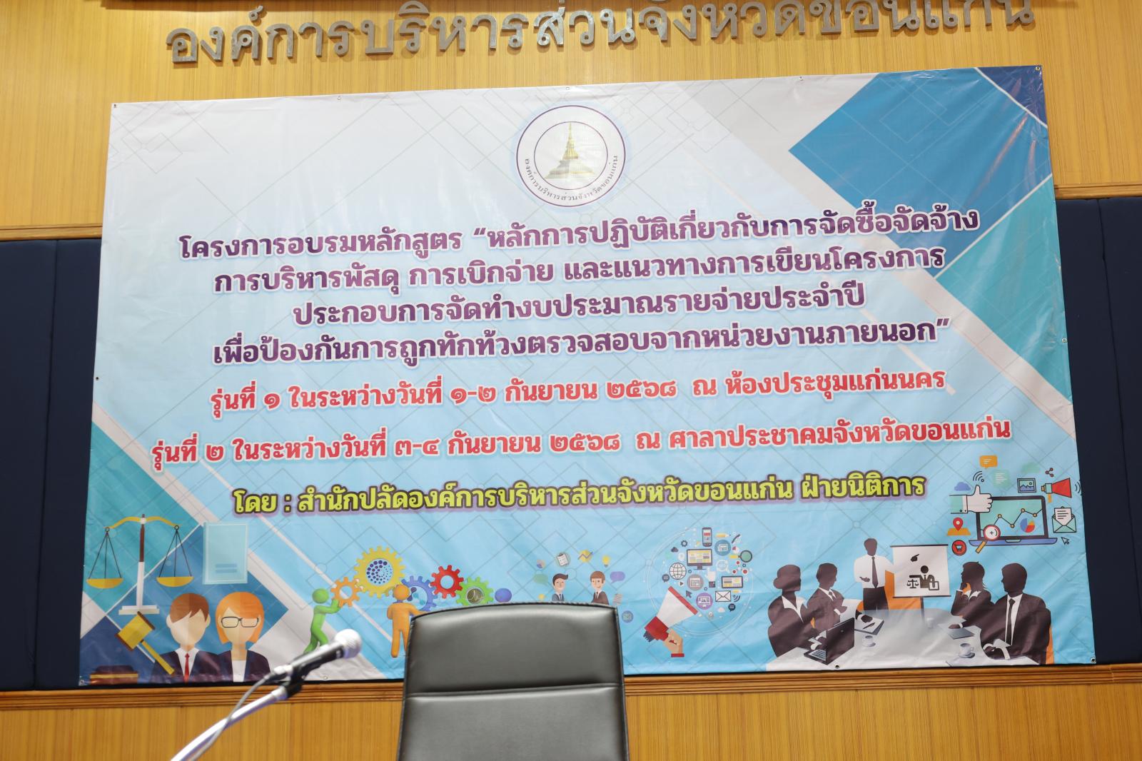 องค์การบริหารส่วนจังหวัดขอนแก่น นำโดย นายวัฒนา ช่างเหลา นายก อบจ.ขอนแก่น มอบหมายให้ นายนาวิน คำเวียง รองนายก อบจ.ขอนแก่น เป็นประธานในพิธีเปิด โครงการอบรมหลักสูตร “หลักการปฏิบัติเกี่ยวกับการจัดซื้อจัดจ้าง การบริหารพัสดุ การเบิกจ่าย และแนวทางการเขียนโครงการประกอบการจัดทำงบประมาณรายจ่ายประจำปี เพื่อป้องกันการถูกทักท้วงจากหน่วยตรวจสอบภายนอก” ประจำปีงบประมาณ 2568 รุ่นที่ 2