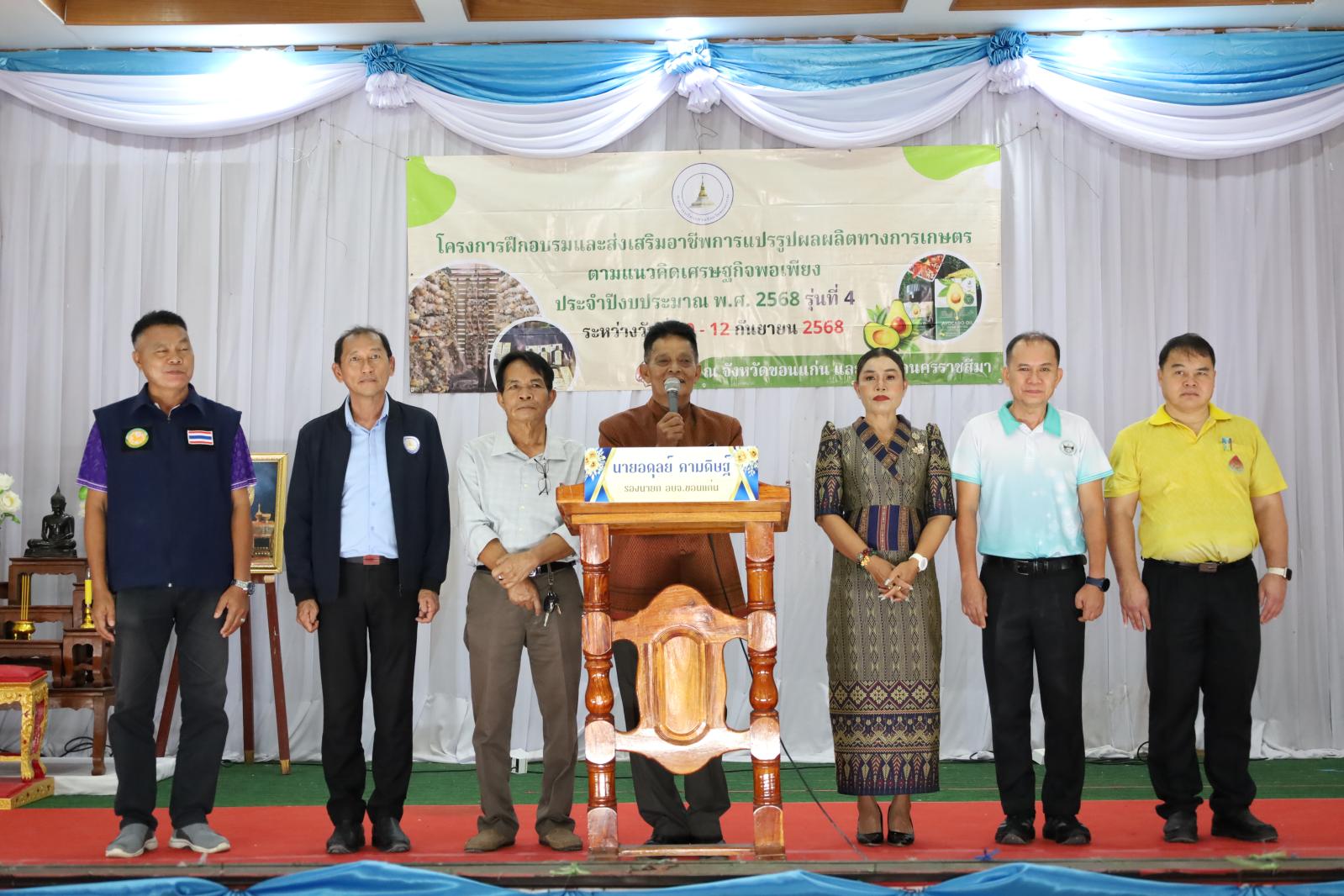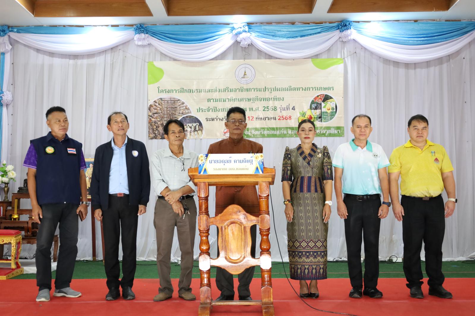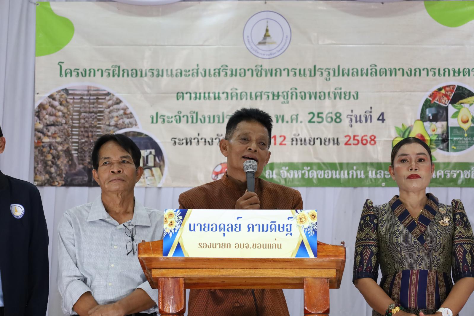 มอบหมายให้นายอดุลย์ คามดิษฐ์ รองนายกองค์การบริหารส่วนจังหวัดขอนแก่น เป็นประธานในพิธีเปิดโครงการฝึกอบรมและส่งเสริมอาชีพการแปรรูปผลผลิตทางการเกษตรตามแนวคิดเศรษฐกิจพอเพียง ประจำปีงบประมาณ 2568 รุ่นที่ 4โดยมีนางสาวสุธิดา อุ่นสนธิ์ หัวหน้าฝ่ายอำนวยการ สำนักปลัดองค์การบริหารส่วนจังหวัดขอนแก่น กล่าวรายงานถึงวัตถุประสงค์การจัดโครงการว่ามุ่งเน้นการสร้างองค์ความรู้และทักษะในการเพิ่มมูลค่าผลผลิตทางการเกษตร เพื่อสร้างรายได้ที่มั่นคงและยั่งยืนให้แก่เกษตรกรในพื้นที่ นายอดุลย์ คามดิษฐ์ ประธานในพิธี ได้กล่าวว่า “การแปรรูปผลผลิตทางการเกษตรถือเป็นการเพิ่มมูลค่าและสร้างโอกาสทางเศรษฐกิจที่สำคัญ เกษตรกรไม่เพียงแต่จะมีรายได้เพิ่มขึ้นจากการจำหน่ายผลผลิตสดแต่ยังสามารถสร้างผลิตภัณฑ์ใหม่ ๆ ที่ตรงกับความต้องการของตลาดได้ อบจ.ขอนแก่น จึงมุ่งเน้นการส่งเสริมการเรียนรู้ควบคู่กับการนำหลักเศรษฐกิจพอเพียงมาประยุกต์ใช้ เพื่อให้ประชาชนมีอาชีพที่มั่นคงและสามารถพึ่งพาตนเองได้อย่างยั่งยืน”ทั้งนี้ มีนายอำเภอ นายกองค์การบริหารส่วนตำบล ผู้นำท้องที่ หัวหน้าส่วนราชการ ข้าราชการ และประชาชนในพื้นที่ เข้าร่วมพิธีเปิดอย่างพร้อมเพรียง ณ หอประชุมอำเภอชนบท อำเภอชนบท จังหวัดขอนแก่น