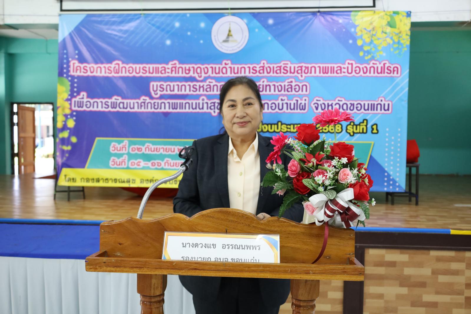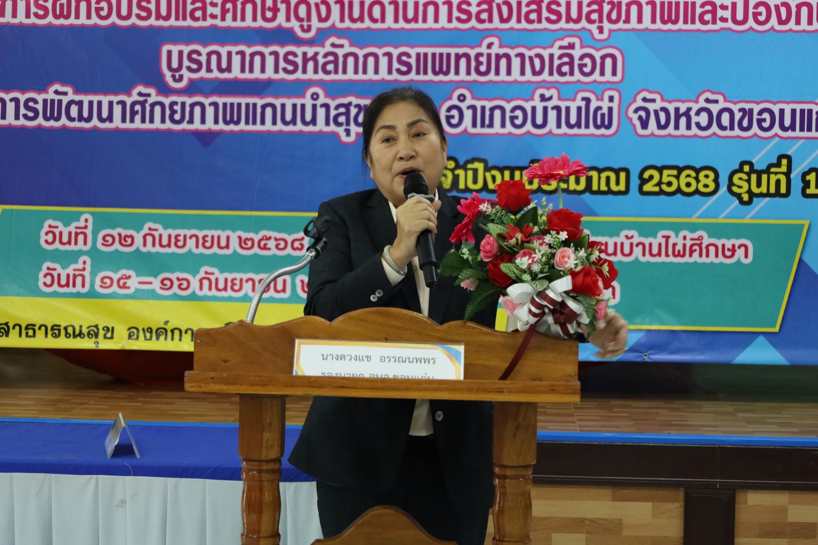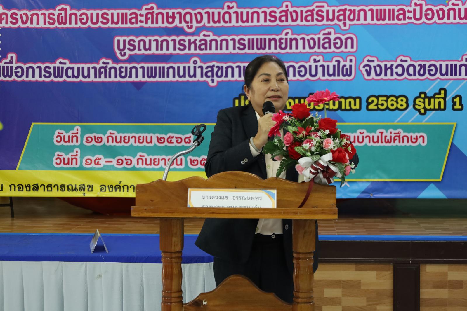 มอบหมายให้ นางดวงแข อรรณนพพร รองนายก อบจ.ขอนแก่น เป็นประธานเปิดโครงการฝึกอบรมและศึกษาดูงานด้านการส่งเสริมสุขภาพและป้องกันโรคบูรณาการหลักการแพทย์ทางเลือกเพื่อพัฒนาศักยภาพแกนนำสุขภาพ รุ่นที่ 1 อำเภอบ้านไผ่ ประจำปี 2568