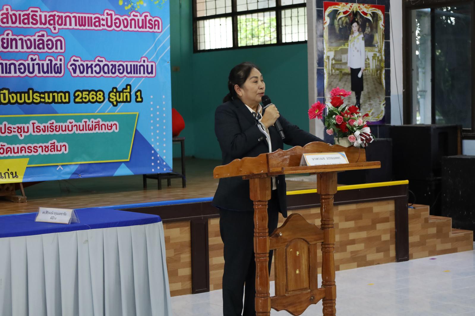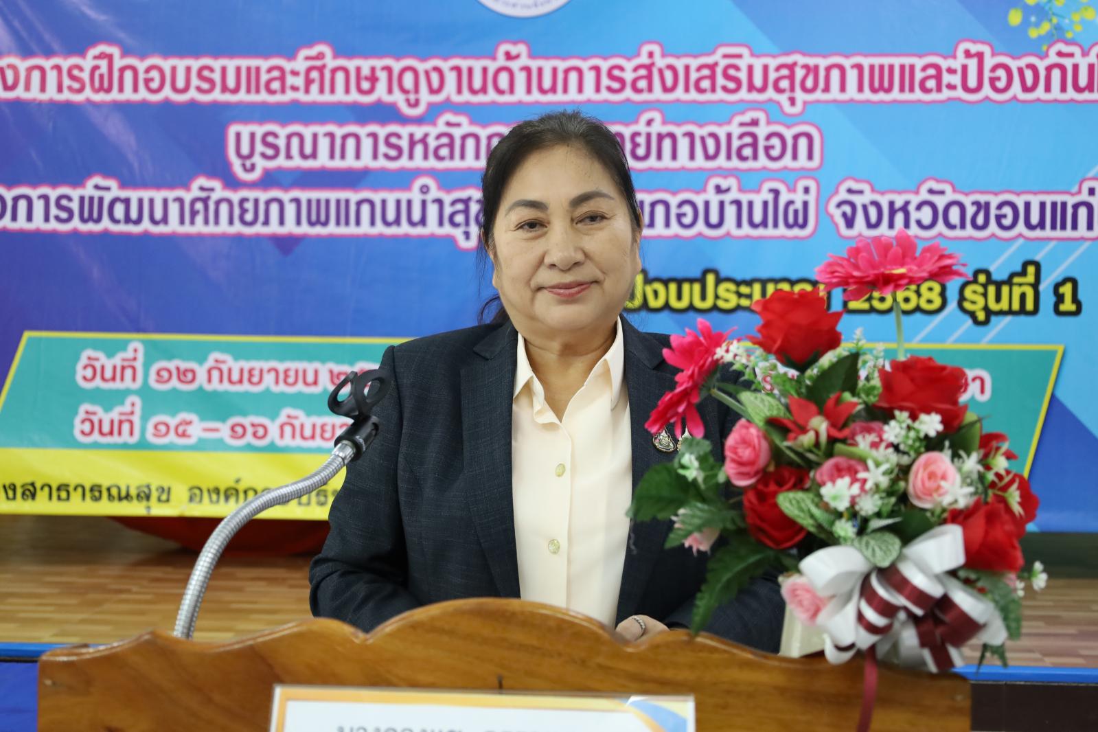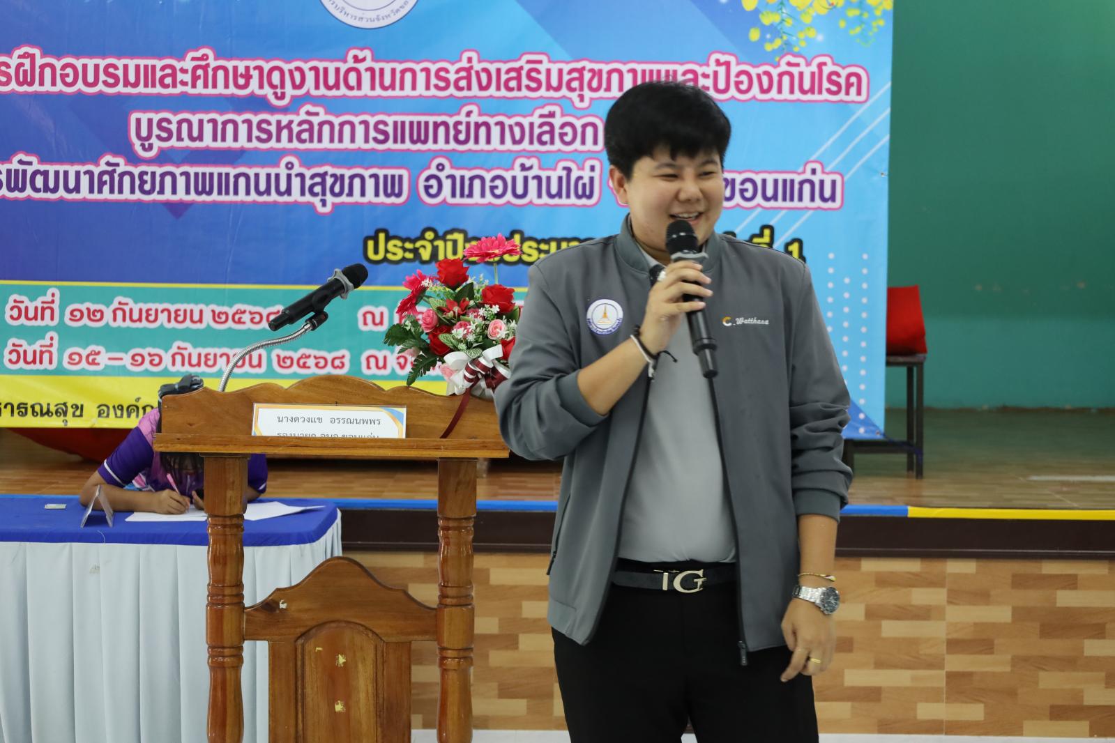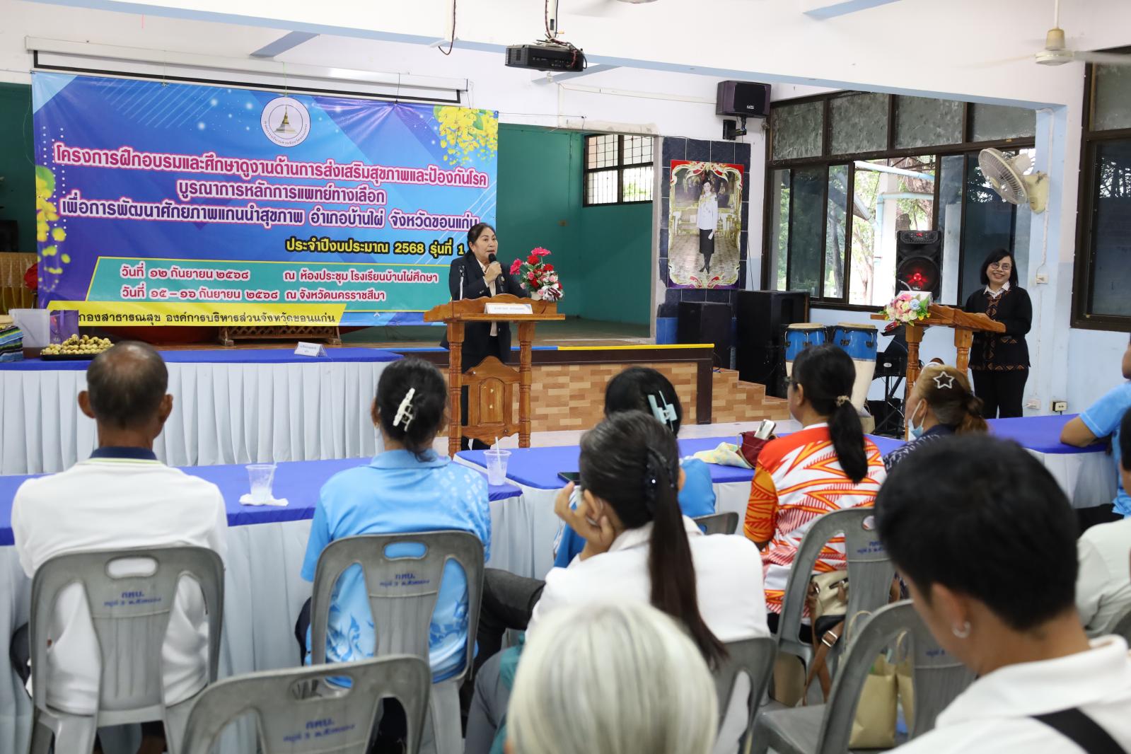 มอบหมายให้ นางดวงแข อรรณนพพร รองนายก อบจ.ขอนแก่น เป็นประธานเปิดโครงการฝึกอบรมและศึกษาดูงานด้านการส่งเสริมสุขภาพและป้องกันโรคบูรณาการหลักการแพทย์ทางเลือกเพื่อพัฒนาศักยภาพแกนนำสุขภาพ รุ่นที่ 1 อำเภอบ้านไผ่ ประจำปี 2568