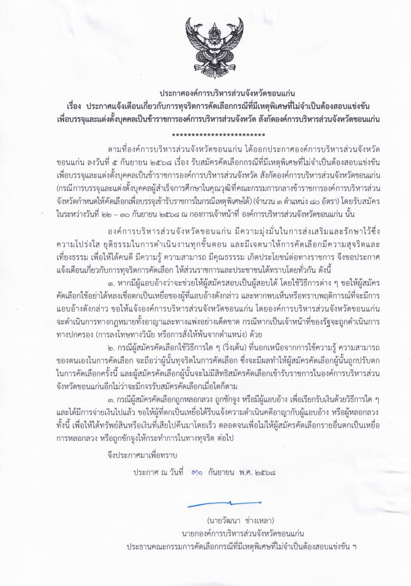 ประกาศแจ้งเตือนเกี่ยวกับการทุจริตการคัดเลือกกรณีที่มีเหตุพิเศษที่ไม่จำเป็นต้องสอบแข่งขันเพื่อบรรจุและแต่งตั้งบุคคลเป็นข้าราชการองค์การบริหารส่วนจังหวัดสังกัดองค์การบริหารส่วนจังหวัดขอนแก่น