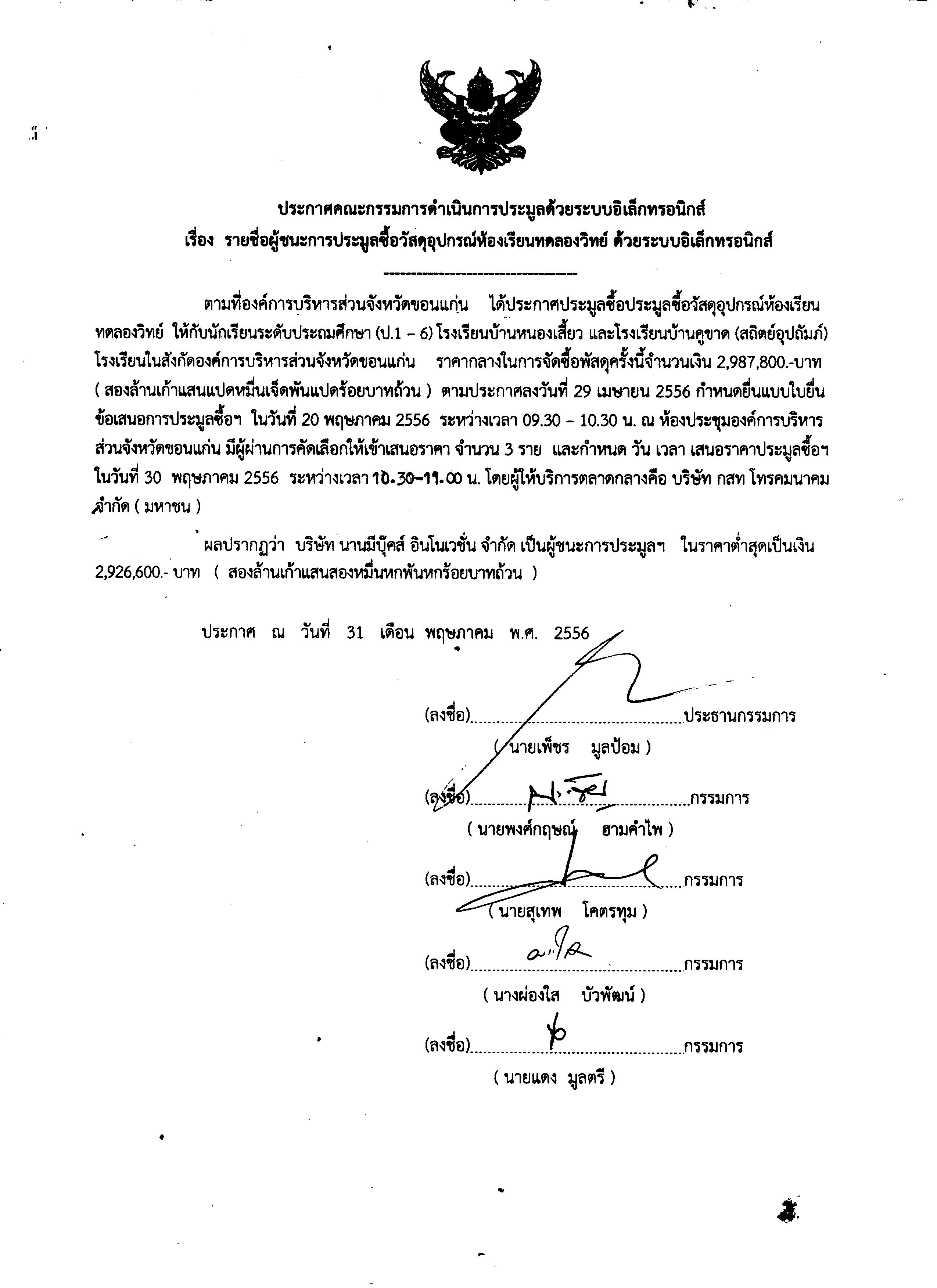 ประกาศรายชื่อผู้ชนะการประมูลซื้อวัสดุอุปกรณ์ห้องเรียนทดลองวิทย์ ด้วยระบบอิเล็กทรอนิกส์