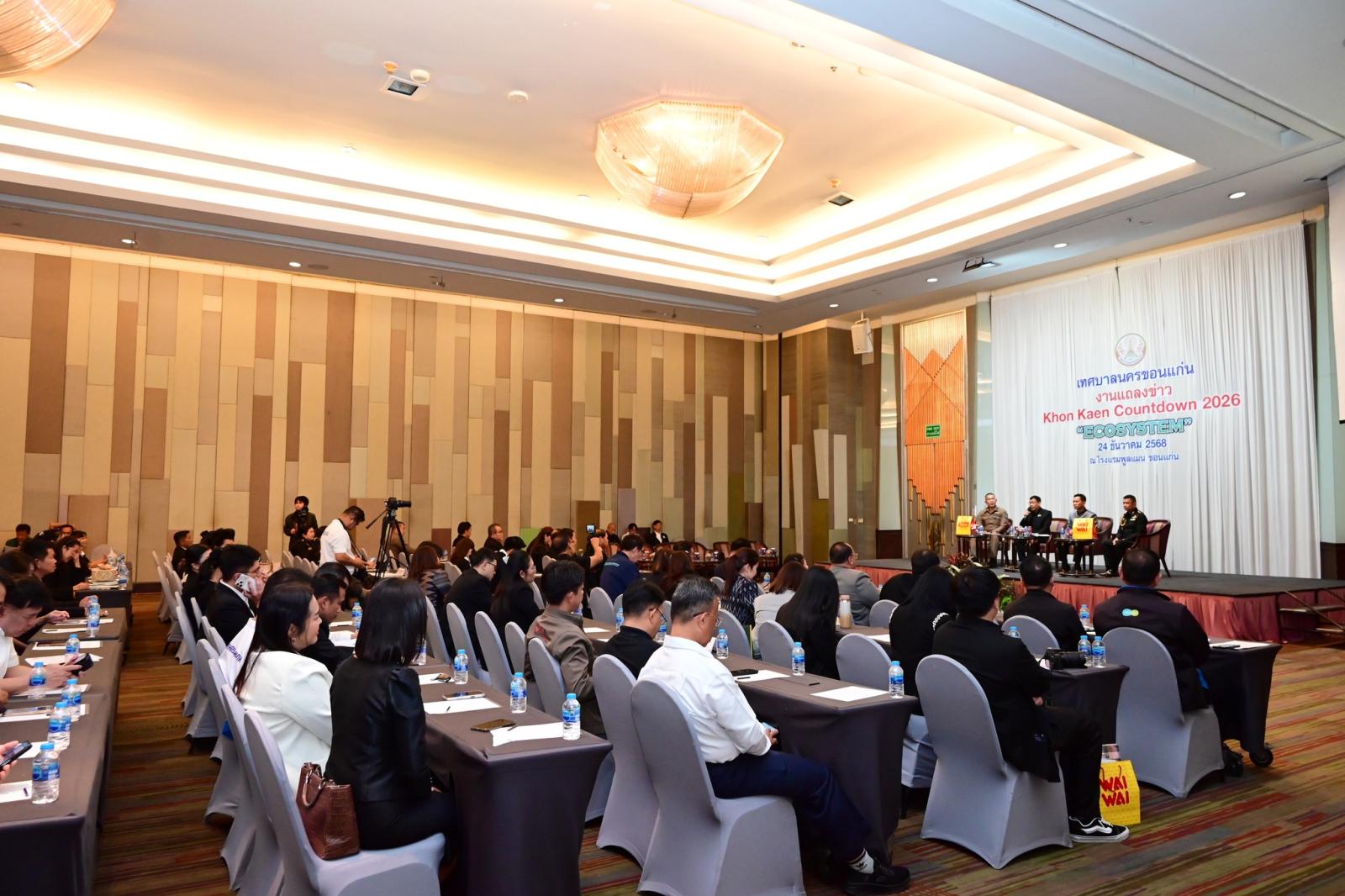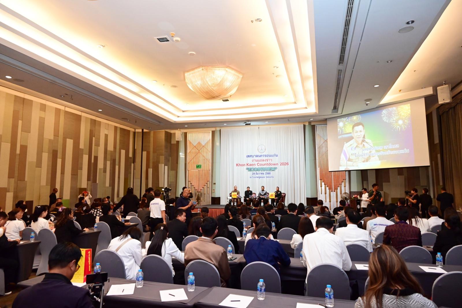 การแถลงข่าวจัดขึ้น ณ ห้องออคิด 1 โรงแรมพูลแมน ขอนแก่น ราชา ออคิด เพื่อประชาสัมพันธ์การจัดงานให้เป็นที่รับทราบในวงกว้าง และเชิญชวนพี่น้องประชาชนร่วมเฉลิมฉลองเทศกาลปีใหม่อย่างสร้างสรรค์ ปลอดภัย และเป็นมิตรกับสิ่งแวดล้อม สอดคล้องกับแนวคิด ECOSYSTEM ที่มุ่งเน้นความสมดุลของเมือง ผู้คน และธรรมชาติ