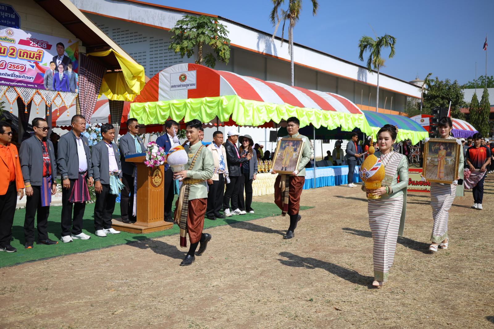 โอกาสนี้ นายทินกร ชาทอง รองผู้อำนวยการ สำนักงานเขตพื้นที่การศึกษาประถมศึกษาขอนแก่น เขต 2 กล่าวรายงานวัตถุประสงค์การจัดงาน โดยมี นายนพสิทธิ์ ช่างแกะ สมาชิกสภา อบจ.ขอนแก่น เขตอำเภอโคกโพธิ์ไชย นางบุษกร ศรีสุวรรณ์ ผู้อำนวยการส่วนส่งเสริมการศึกษา ศาสนาและวัฒนธรรม ผู้บริหารสถานศึกษา คณะครู และนักเรียนในสังกัด สพป.ขอนแก่น เขต 2 เข้าร่วมพิธีอย่างคึกคัก