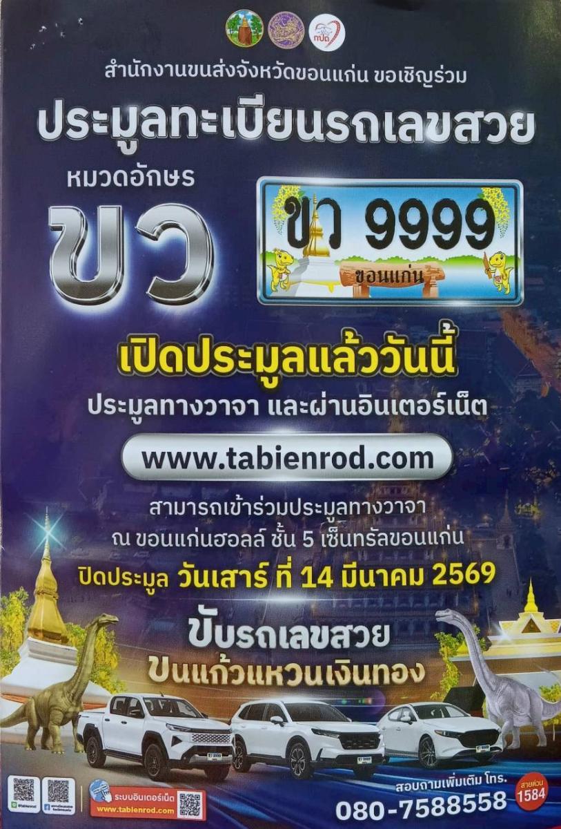 ในวันที่ 18 กุมภาพันธ์ 2569 เวลา 13.00 น. องค์การบริหารส่วนจังหวัดขอนแก่น นำโดย นายวัฒนา ช่างเหลา นายกองค์การบริหารส่วนจังหวัดขอนแก่น มอบหมายให้ ว่าที่ร้อยเอกพงเจตน์ พรกุณา ปลัดองค์การบริหารส่วนจังหวัดขอนแก่นร่วมงานแถลงข่าวการประมูลหมายเลขทะเบียนรถ "หมวดอักษร ขว" โดยมี นายขจรเกียรติ รักพานิชมณี ผู้ว่าราชการจังหวัดขอนแก่น เป็นประธานในพิธี โอกาสนี้มี นายธวัชชัย วิริยะจิตต์ ขนส่งจังหวัดขอนแก่น,นายแพทย์วิทยา ชาติบัญชาชัย ประธานมูลนิธิเพื่อความปลอดภัยทางถนน,นายแพทย์วิษวัต ชาติบัญชาชัย นายแพทย์ชำนาญการ ด้านเวชศาสตร์ฟื้นฟู โรงพยาบาลขอนแก่น,นางสาวรักษ์วนีย์ คำสิงห์ เป็นผู้ร่วมแถลงข่าวในครั้งนี้ และมีตัวแทนหน่วยงานภาครัฐและเอกชนในพื้นที่ สื่อมวลชน ร่วมเป็นเกียรติ ณ บริเวณด้านหน้าขอนแก่นฮอลล์ ชั้น 5 ศูนย์การค้าเซ็นทรัลพลาซ่าขอนแก่น