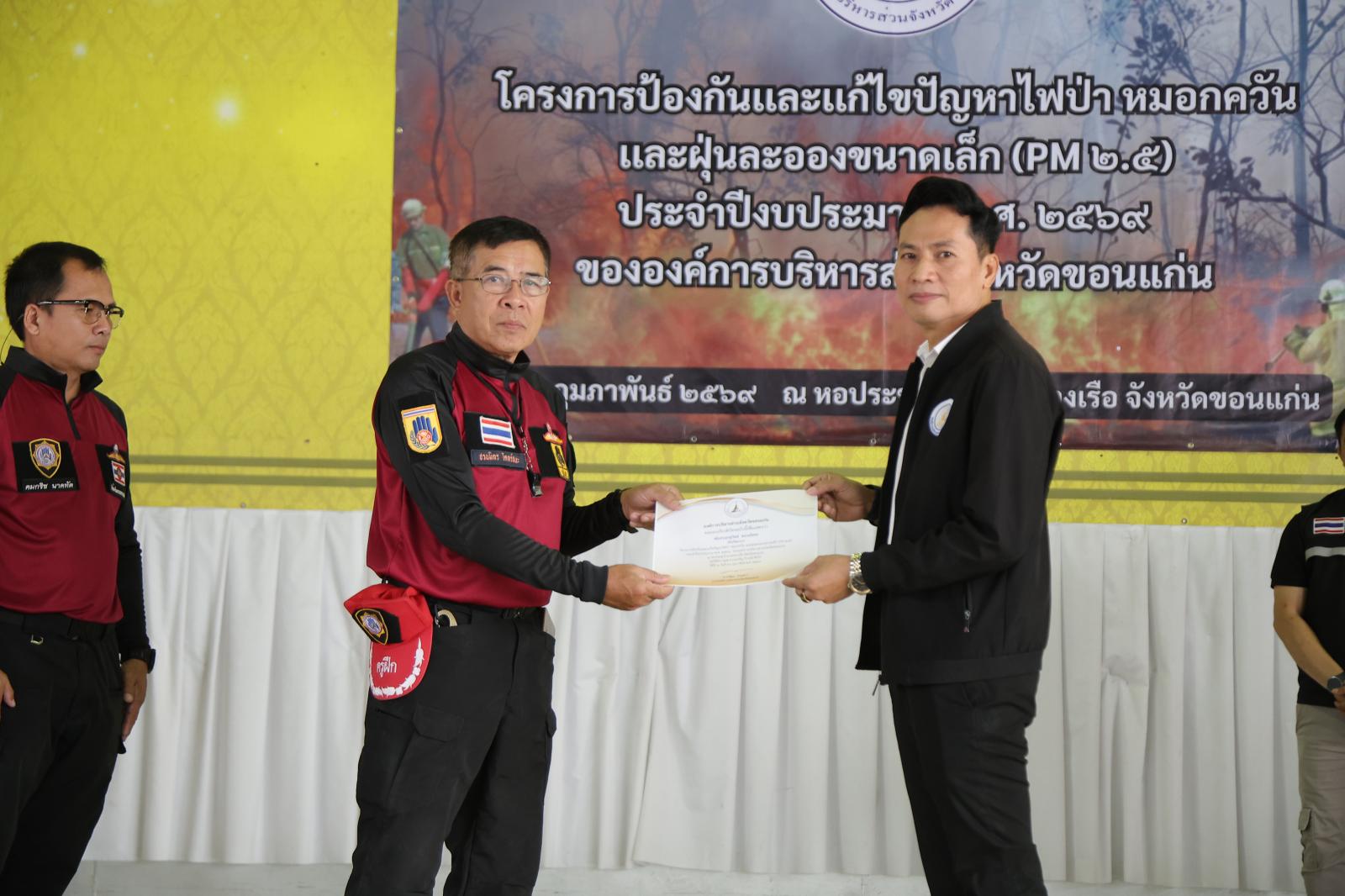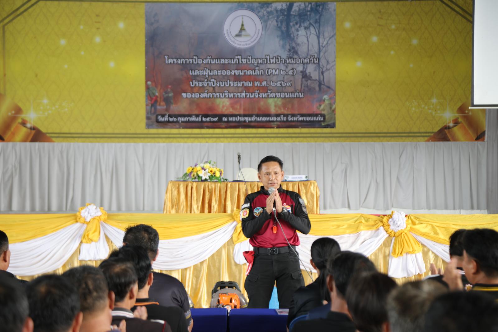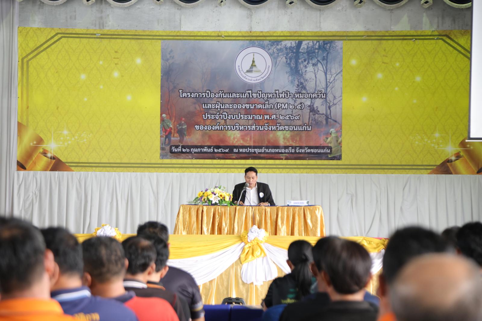 วันที่ 26 กุมภาพันธ์ 2569 เวลา 08.30 น.องค์การบริหารส่วนจังหวัดขอนแก่น นำโดย วัฒนา ช่างเหลา นายกองค์การบริหารส่วนจังหวัดขอนแก่น มอบหมายให้ นาวิน คำเวียง รองนายกองค์การบริหารส่วนจังหวัดขอนแก่น เป็นประธานเปิด โครงการป้องกันและแก้ไขปัญหาไฟป่า หมอกควัน และฝุ่นละอองขนาดเล็ก (PM2.5) ประจำปีงบประมาณ พ.ศ. 2569