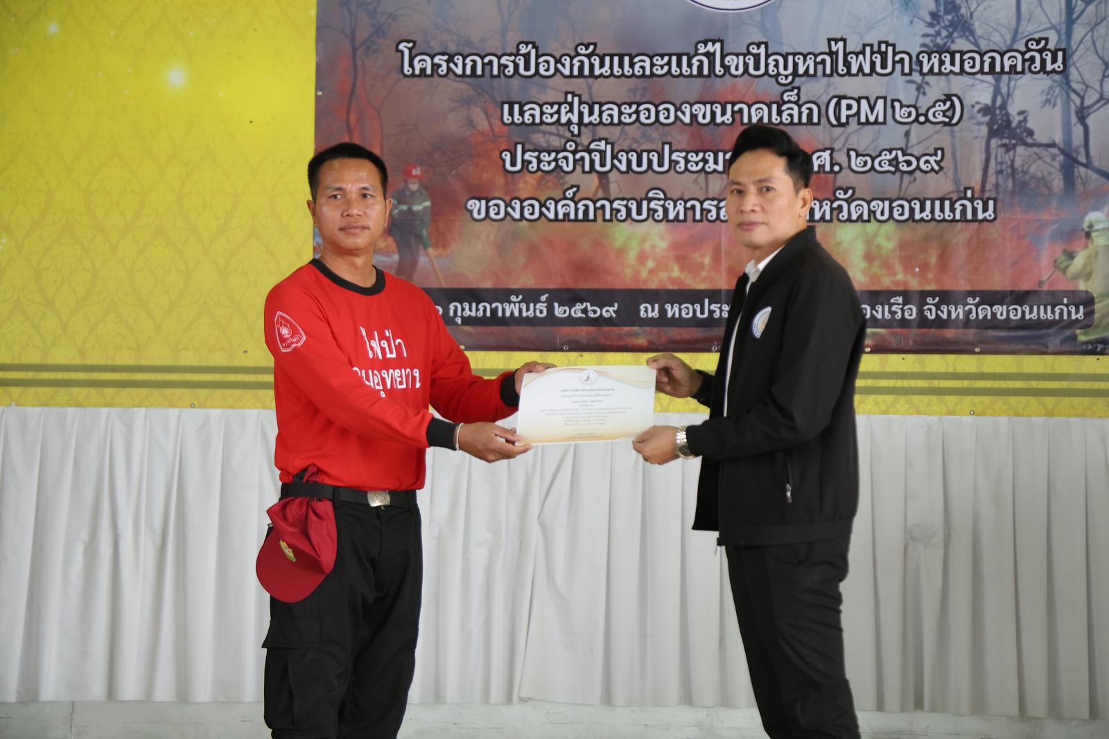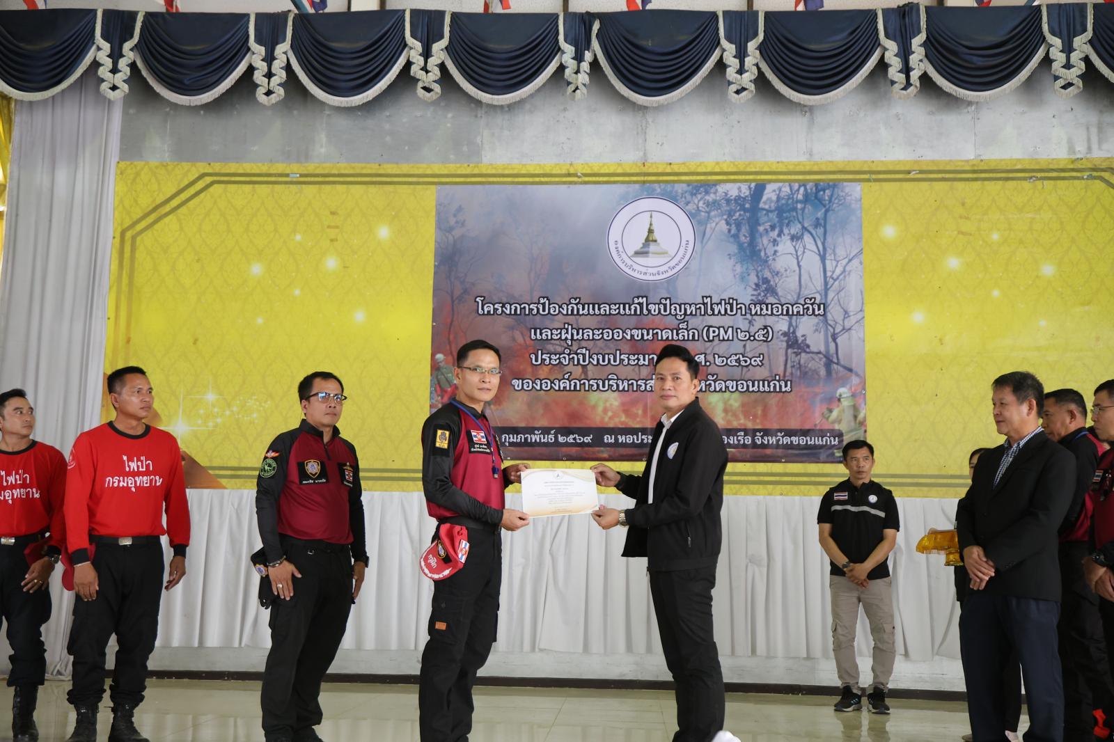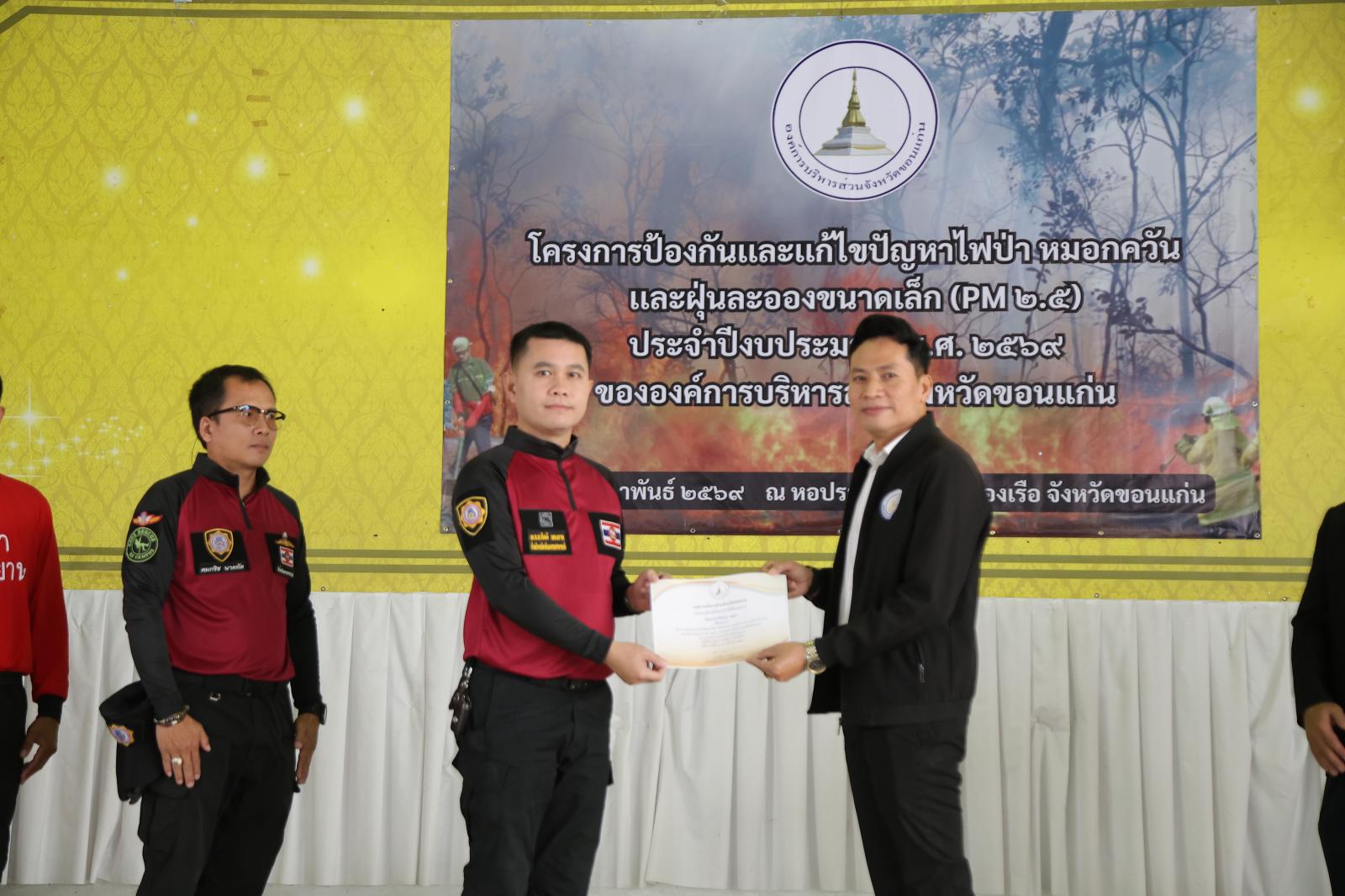 วันที่ 26 กุมภาพันธ์ 2569 เวลา 08.30 น.องค์การบริหารส่วนจังหวัดขอนแก่น นำโดย วัฒนา ช่างเหลา นายกองค์การบริหารส่วนจังหวัดขอนแก่น มอบหมายให้ นาวิน คำเวียง รองนายกองค์การบริหารส่วนจังหวัดขอนแก่น เป็นประธานเปิด โครงการป้องกันและแก้ไขปัญหาไฟป่า หมอกควัน และฝุ่นละอองขนาดเล็ก (PM2.5) ประจำปีงบประมาณ พ.ศ. 2569