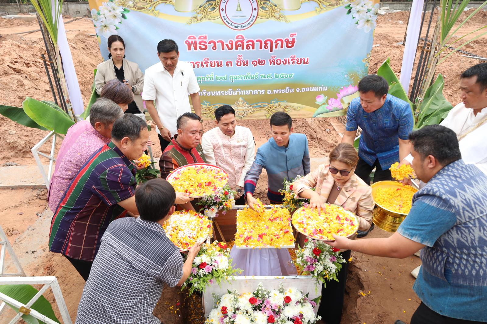 วันที่ 27 กุมภาพันธ์ 2569 เวลา 08.30 น.องค์การบริหารส่วนจังหวัดขอนแก่น นำโดยนายวัฒนา ช่างเหลา นายกองค์การบริหารส่วนจังหวัดขอนแก่น มอบหมายให้ นาย นาวิน คำเวียง รองนายกองค์การบริหารส่วนจังหวัดขอนแก่น เป็นประธานในพิธี วางศิลาฤกษ์อาคารเรียนหลังใหม่ ณ โรงเรียนพระยืนวิทยาคาร อำเภอพระยืน จังหวัดขอนแก่นโดยมีนางแสงเดือน พานโน สมาชิกสภาองค์การบริหารส่วนจังหวัดขอนแก่นอำเภอพระยืน นายอำเภอพระยืน ผู้นำท้องถิ่น ผู้นำท้องที่ ผู้บริหารสถานศึกษา คณะครู นักเรียน ผู้นำชุมชน และประชาชนในพื้นที่ เข้าร่วมพิธี