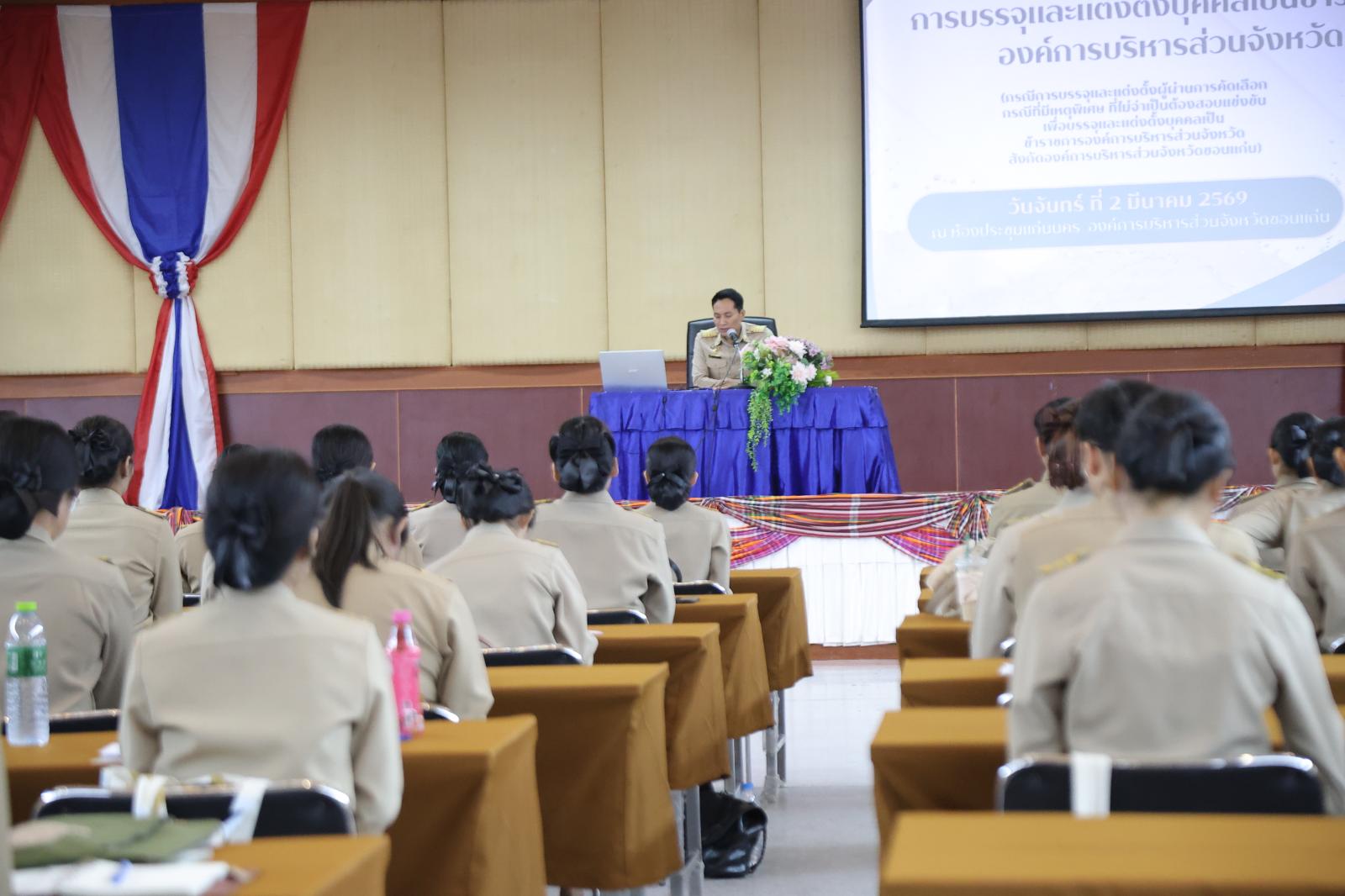 เมื่อวันที่ 2 มีนาคม 2569 เวลา 09.00 น. องค์การบริหารส่วนจังหวัดขอนแก่น นำโดย นายวัฒนา ช่างเหลา นายกองค์การบริหารส่วนจังหวัดขอนแก่น มอบหมายให้ นายนาวิน คำเวียง รองนายกองค์การบริหารส่วนจังหวัดขอนแก่น เป็นประธานการประชุมปฐมนิเทศและรายงานตัวผู้ได้รับการบรรจุและแต่งตั้งเป็นข้าราชการองค์การบริหารส่วนจังหวัด (กรณีคัดเลือกเหตุพิเศษที่ไม่จำเป็นต้องสอบแข่งขัน)