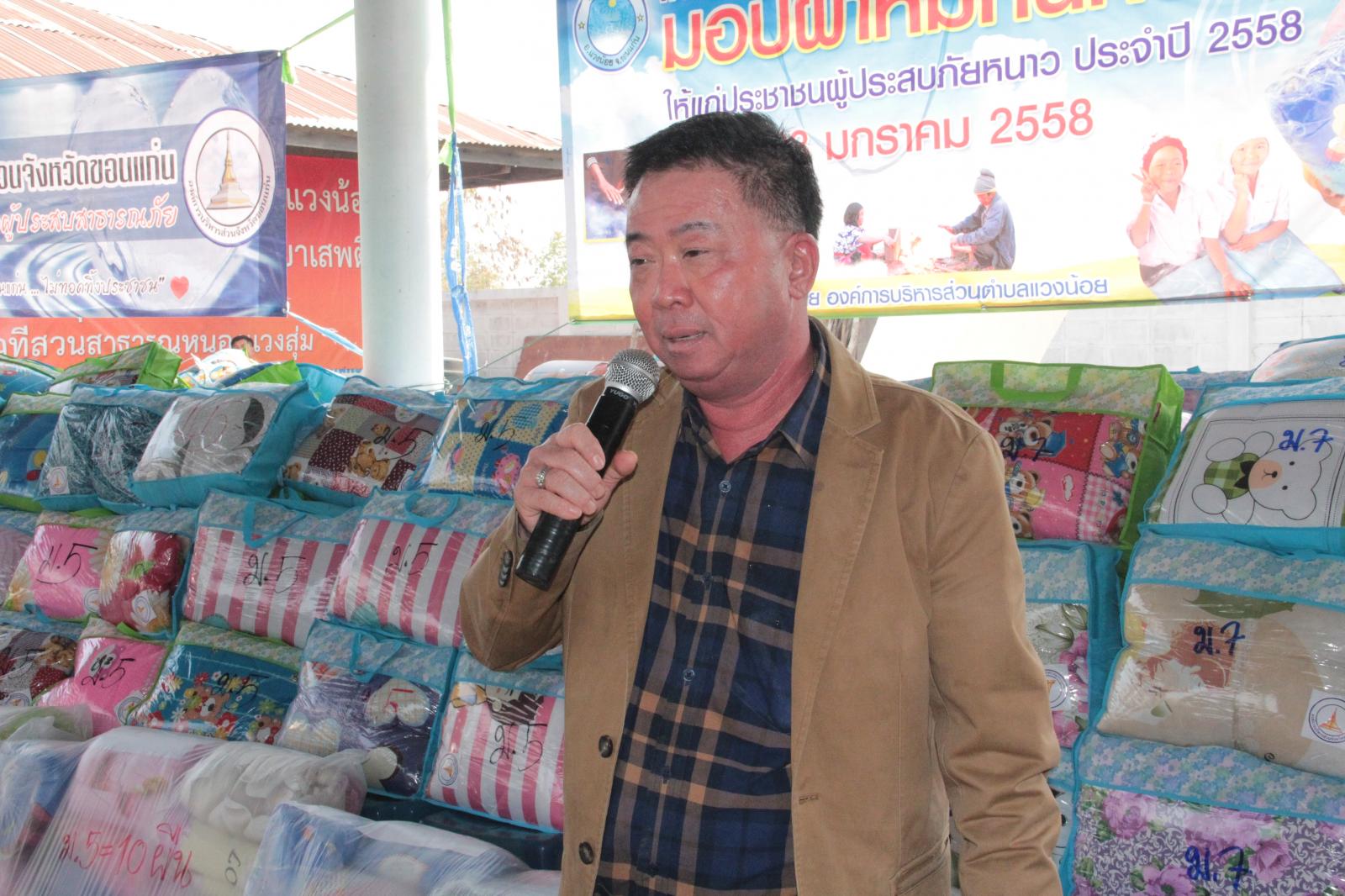 เมื่อวันที่ 28 มกราคม 2558 ณ องค์การบริหารส่วนตำบลแวงน้อย อำเภอแวงน้อย จังหวัดขอนแก่น ดร.พงษ์ศักดิ์ ตั้งวานิชกพงษ์ นายกองค์การบริหารส่วนจังหวัดขอนแก่น นายธาดา พรหมสาขา ณ สกลนคร รองปลัด อบจ.ขอนแก่น ได้มอบผ้าห่มกันหนาวจำนวน 400 ผืน ให้กับราษฎรชาวตำบลแวงน้อย อำเภอแวงน้อย ที่กำลังประสบภัยหนาวอยู่ในขณะนี้เพื่อเป็นการบรรเทาความเดือดร้อนเบื้องต้น โดยมี คณะผู้บริหาร สมาชิกสภาตำบล ที่ปรึกษา เลขานุการ ประธานสภา กำนัน ผู้ใหญ่บ้าน ผู้นำชุมชน และประชาชน ร่วมในพิธีเป็นจำนวนมาก